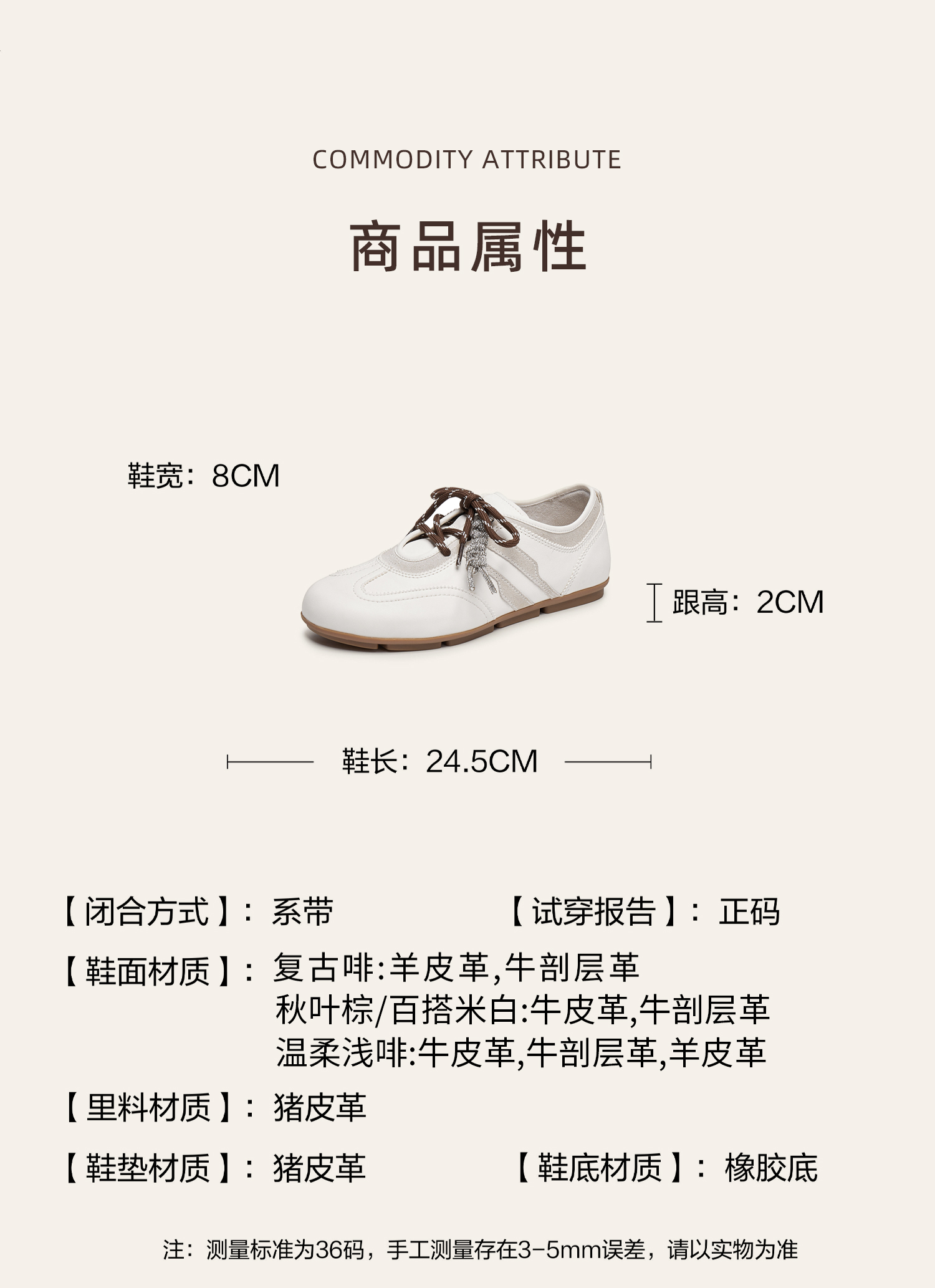 | 闭合方式:系带 | 风格:时尚潮流 | 跟高数值:2CM | 色系:棕色 | 适用人群:成人 |