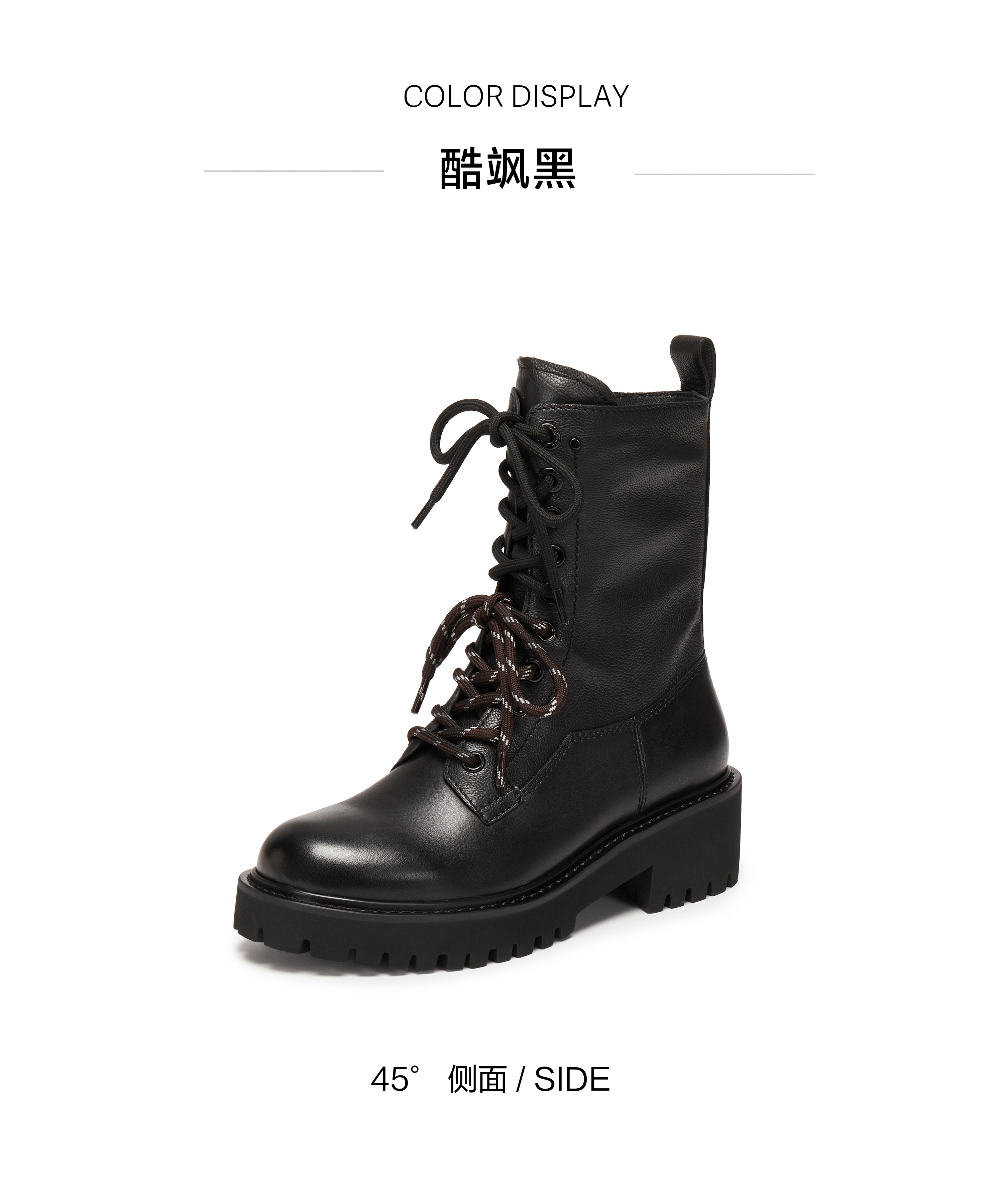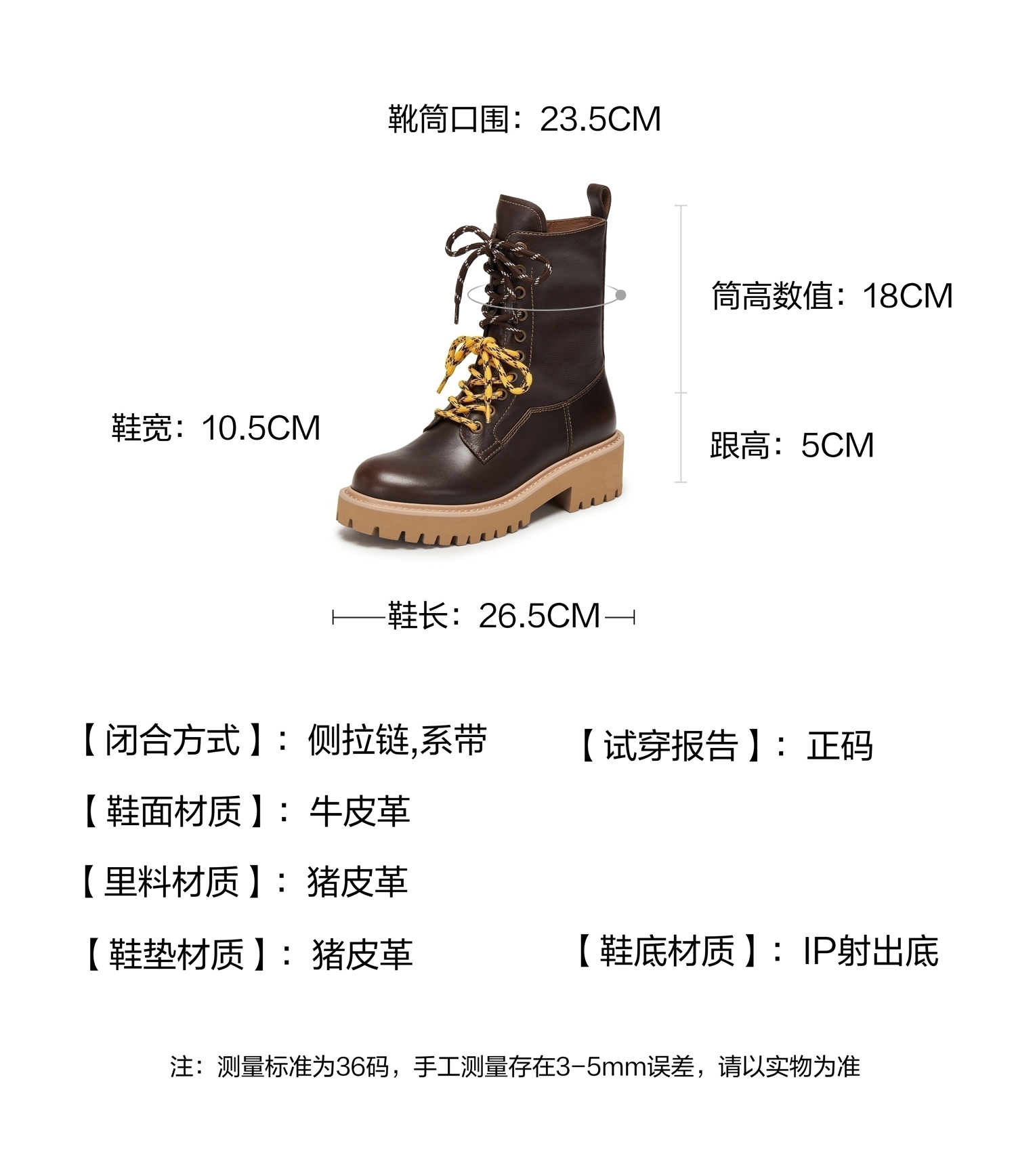| 鞋底材质:IP射出底 | 靴筒内里材质:猪皮革 | 内增高:无 | 鞋面材质:牛皮革 | 闭合方式:系带侧拉链 |