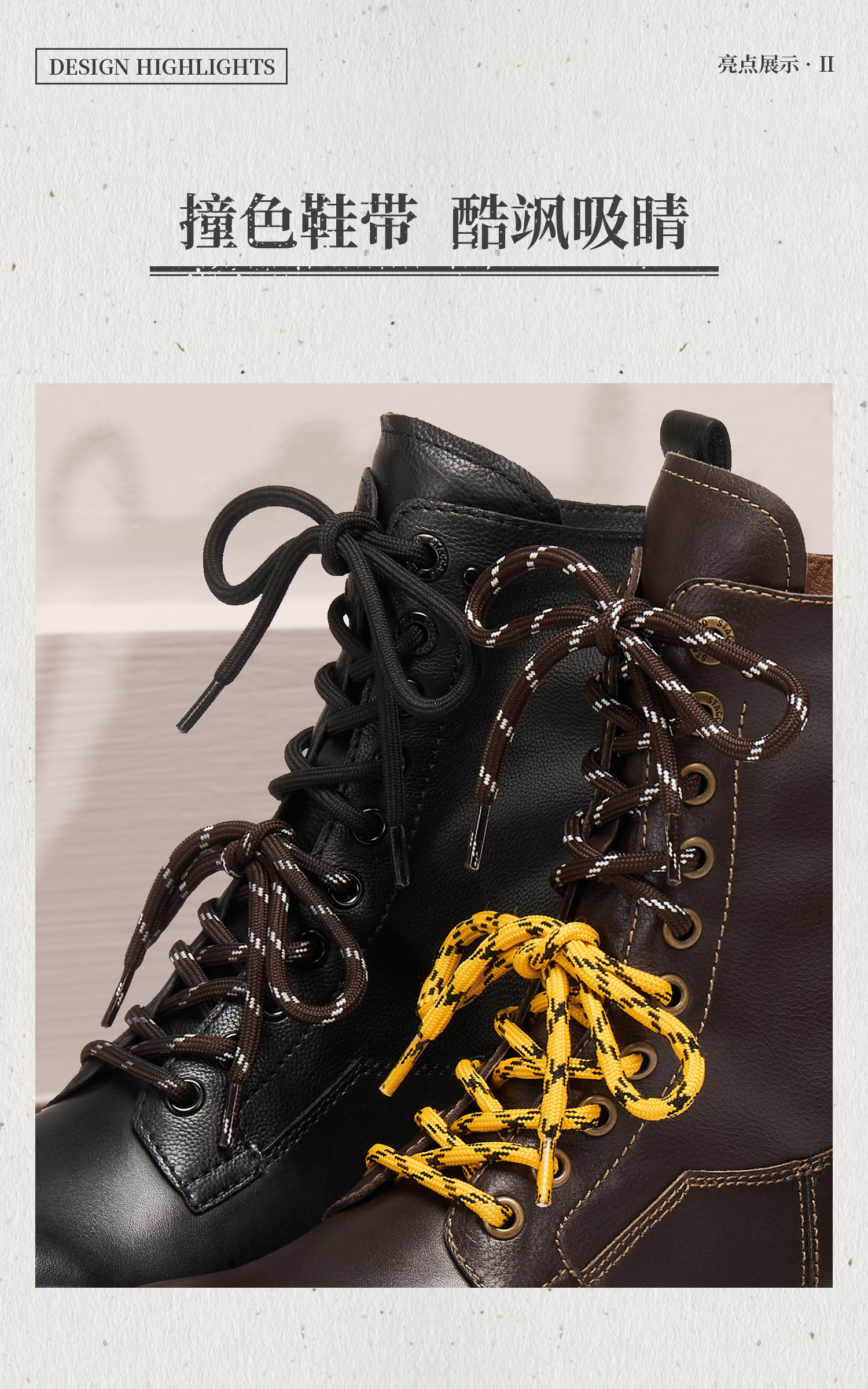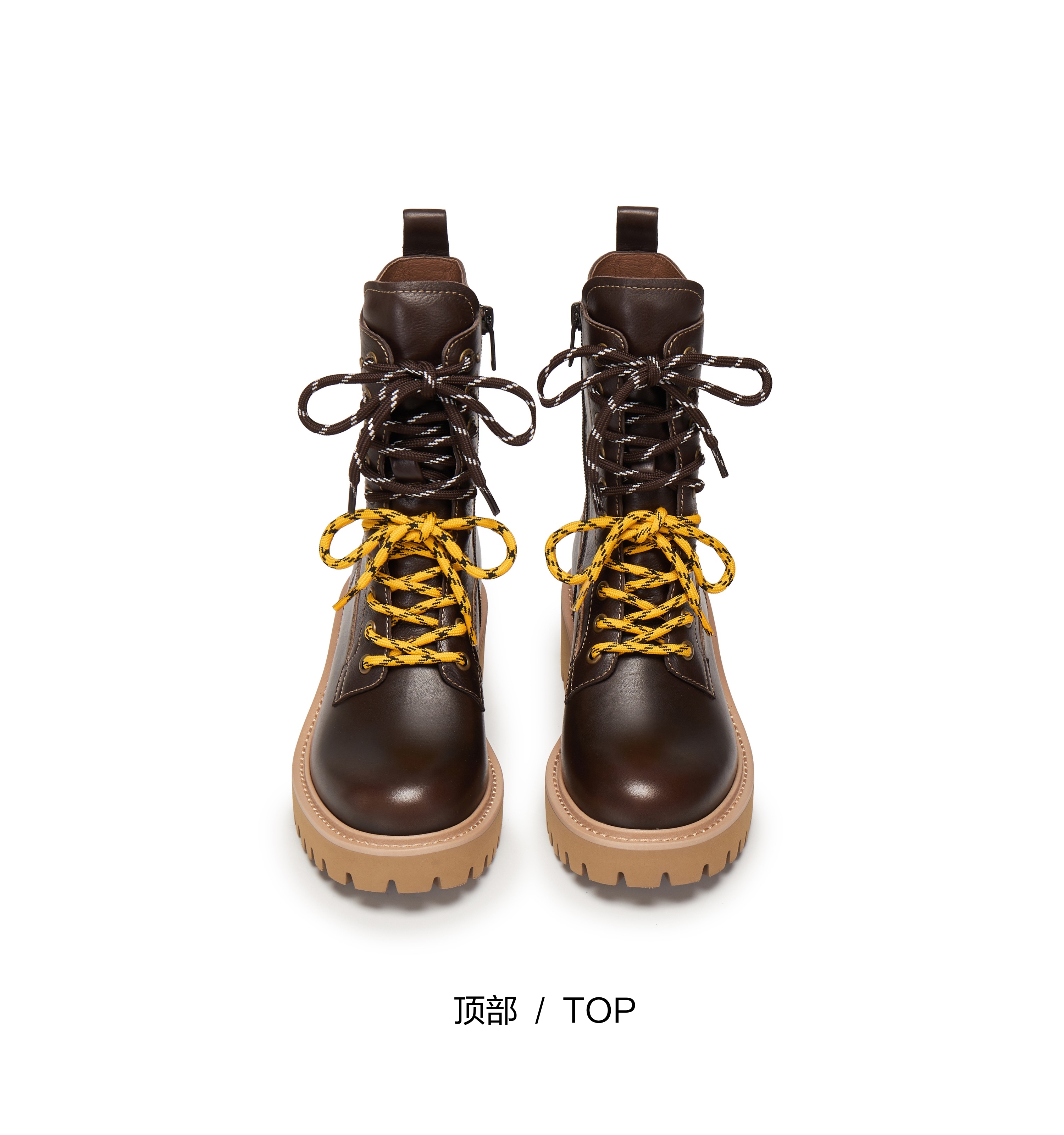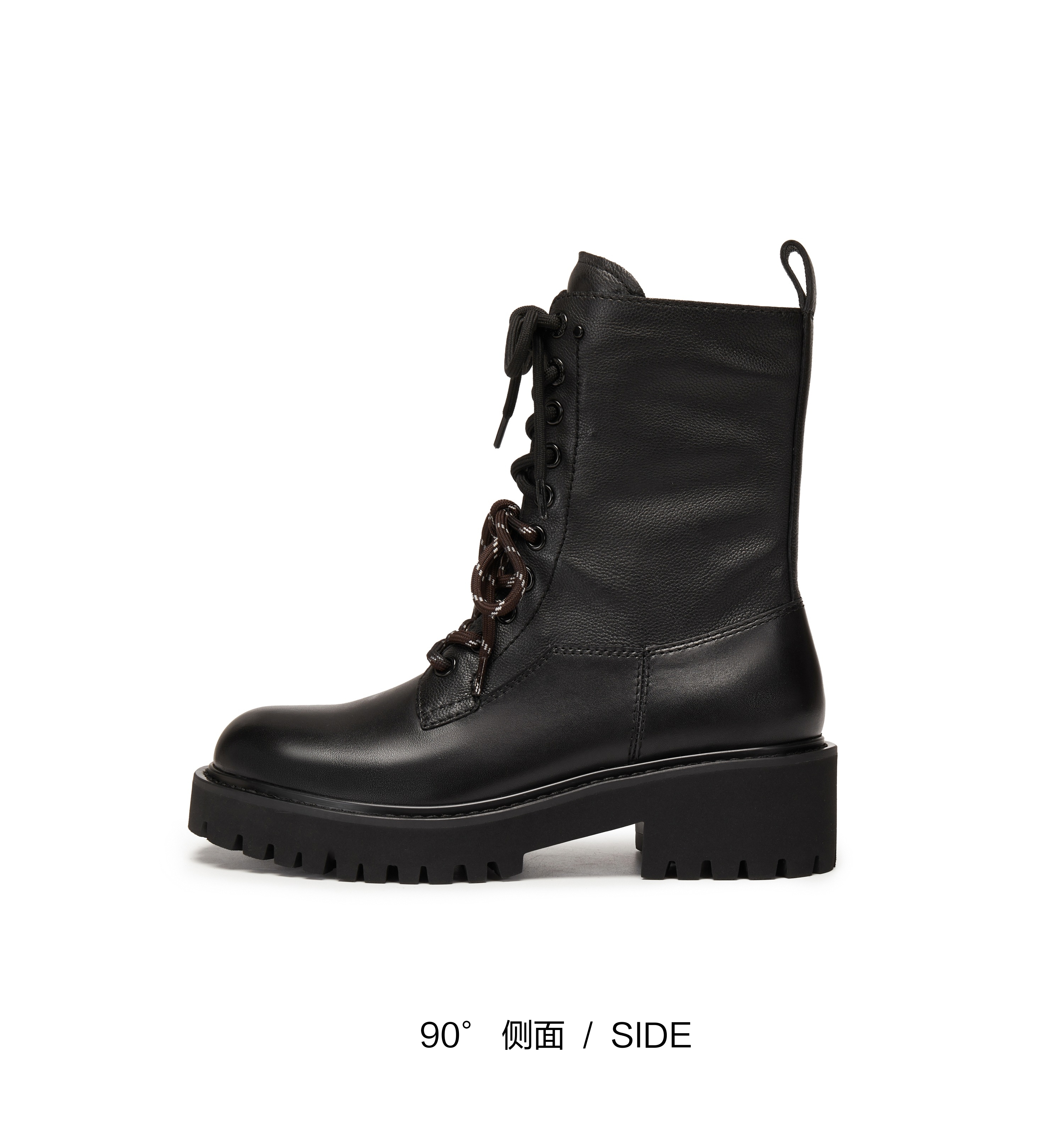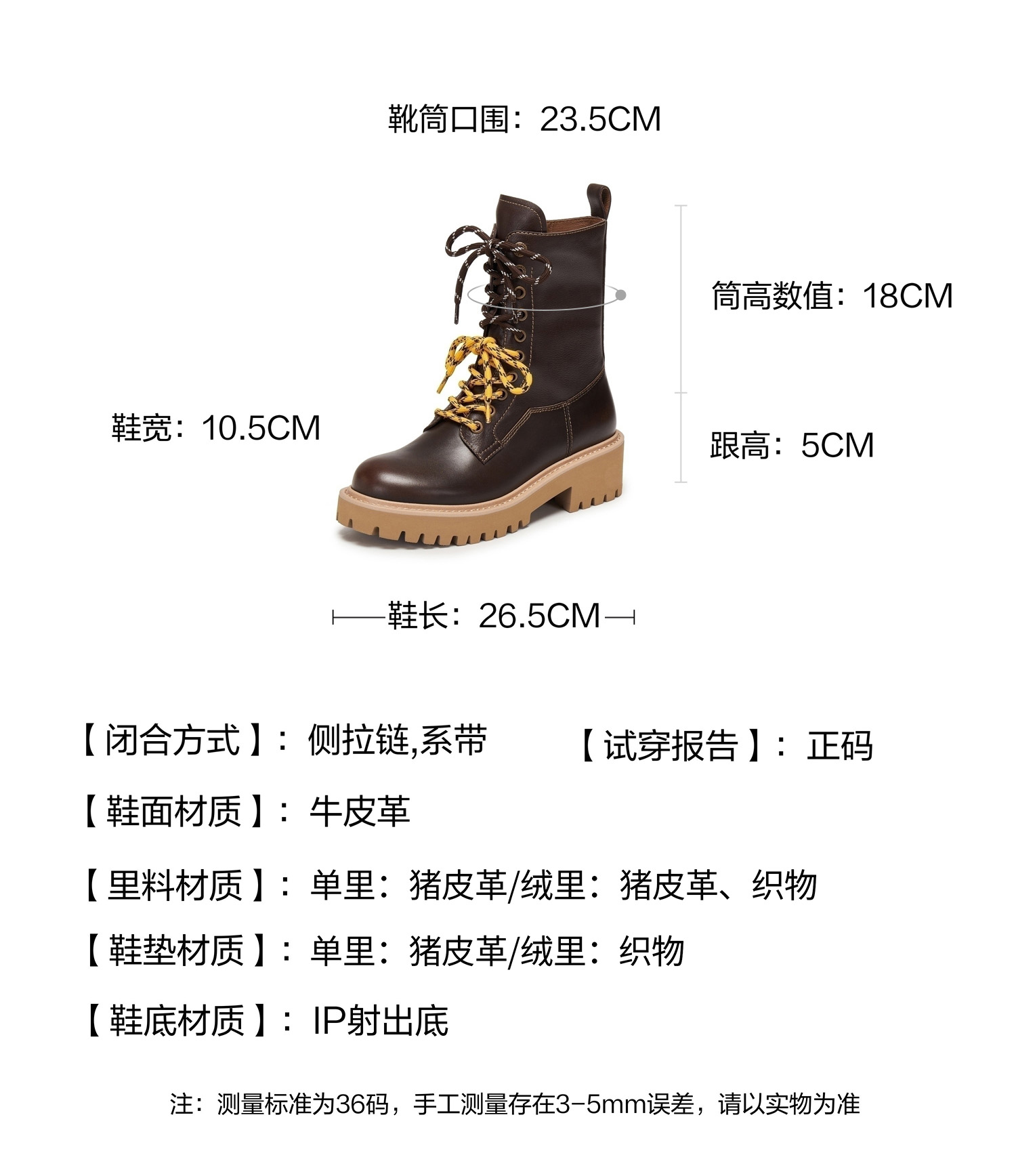 | 鞋底材质:IP射出底 | 靴筒内里材质:织物猪皮革 | 内增高:无 | 鞋面材质:牛皮革 | 闭合方式:系带侧拉链 |