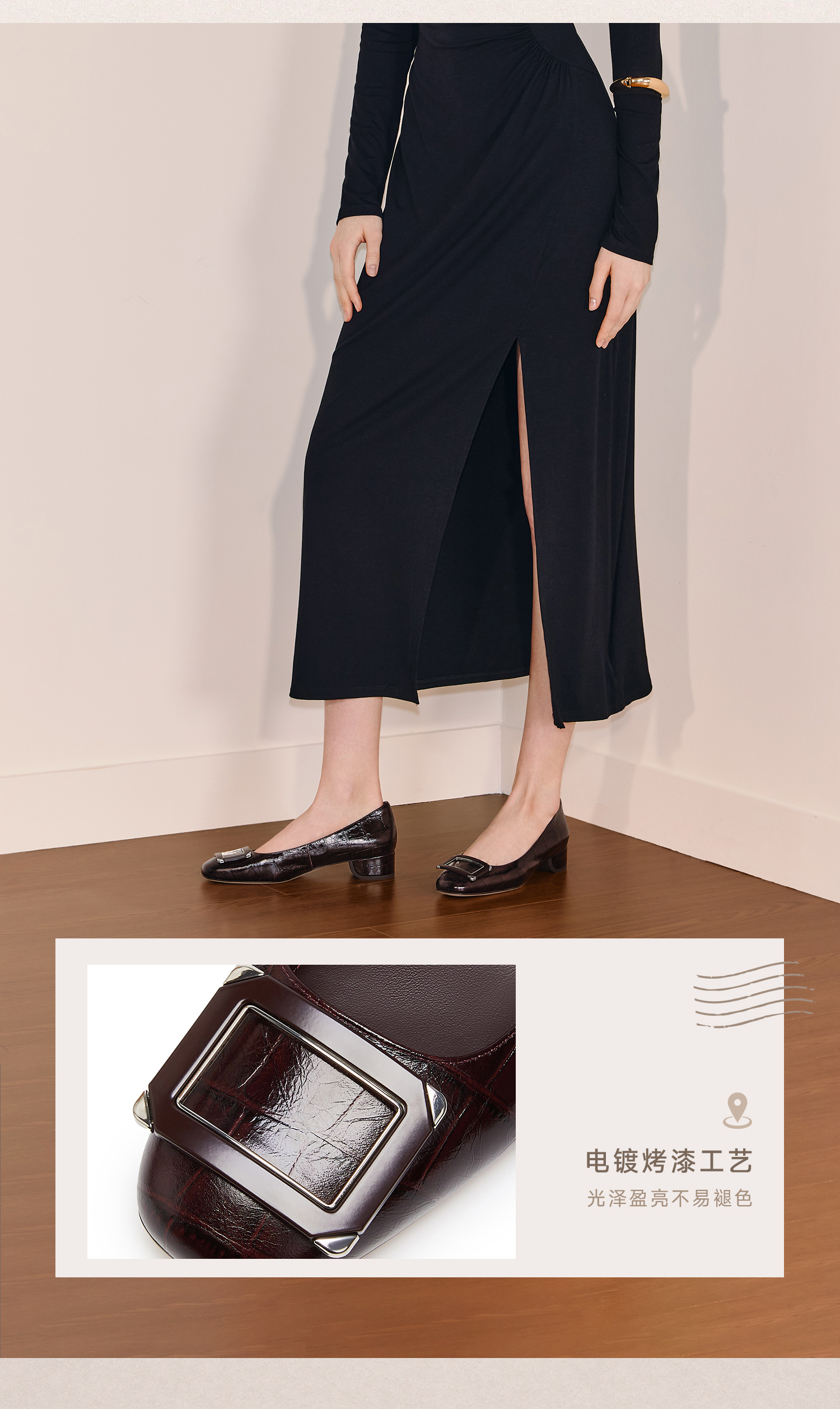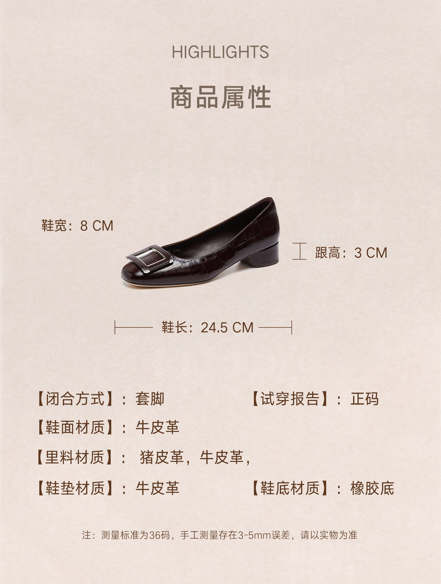 | 鞋面材质:牛皮革 | 流行元素:饰扣 | 参考鞋长(女):24.5CM | 参考鞋宽(女):8CM | 闭合方式:套脚 |