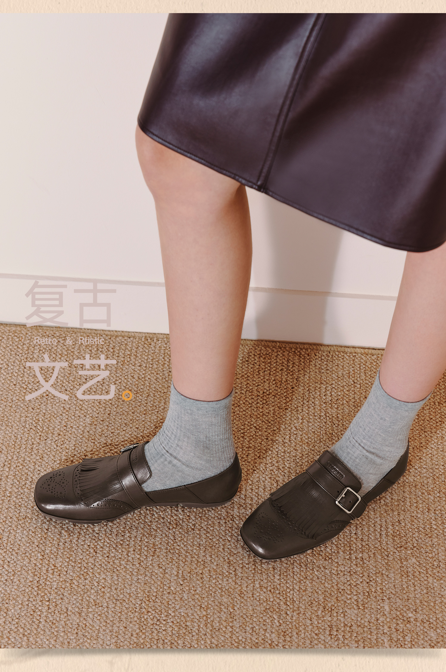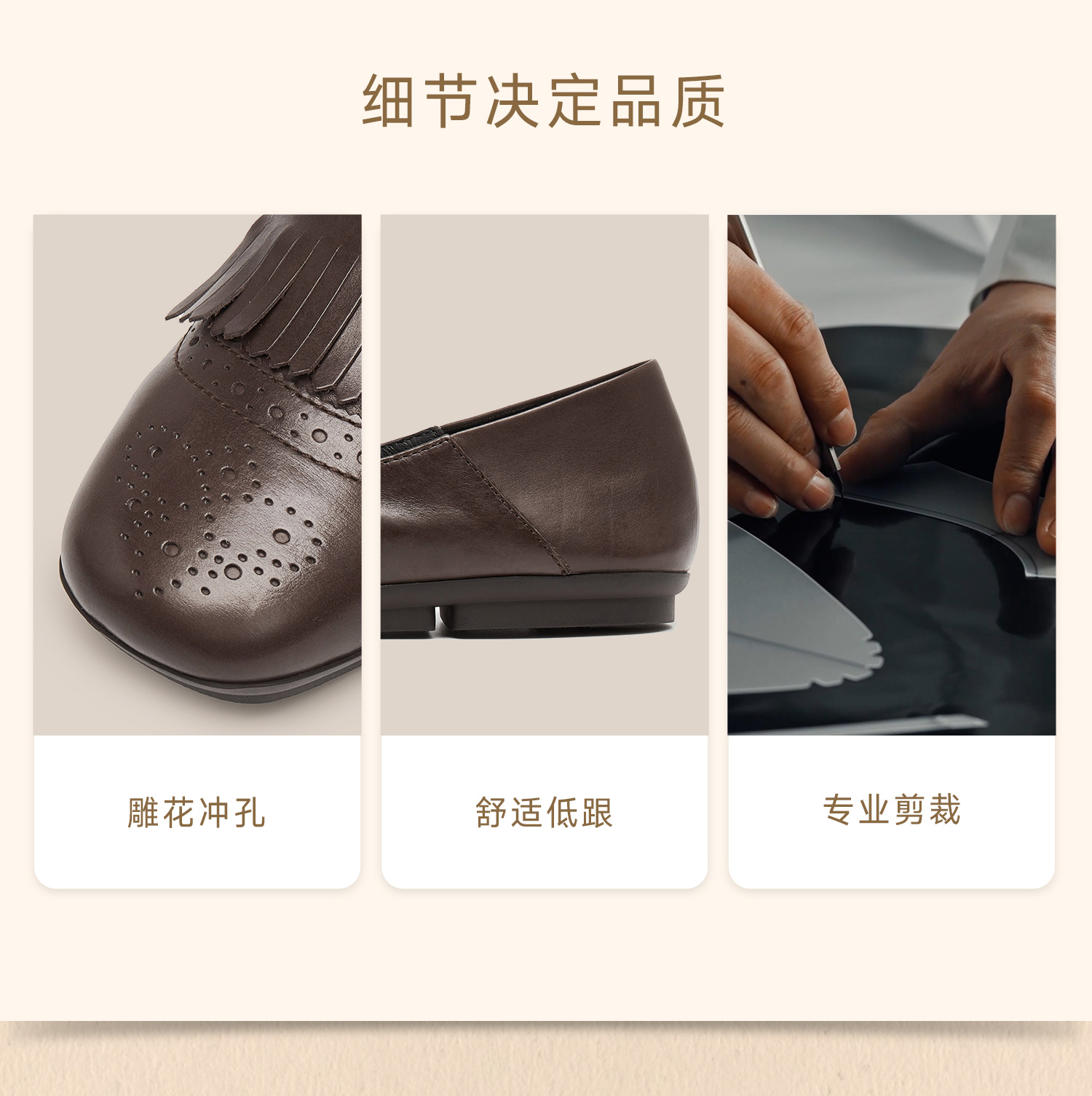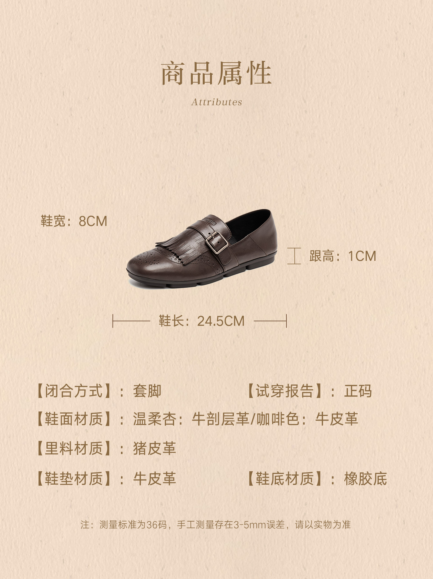| 鞋跟形状:平底 | 鞋面材质:牛剖层革 | 流行元素:流苏 | 参考鞋长(女):24.5CM | 参考鞋宽(女):8CM |