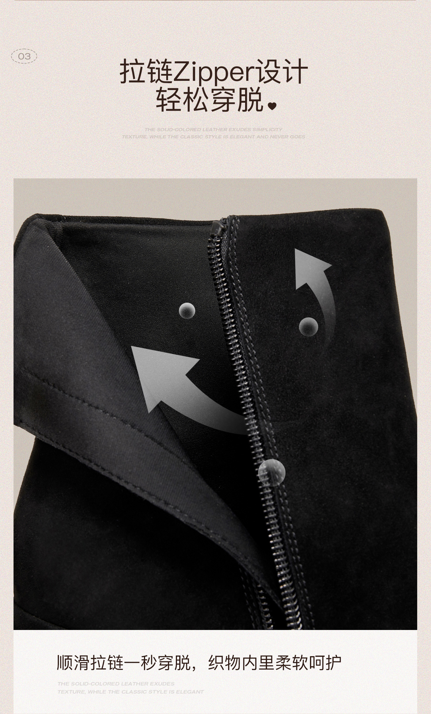 | 鞋底材质:橡胶底 | 靴筒内里材质:织物 | 内增高:无 | 鞋面材质:羊皮革 | 闭合方式:侧拉链 |
