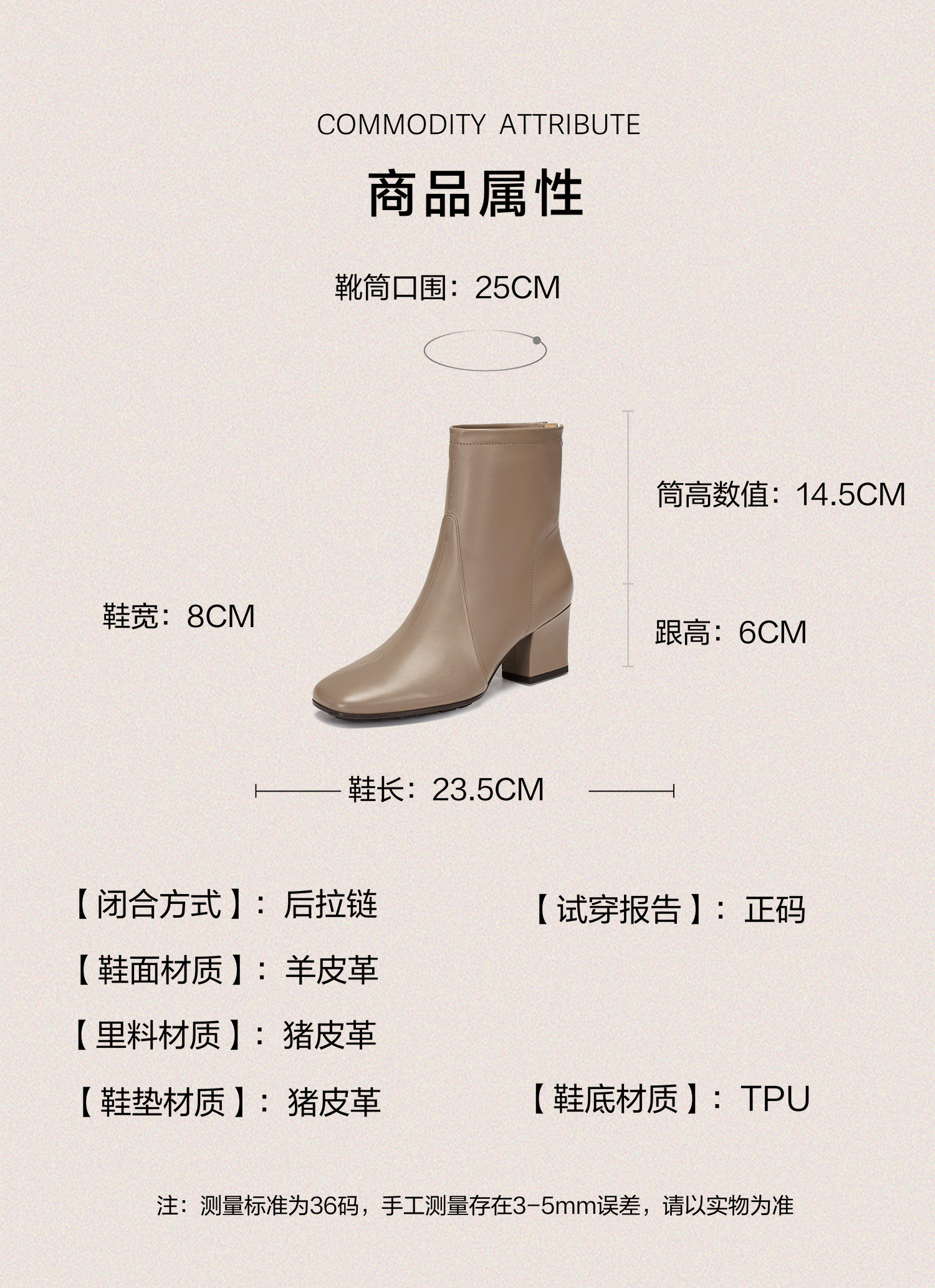 | 鞋底材质:TPU | 靴筒内里材质:猪皮革 | 内增高:无 | 鞋面材质:羊皮革 | 闭合方式:后拉链 |