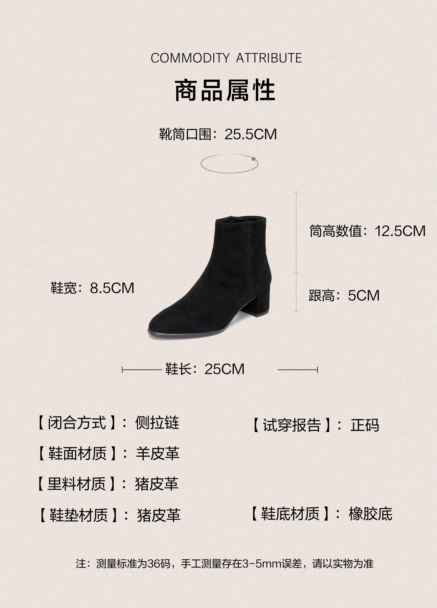 | 鞋底材质:TPU | 靴筒内里材质:猪皮革织物 | 内增高:无 | 鞋面材质:羊皮革 | 闭合方式:侧拉链 |