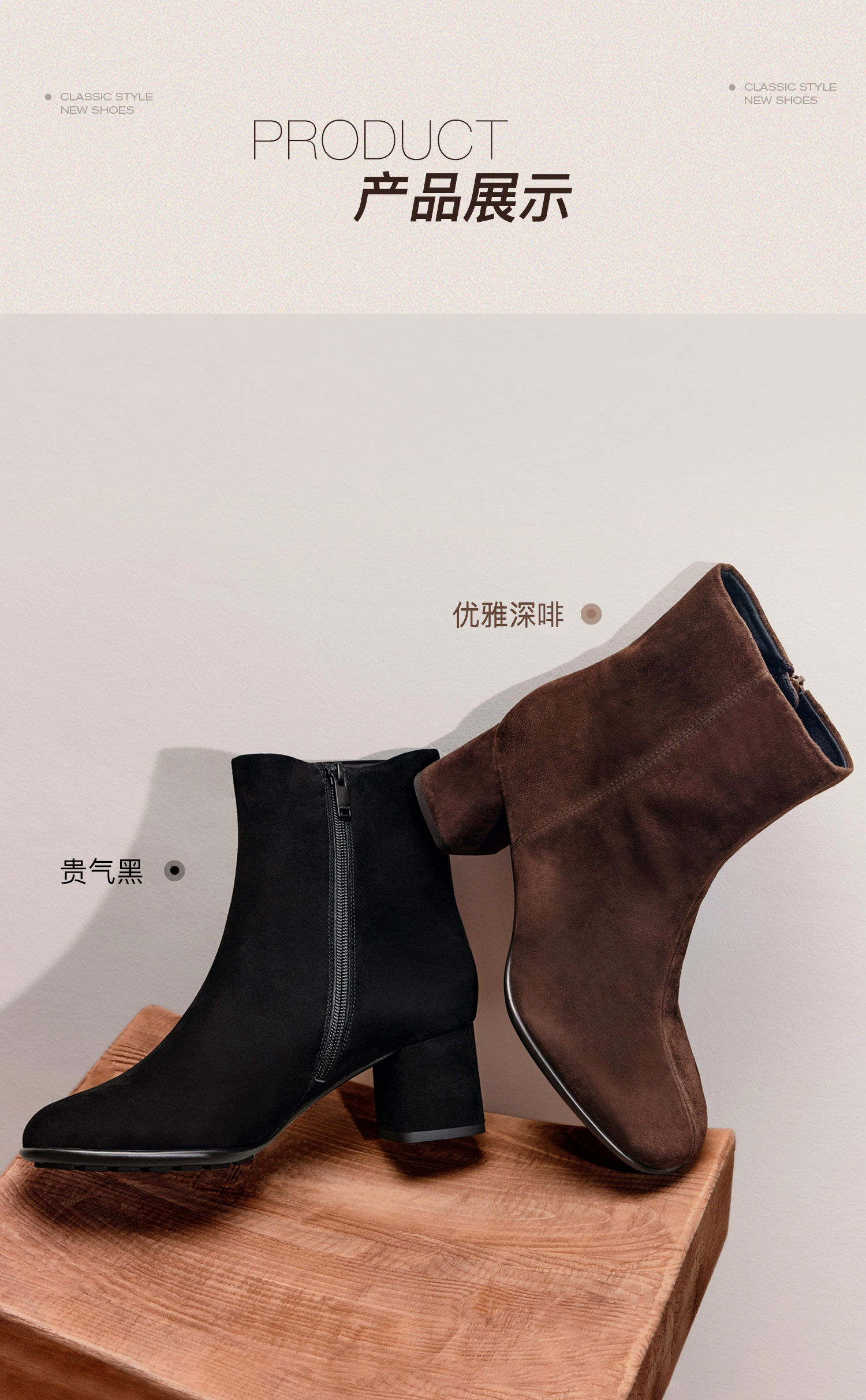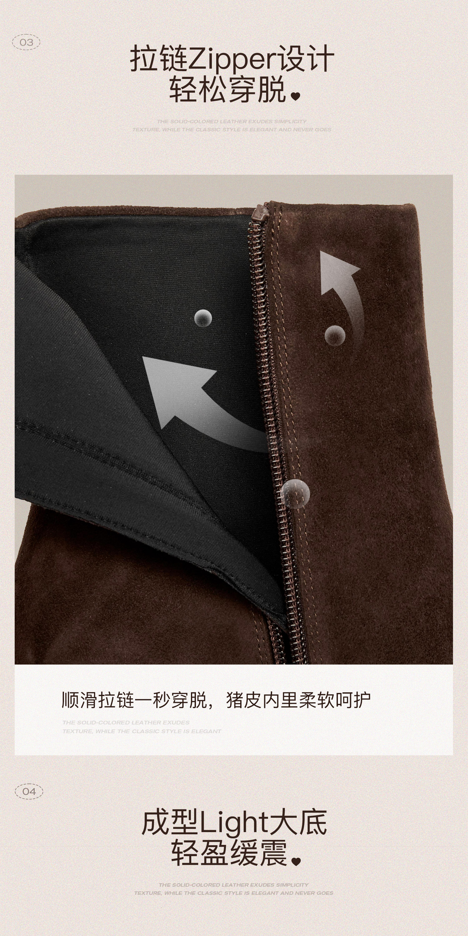 | 鞋底材质:TPU | 靴筒内里材质:织物猪皮革 | 内增高:无 | 鞋面材质:羊皮革 | 闭合方式:侧拉链 |