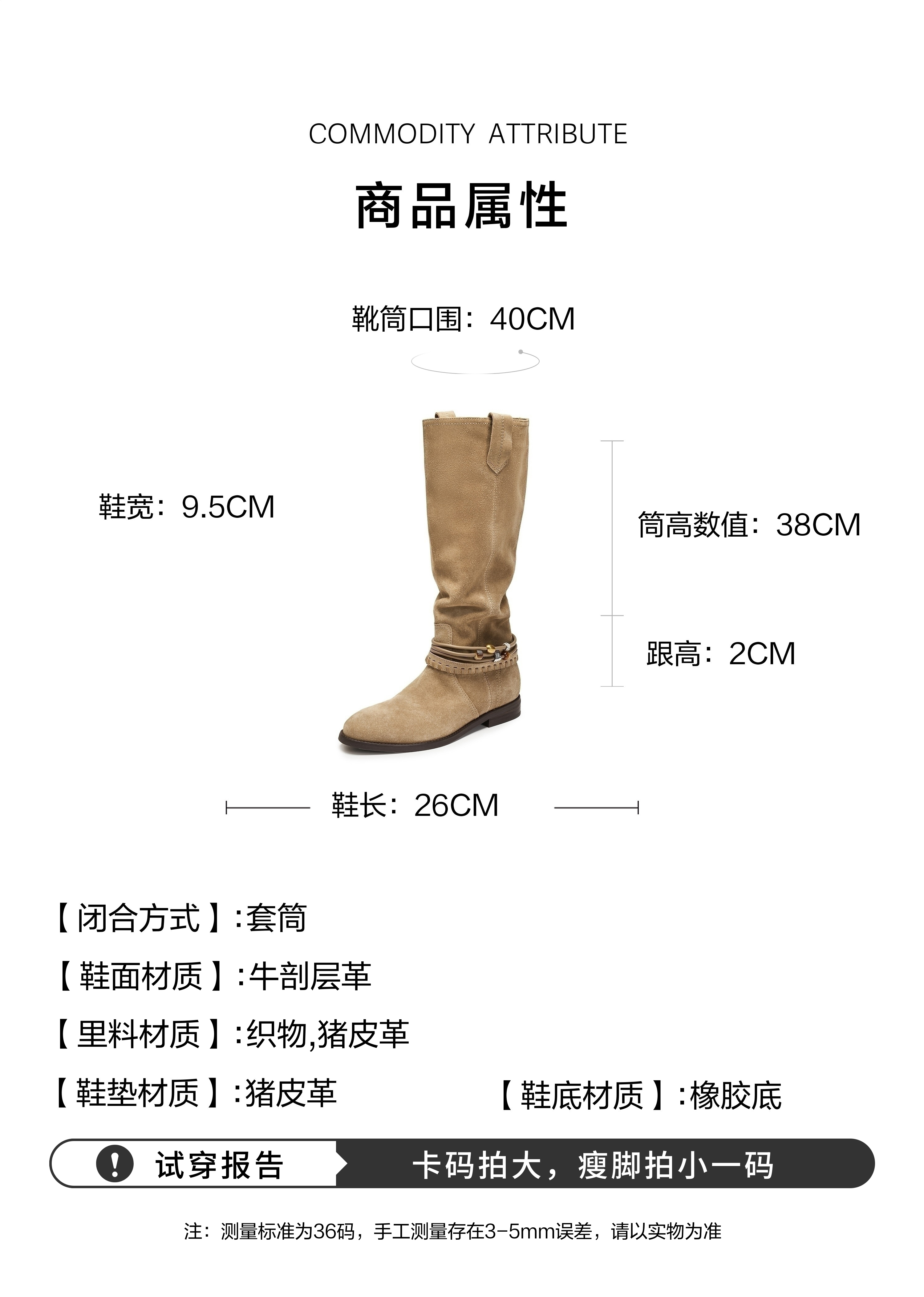 | 筒高数值:38CM | 靴筒筒面材质:牛剖层革 | 靴筒小腿围:31CM | 里料材质:猪皮革织物 | 制鞋工艺:胶贴皮鞋 |