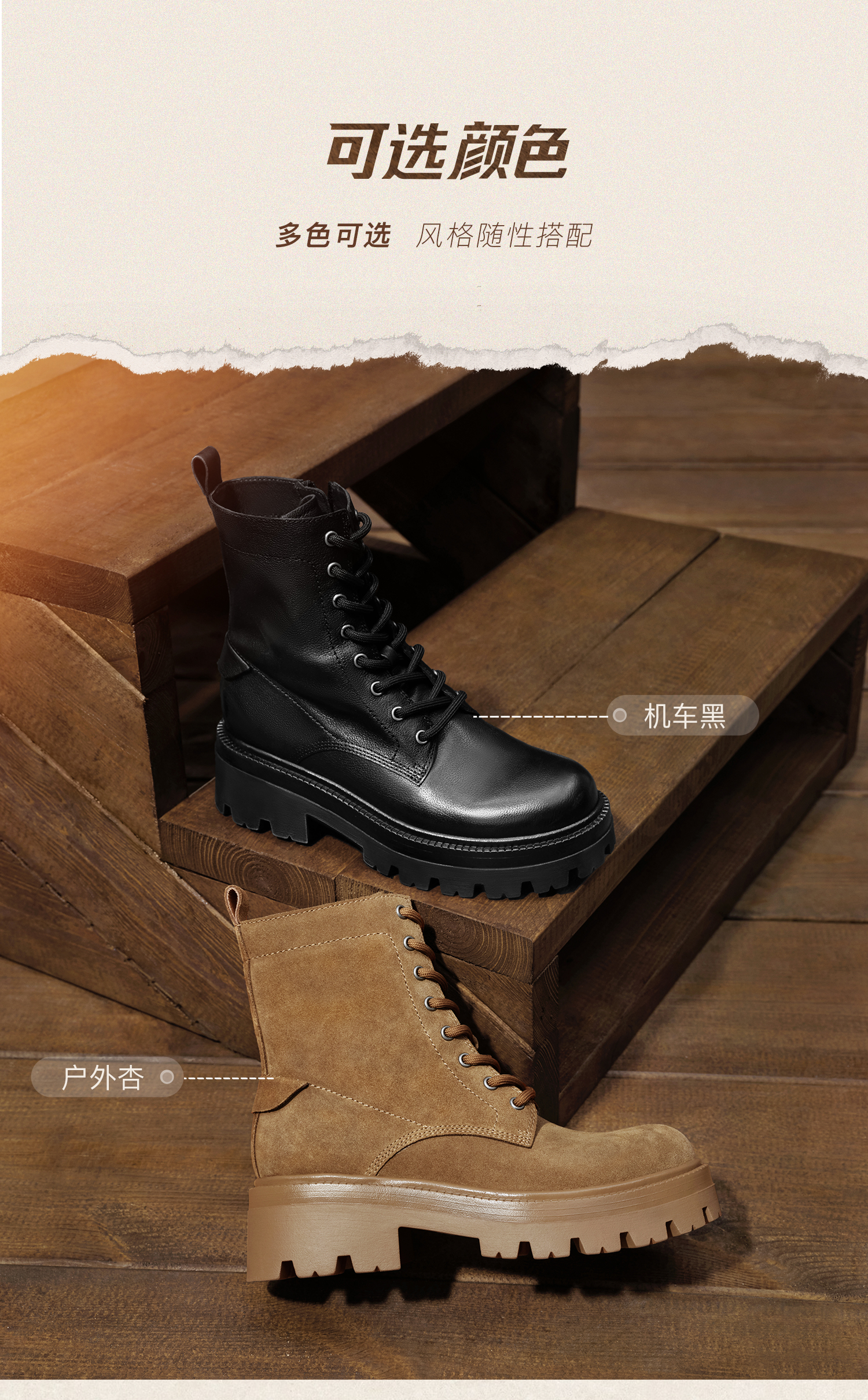 | 鞋底材质:TPR | 靴筒内里材质:猪皮革 | 内增高:无 | 鞋面材质:牛皮革 | 闭合方式:系带侧拉链 |