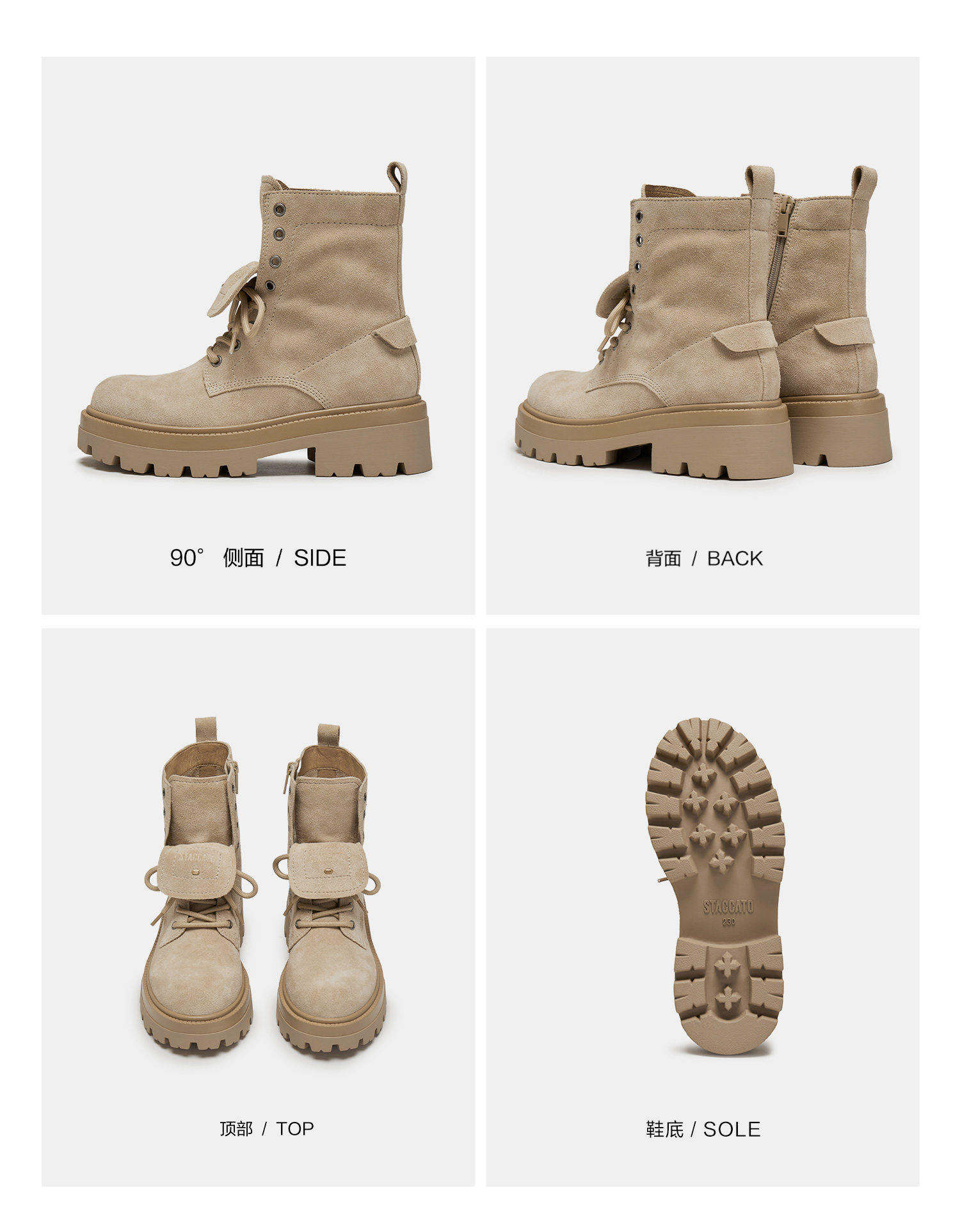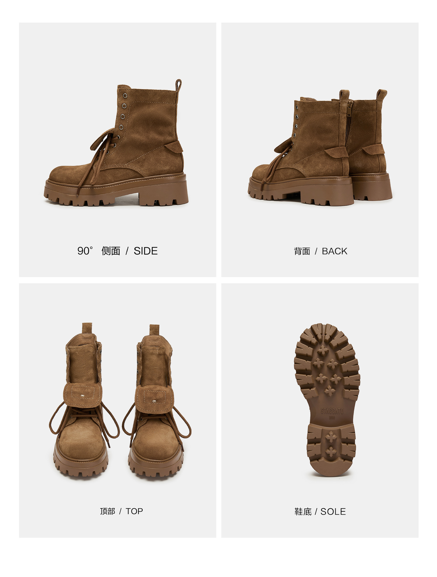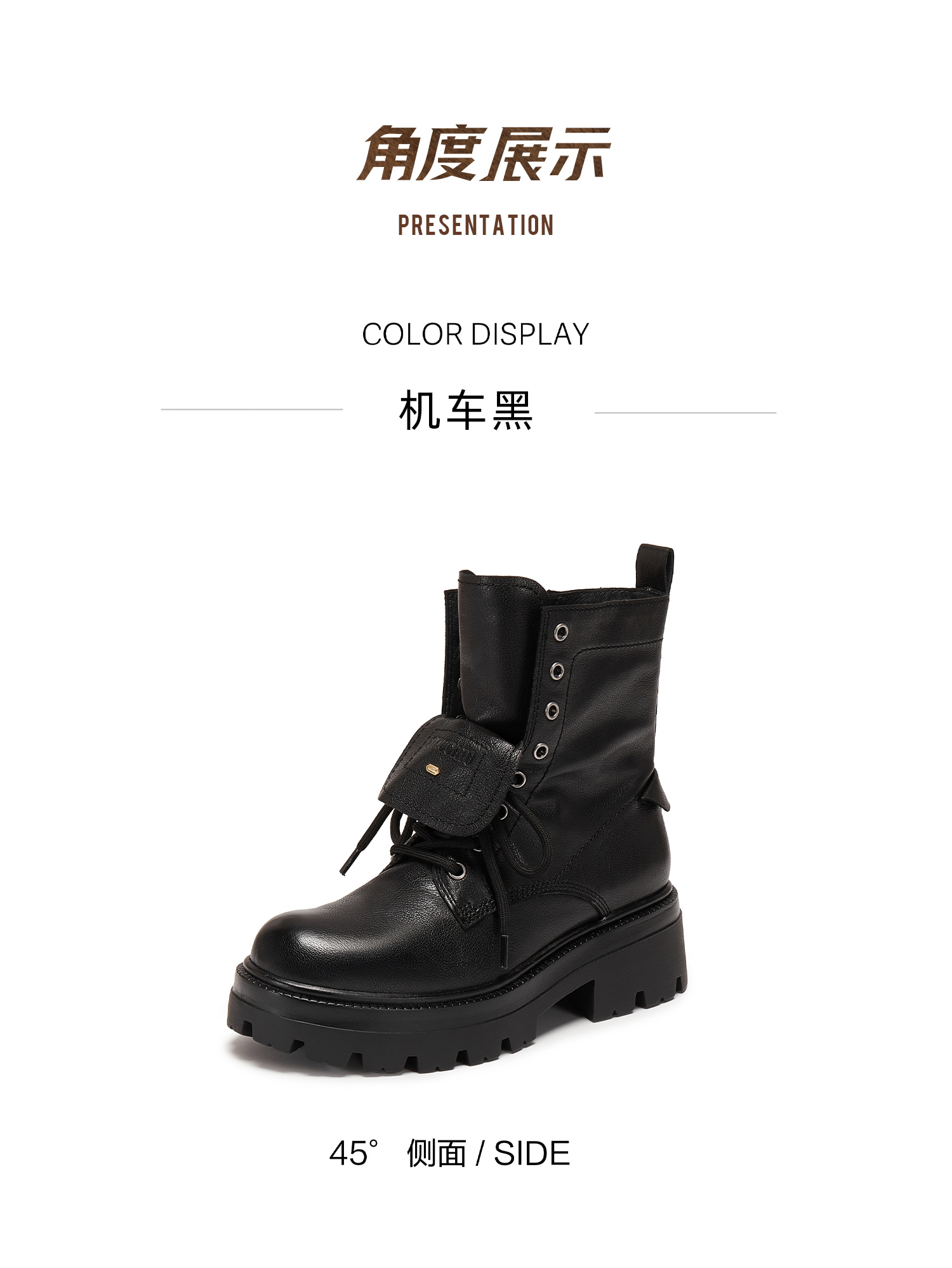 | 鞋底材质:TPR | 靴筒内里材质:猪皮革 | 内增高:无 | 鞋面材质:牛皮革 | 闭合方式:系带侧拉链 |