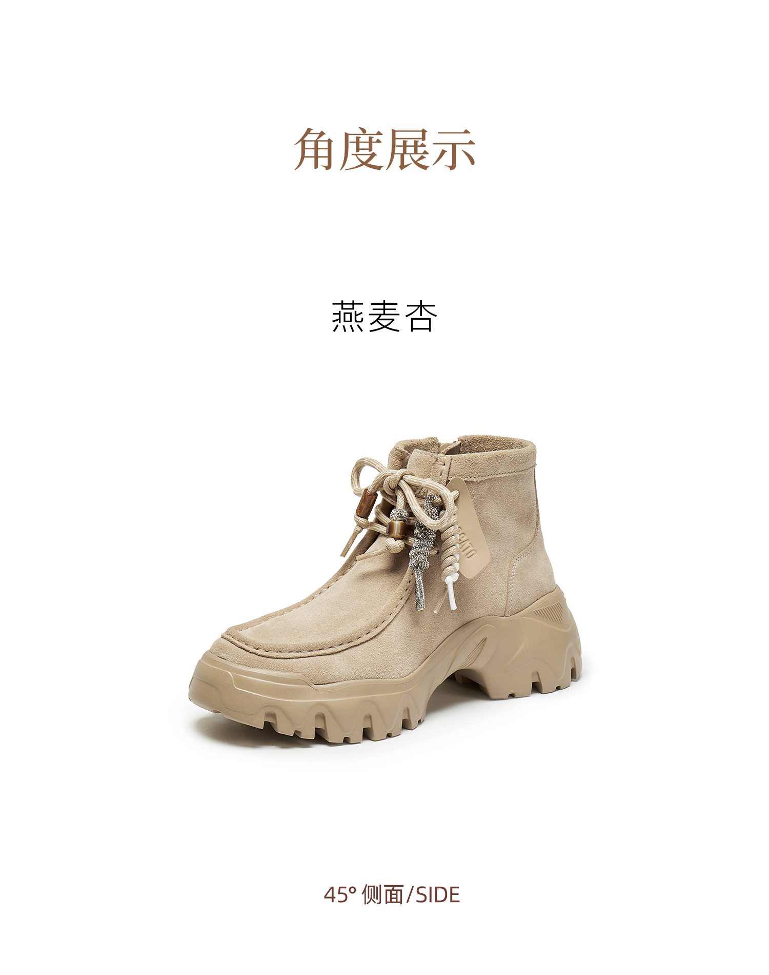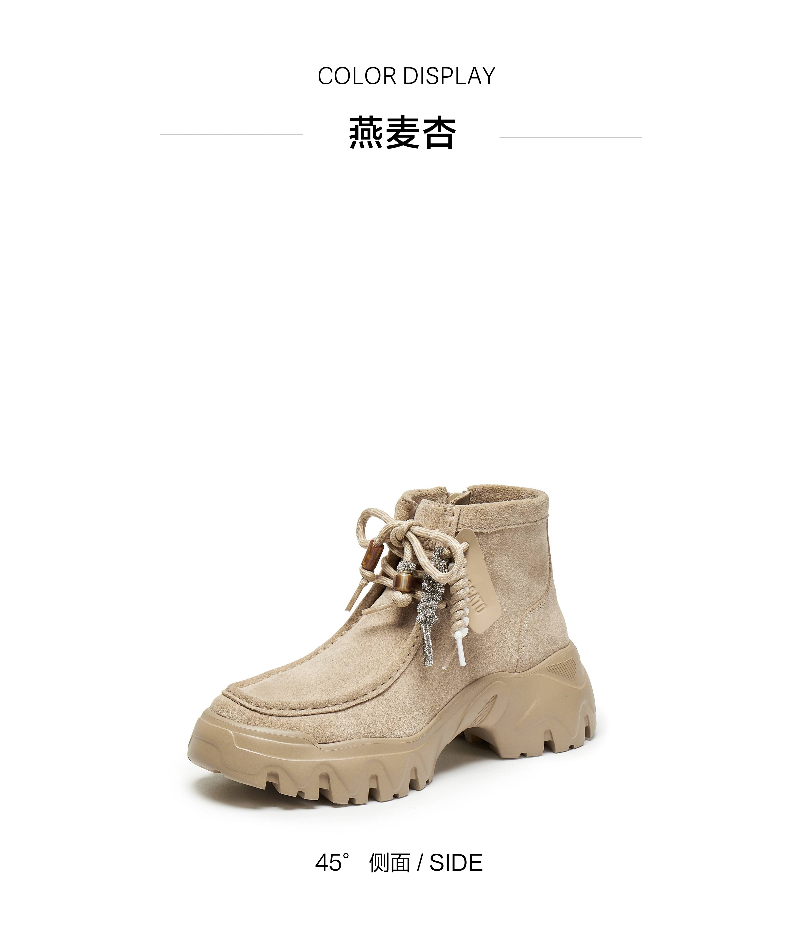 | 鞋底材质:IP射出底 | 靴筒内里材质:织物猪皮革 | 内增高:无 | 鞋面材质:牛剖层革 | 闭合方式:侧拉链系带 |