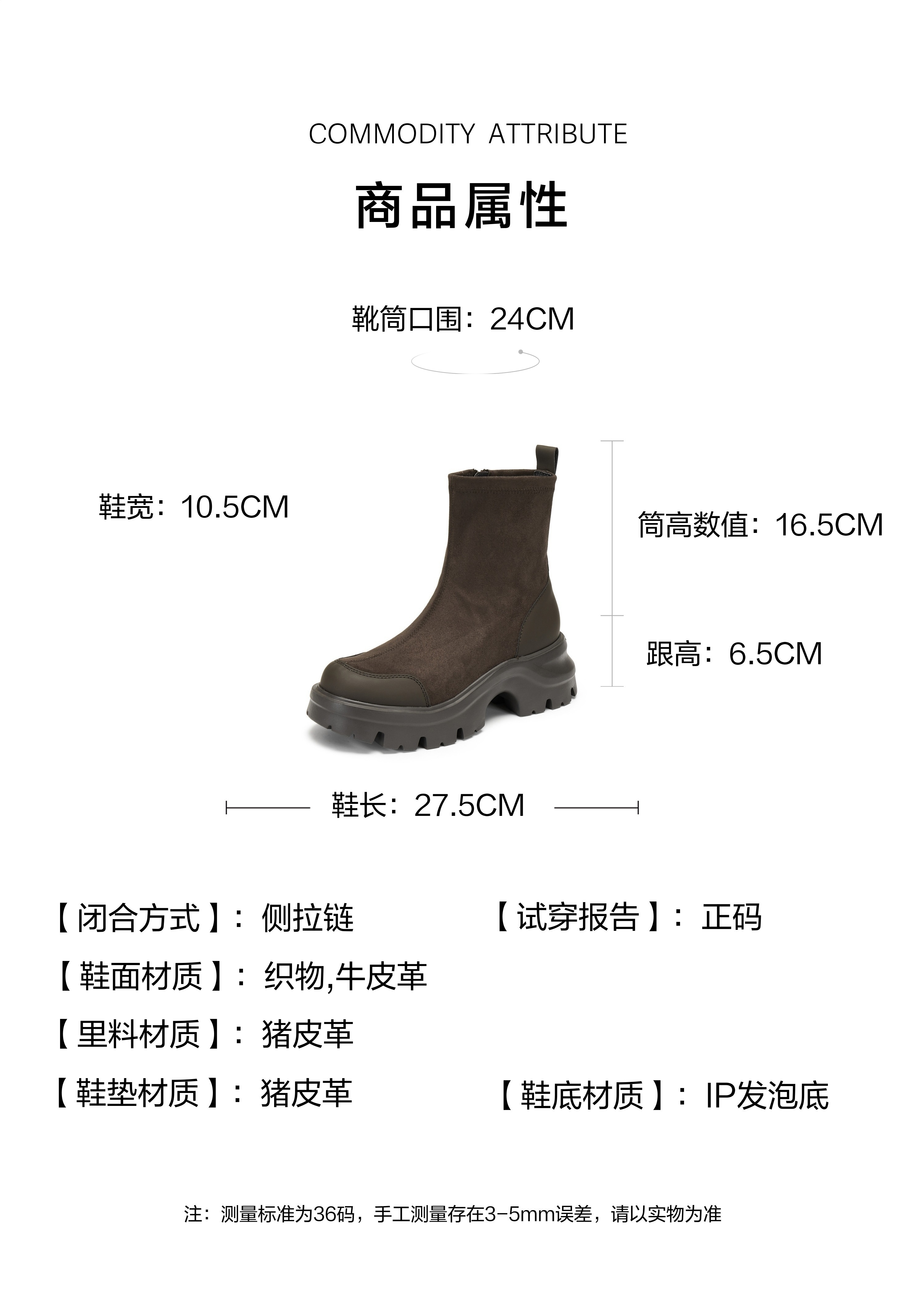 | 鞋底材质:IP发泡底 | 靴筒内里材质:猪皮革 | 内增高:无 | 鞋面材质:牛皮革织物 | 闭合方式:侧拉链 |