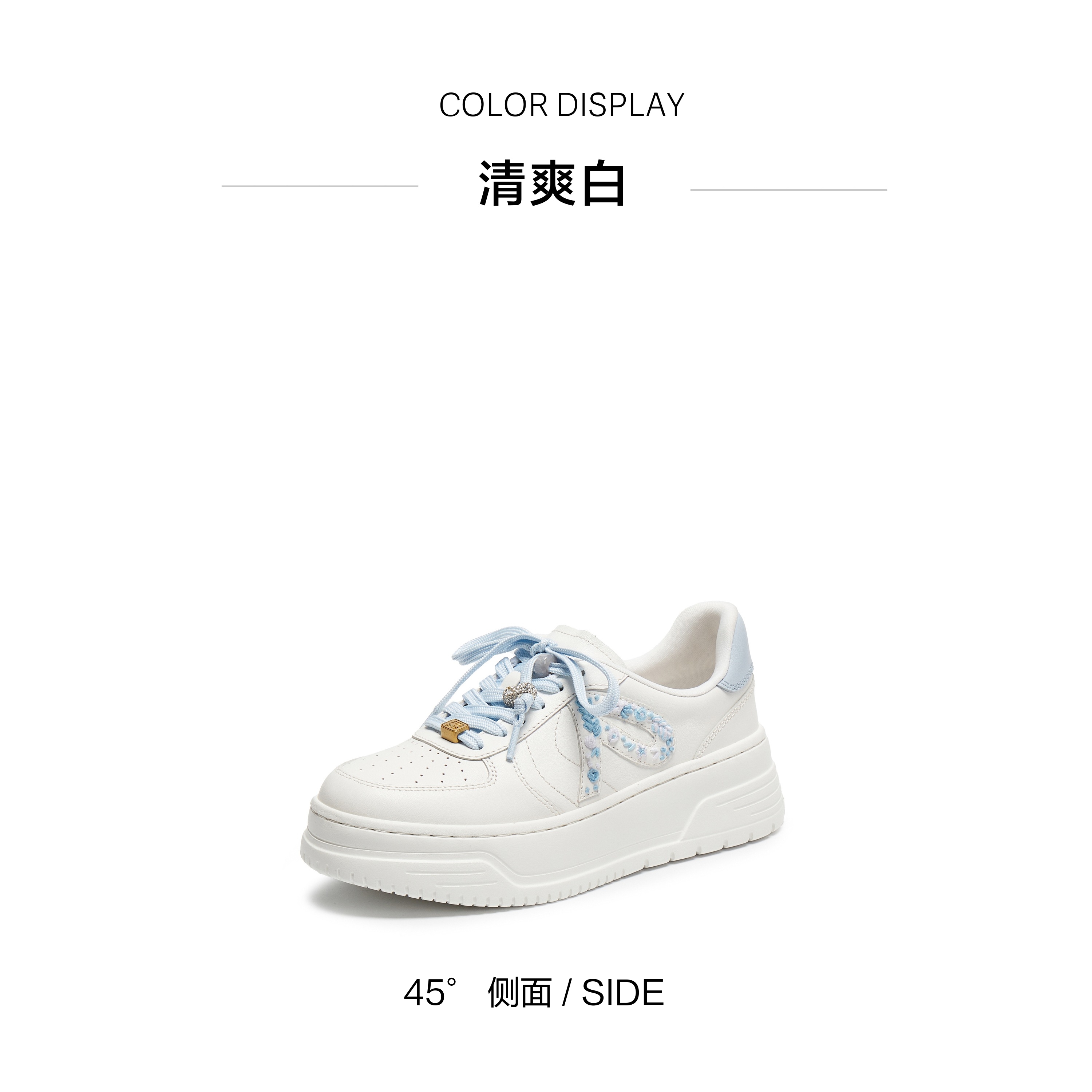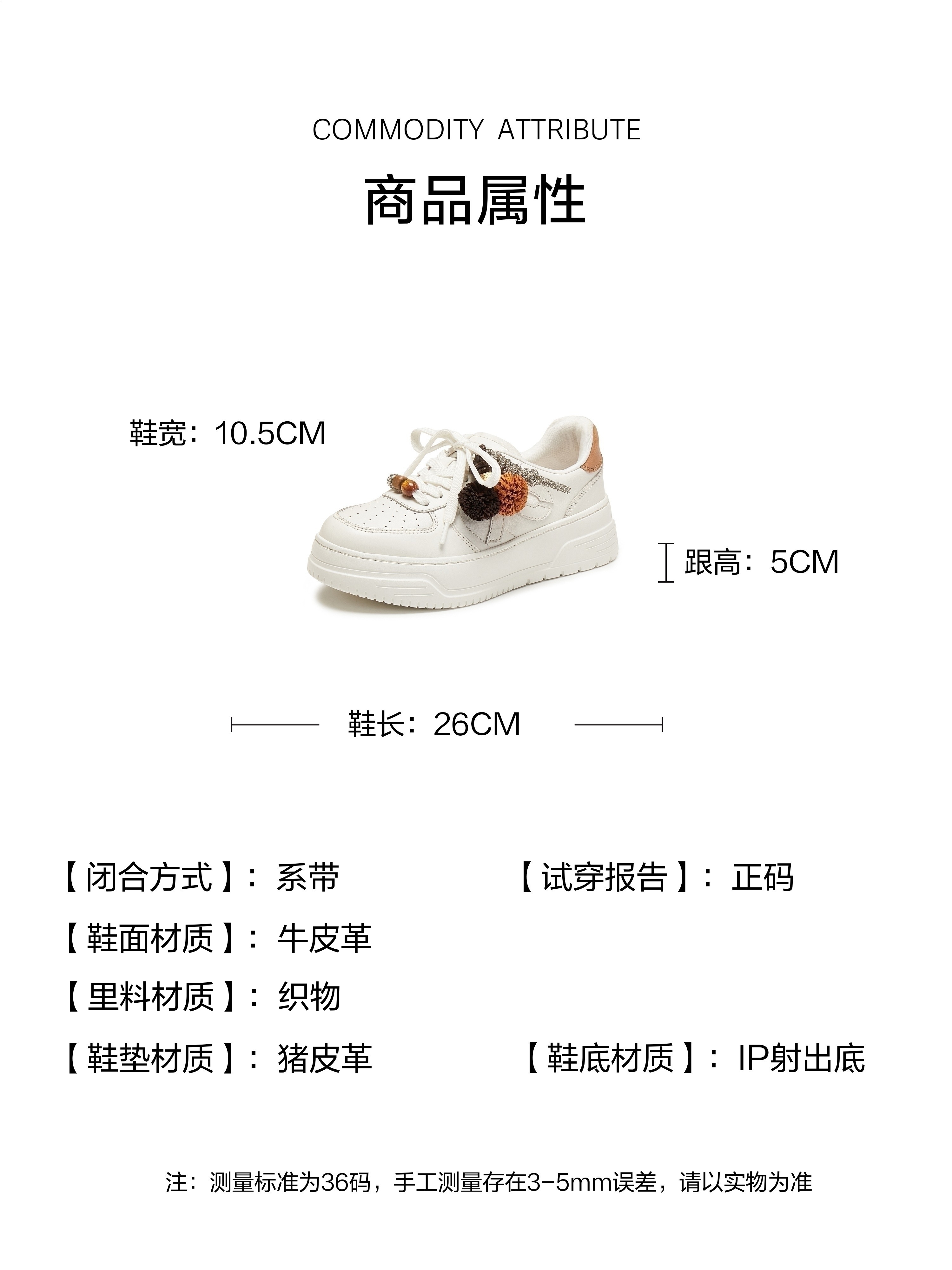 | 闭合方式:系带 | 风格:时尚潮流 | 色系:白色 | 跟高数值:5CM | 适用人群:成人 |