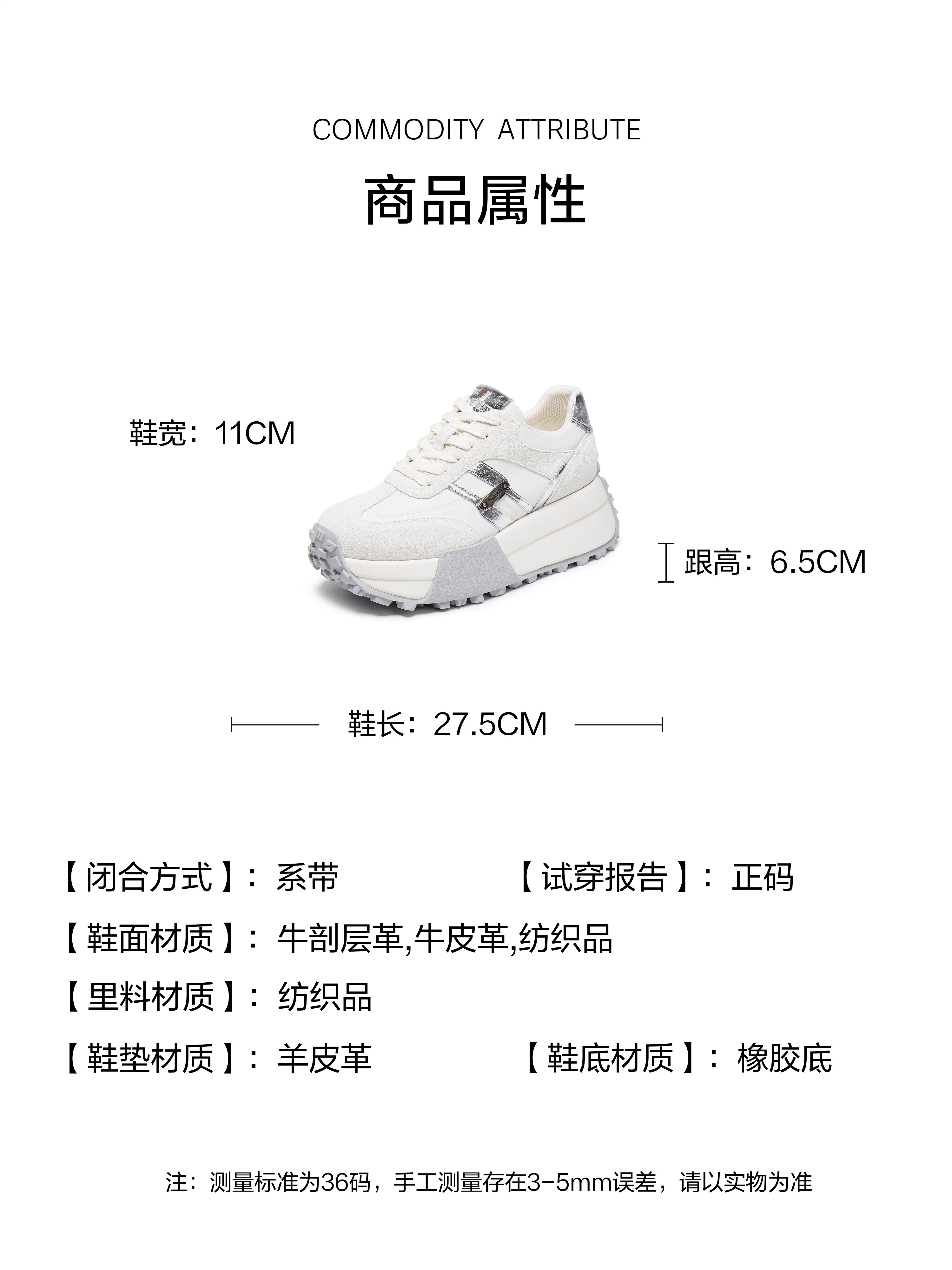 | 闭合方式:系带 | 风格:时尚潮流 | 色系:白色 | 跟高数值:6.5CM | 配跟:无 |