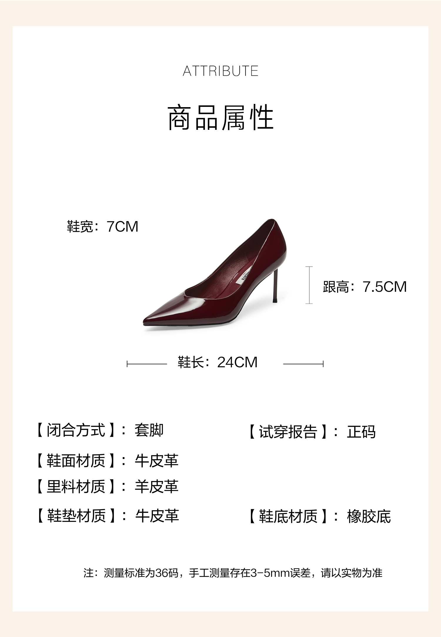 | 鞋面材质:牛皮革 | 流行元素:纯色 | 参考鞋长(女):24CM | 参考鞋宽(女):7CM | 闭合方式:套脚 |