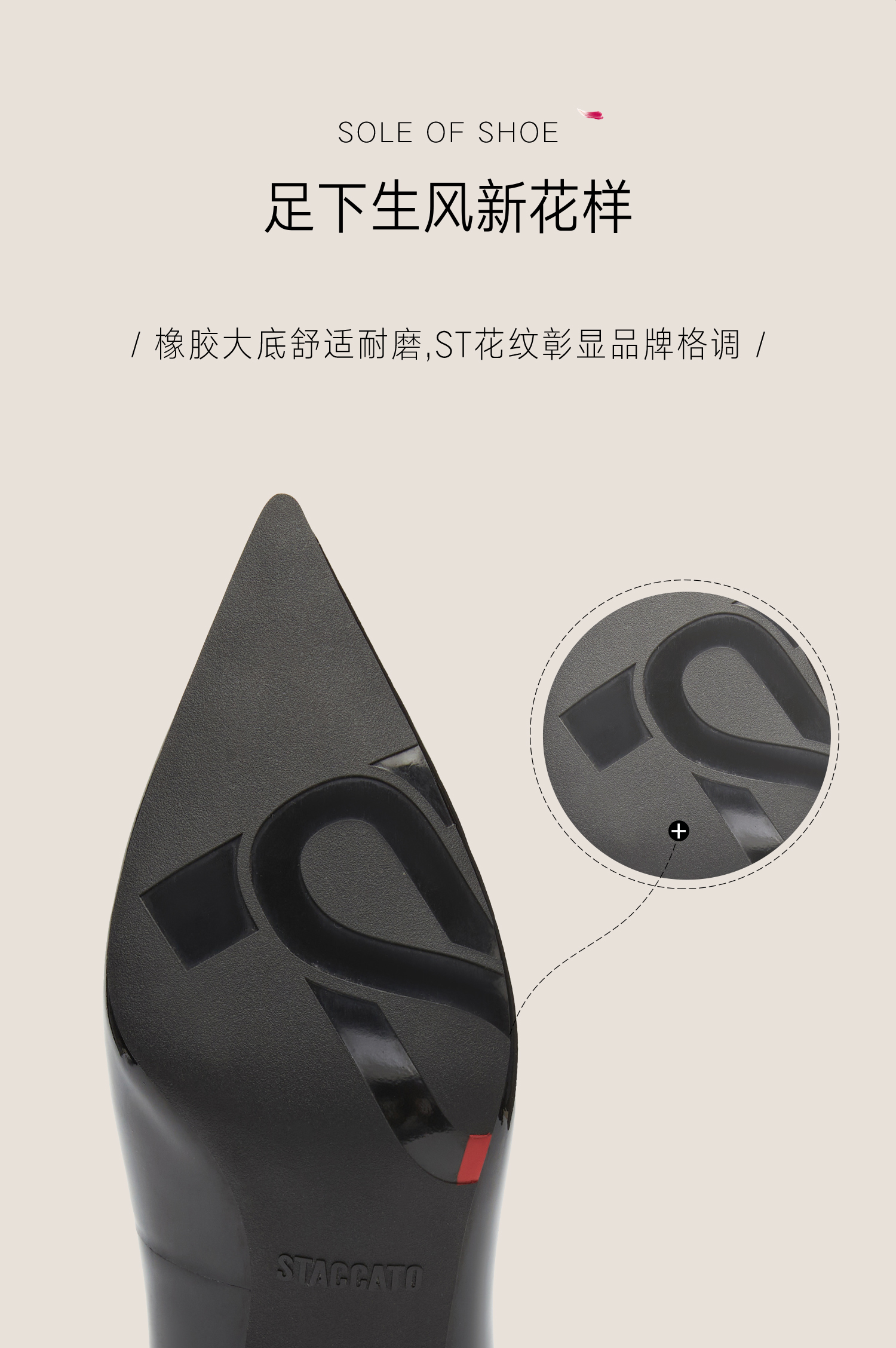 思加图(STACCATO),一个代表着年轻时尚、多元化的时装鞋履品牌,目标将时尚潮流带到女性的现实生活中。“STACCATO”是乐章上的音符,轻轻一点,谱出优美的旋律,为音乐带来多样性。穿上STACCATO单鞋的时代女性,踏出自信又轻松的脚步,犹如跳跃的音符,反映年轻与时尚的生活态度。目前品牌开设门店已超1100家,遍布中国、韩国、澳洲、新加坡、马来西亚、罗马尼亚、沙特阿拉伯等地。