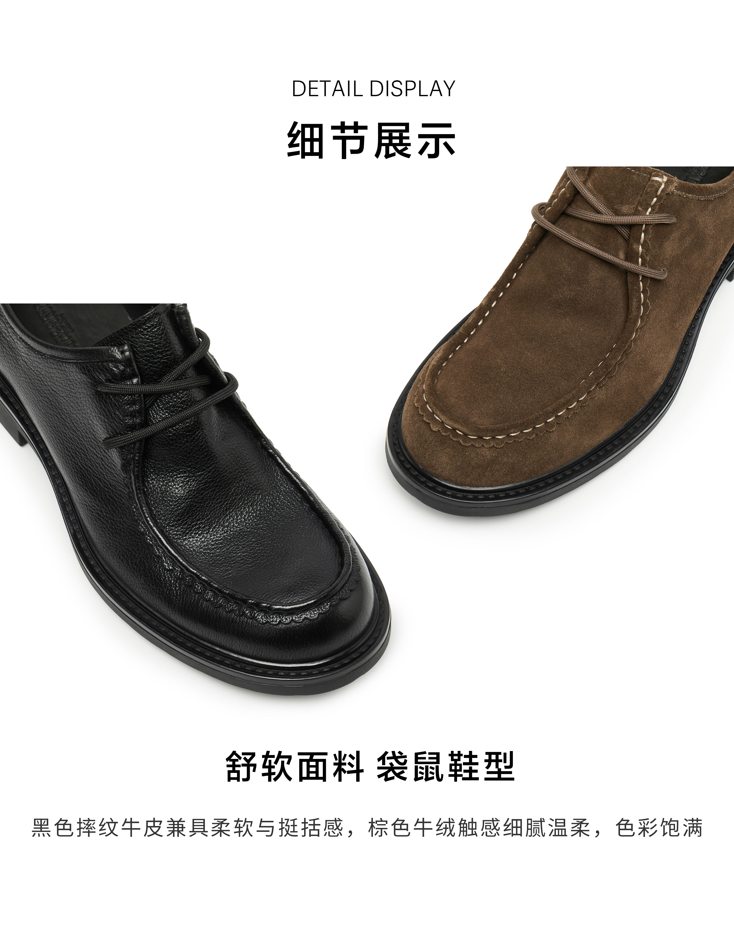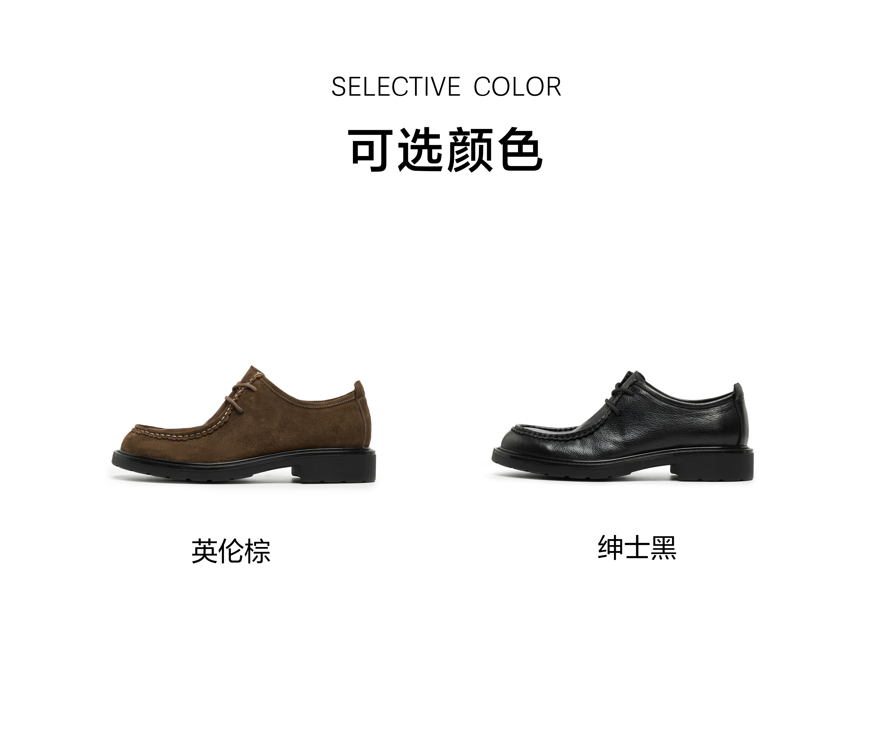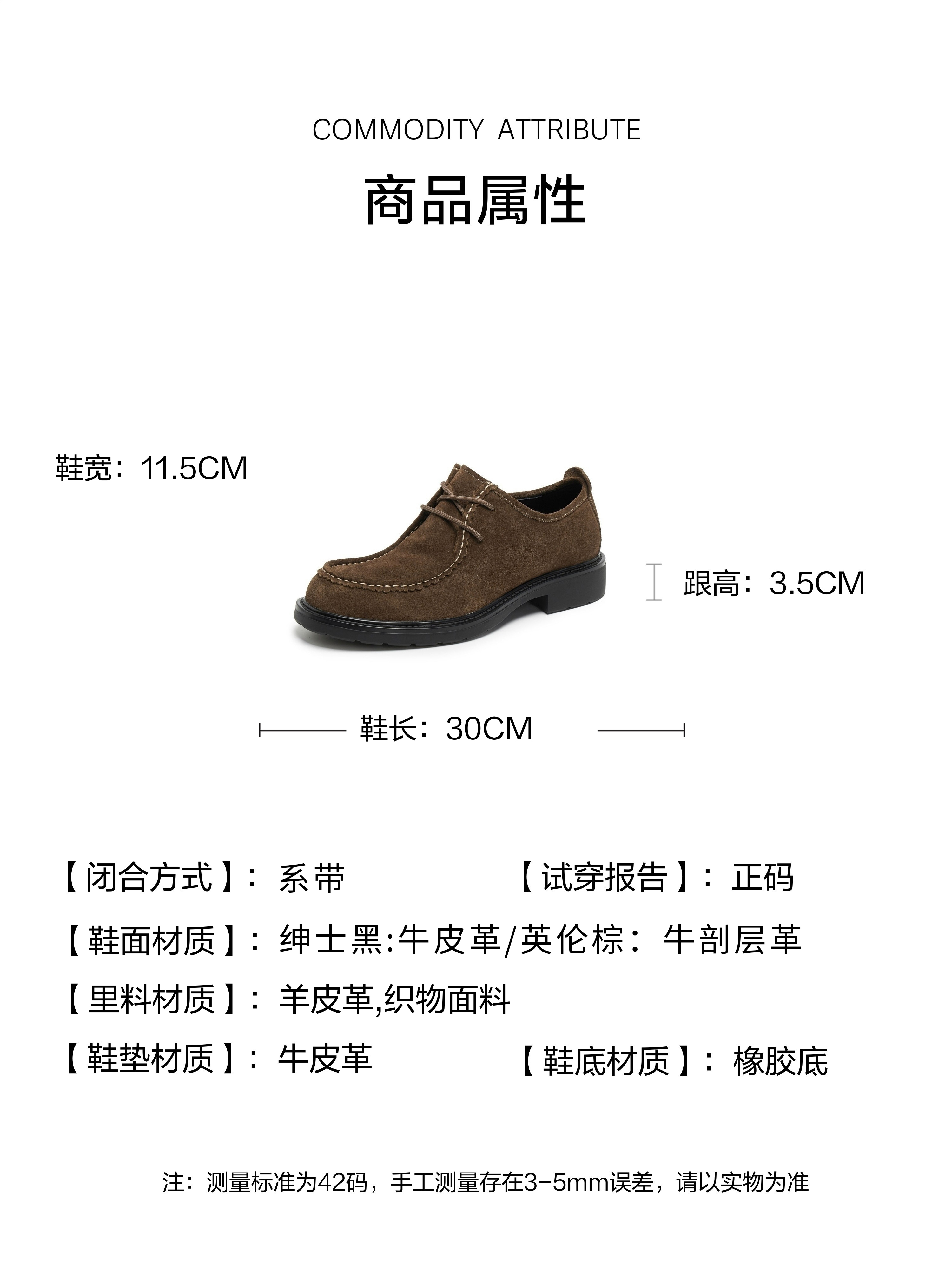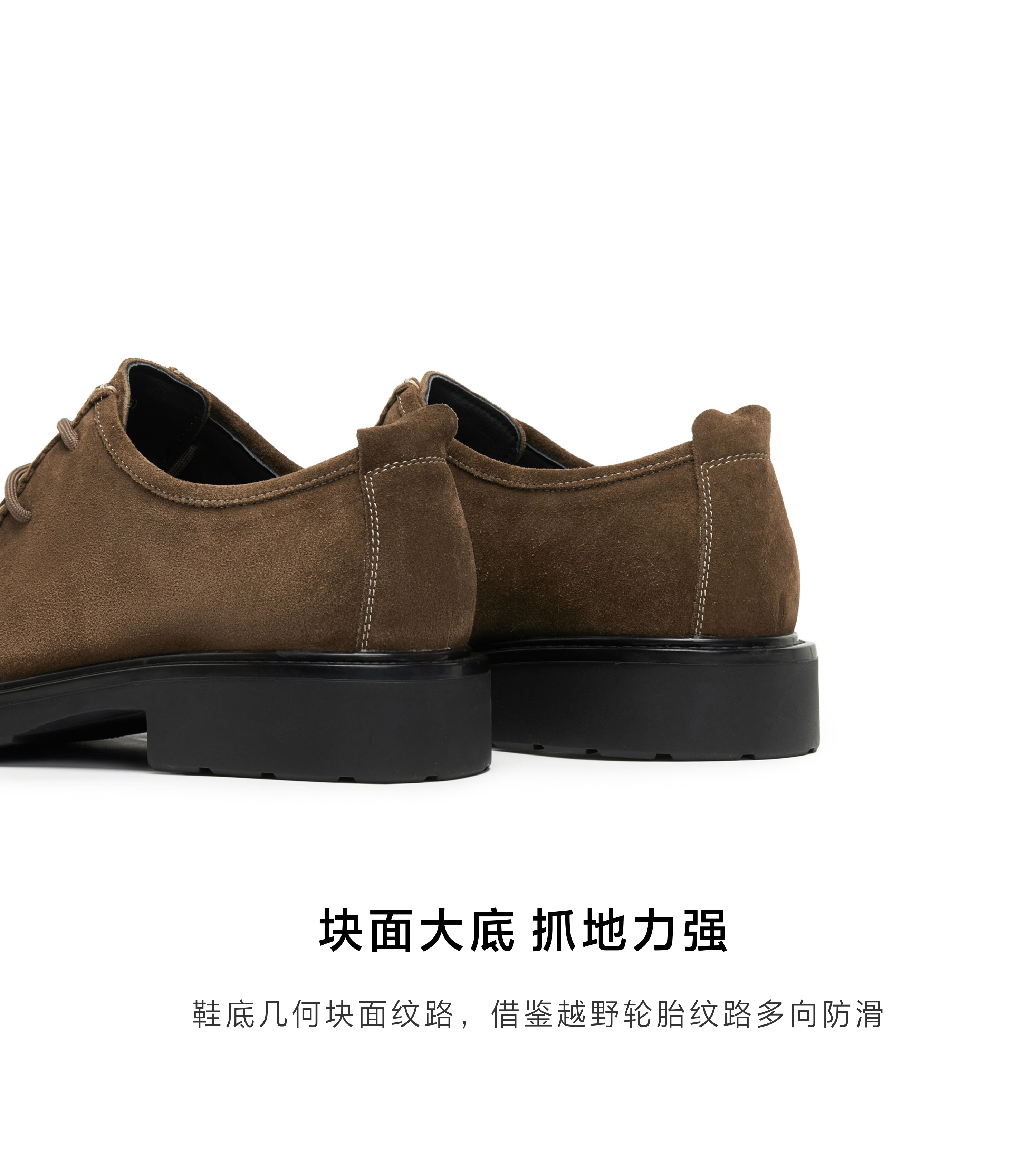 | 鞋跟形状:粗跟 | 鞋面材质:牛剖层革 | 流行元素:绒面 | 闭合方式:系带 | 风格:休闲商务 |