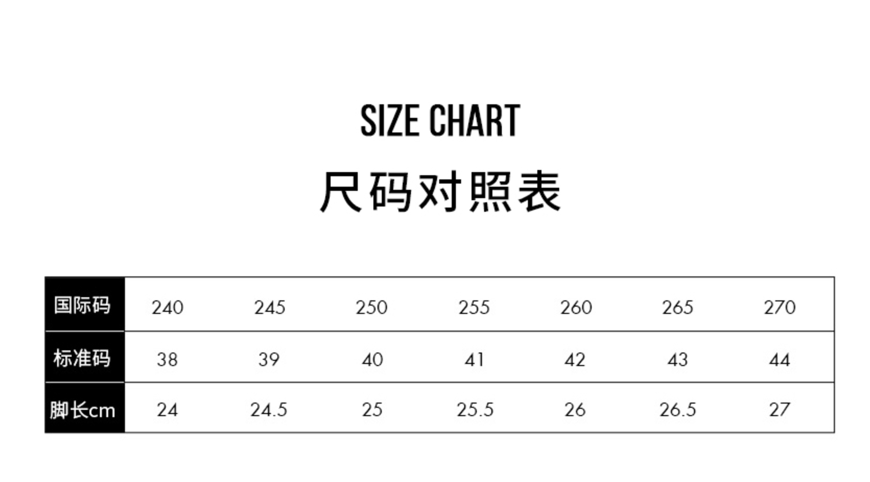 | 法国码 | 38 | 39 | 40 | 41 | 42 | 43 | 44 |