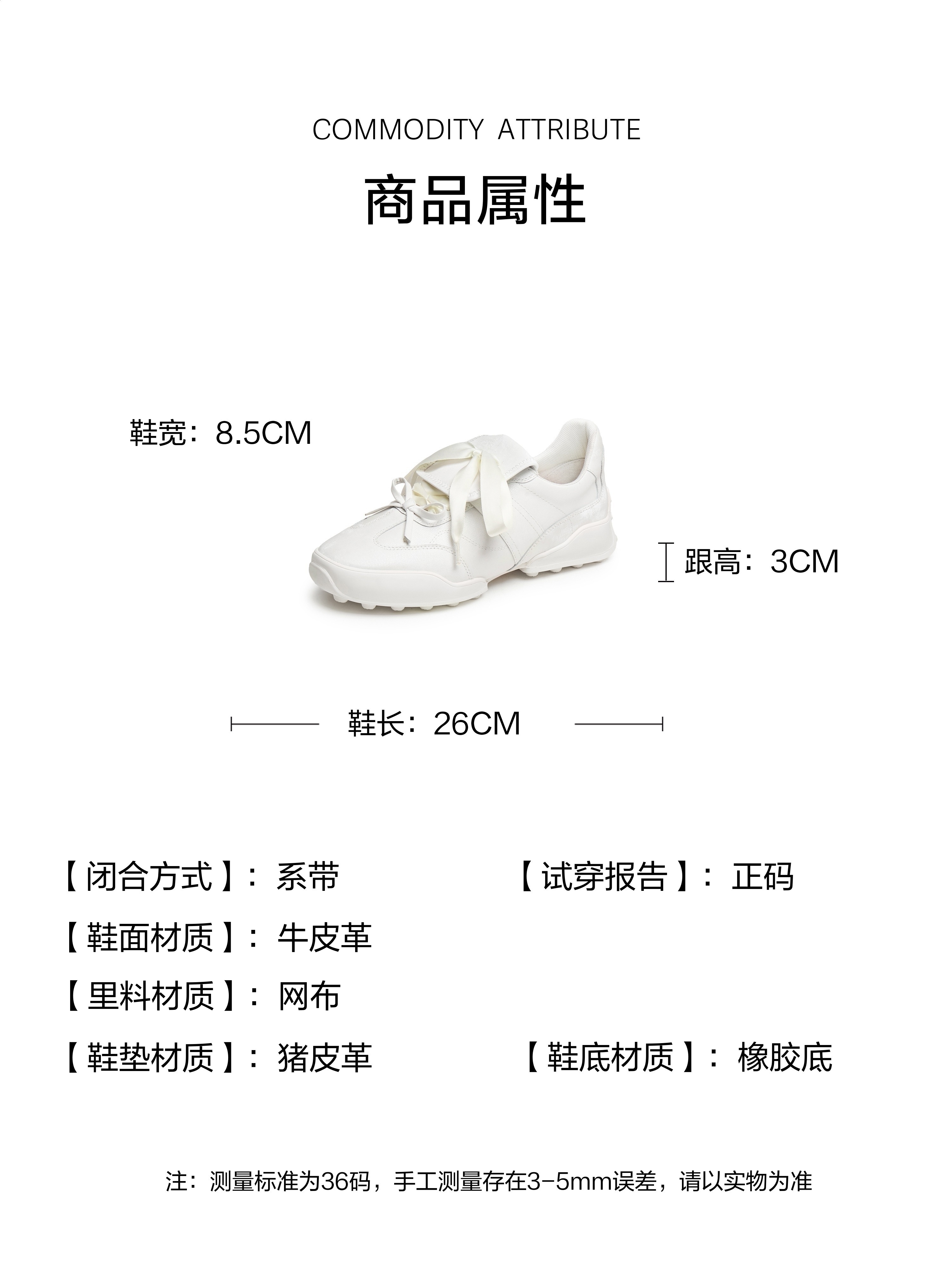 | 参考鞋宽(女):8.5CM | 风格:时尚潮流 | 年份:2025年 | 色系:白色 | 参考标准尺码:36码 |