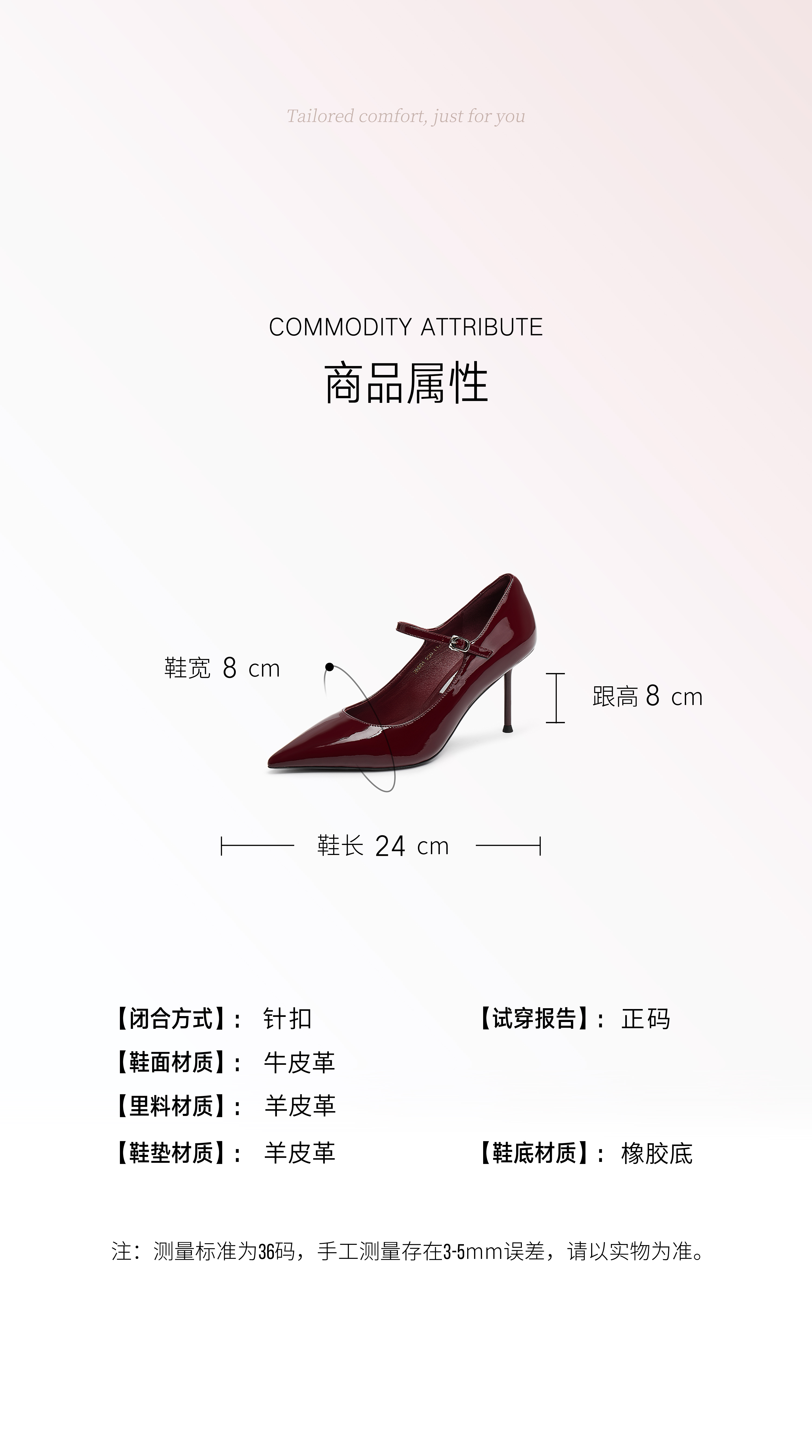 | 鞋面材质:牛皮革 | 流行元素:素面 | 参考鞋长(女):24CM | 参考鞋宽(女):8CM | 闭合方式:针扣 |