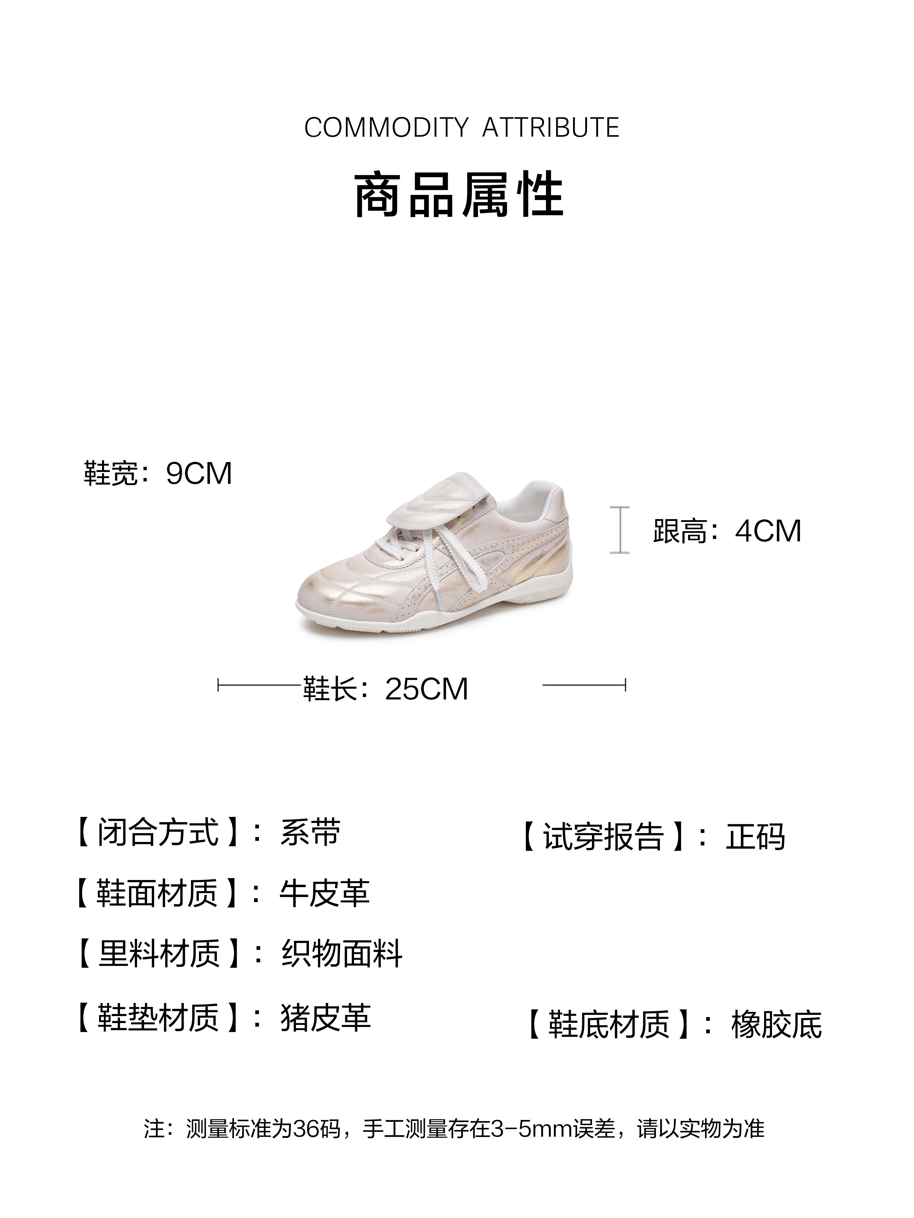 | 参考标准尺码:36码 | 跟高数值:4CM | 性别:女子 | 里料材质:织物面料 | 制鞋工艺:胶贴皮鞋 |