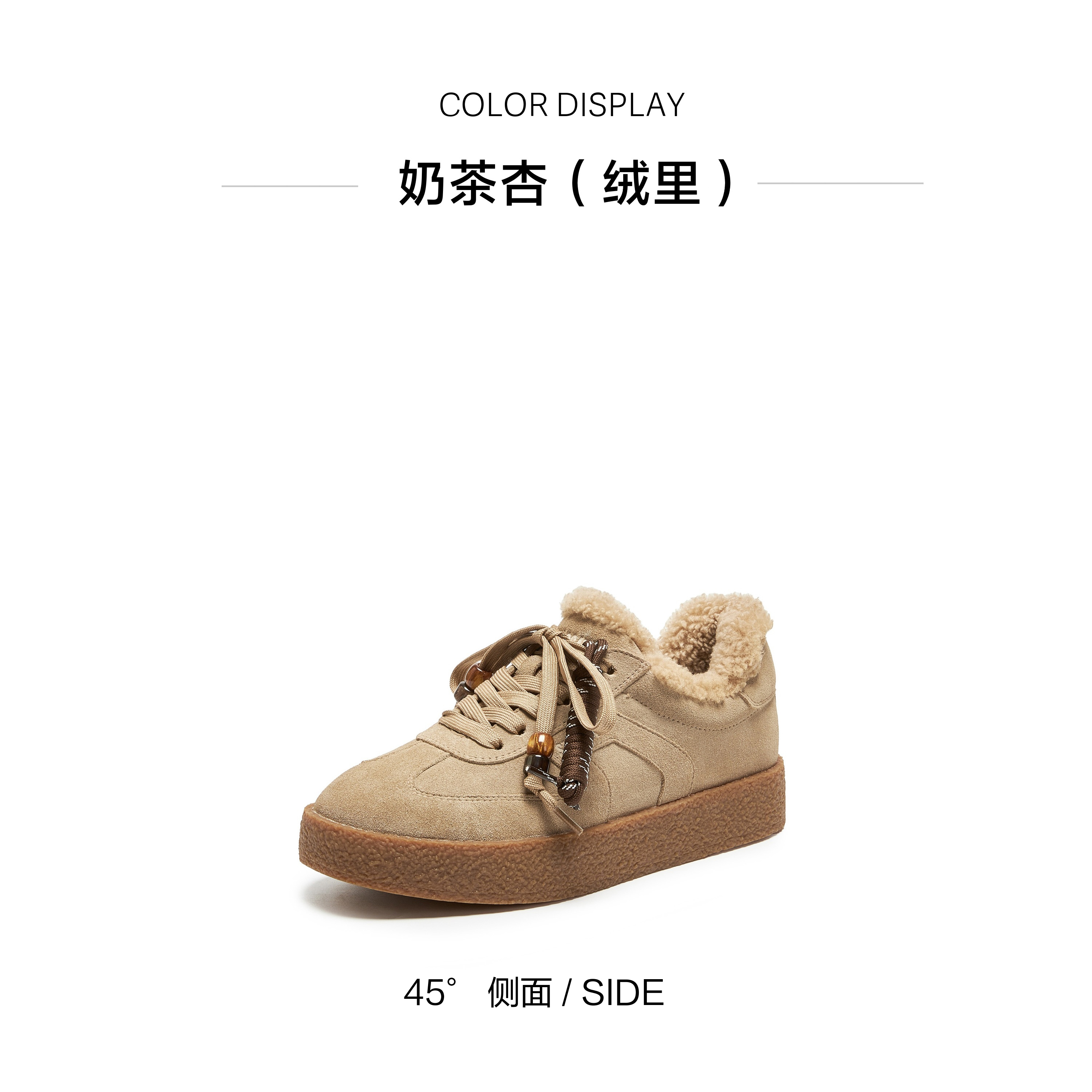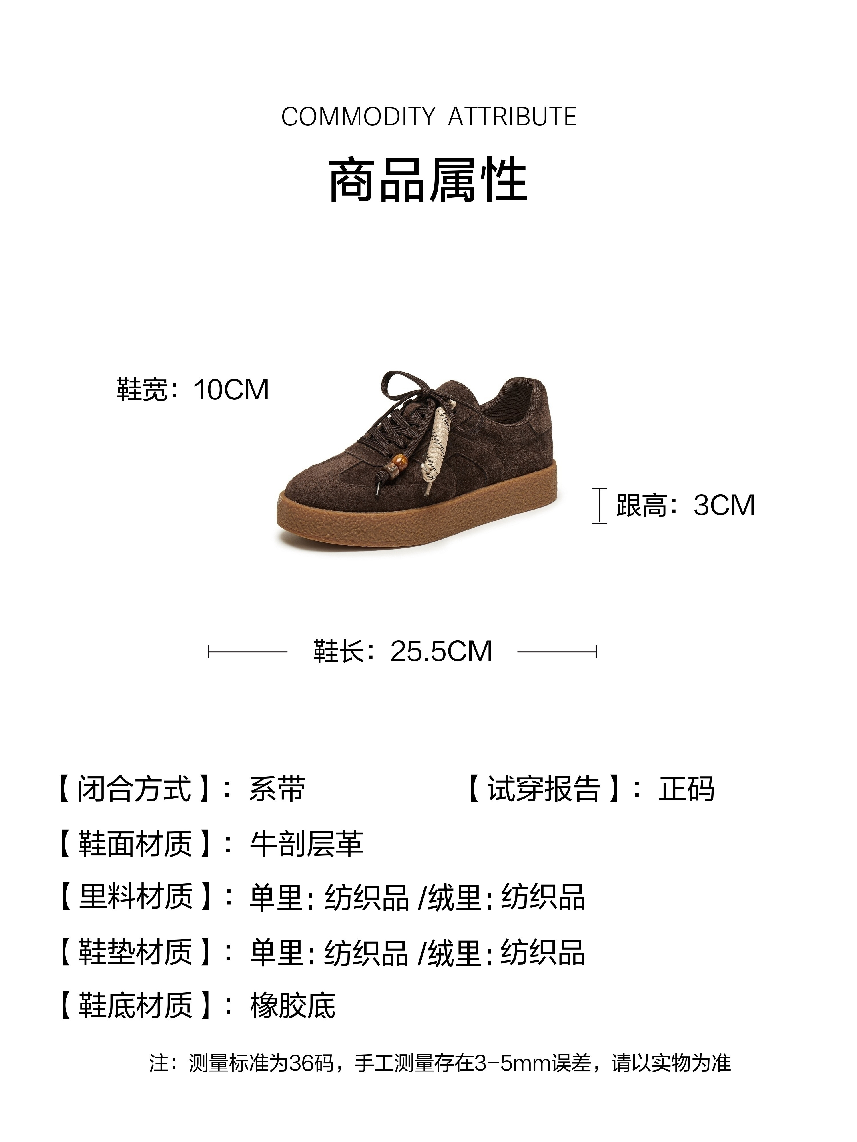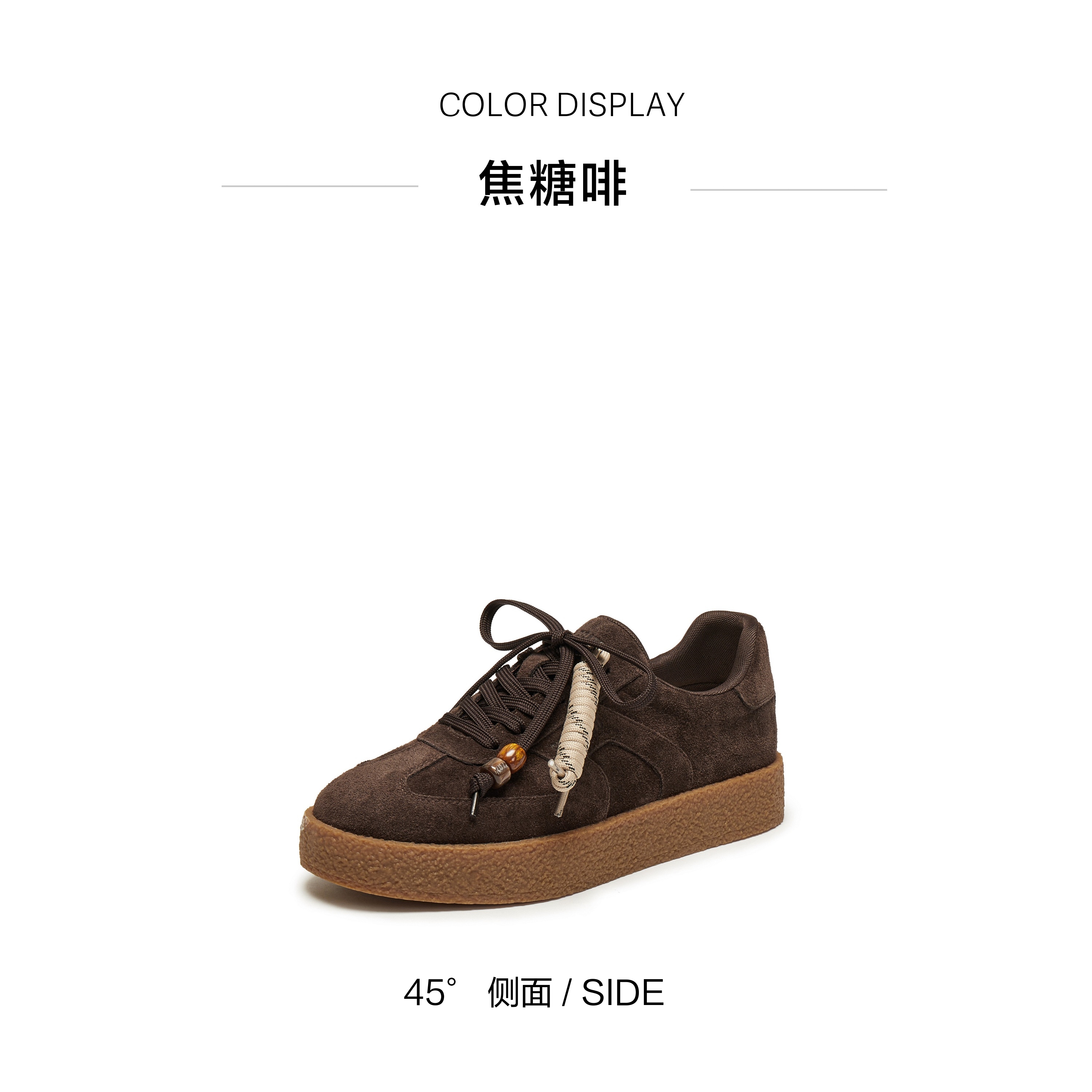 | 风格:时尚潮流 | 鞋面内里材质:纺织品 | 色系:咖啡色 | 跟高数值:3CM | 适用人群:成人 |