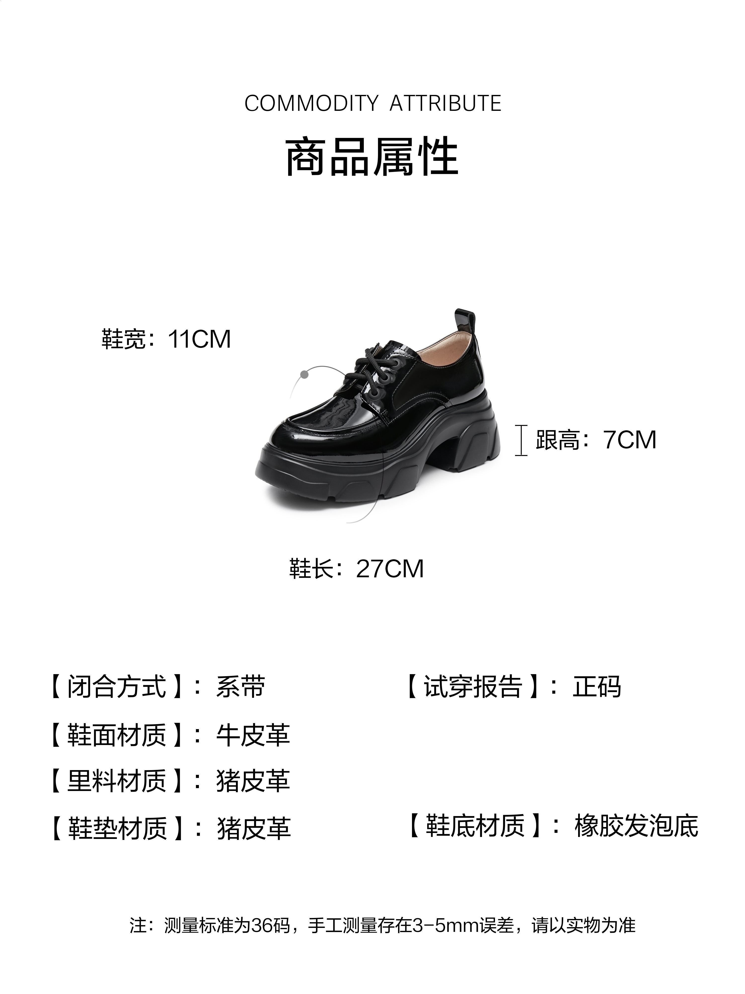 | 制鞋工艺:胶贴皮鞋 | 款式季节:秋季 | 鞋垫材质:猪皮革 | 渠道划分:线下同步 | 前掌高度:3.5CM |
