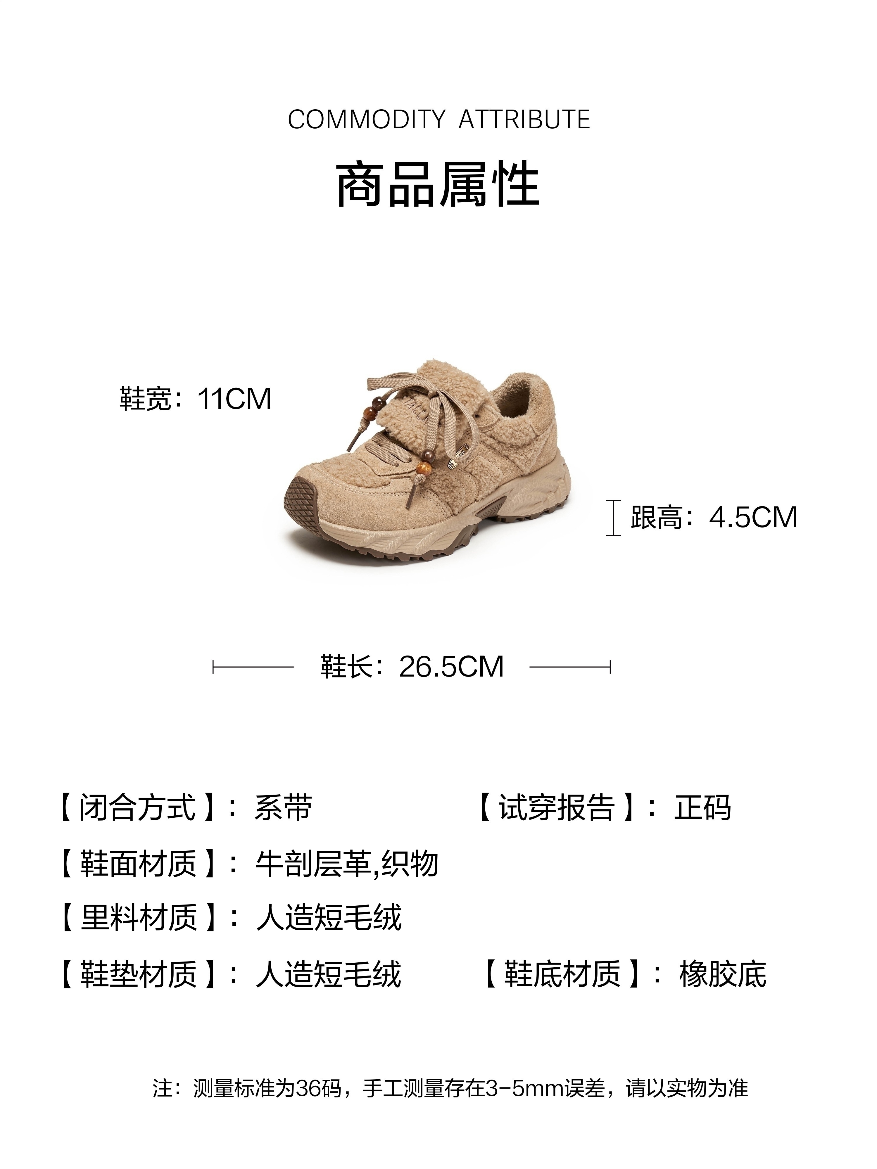 | 鞋帮:低帮 | 鞋底材质:橡胶底 | 靴筒内里材质:人造毛绒 | 内增高:无 | 鞋面材质:织物牛剖层革 |