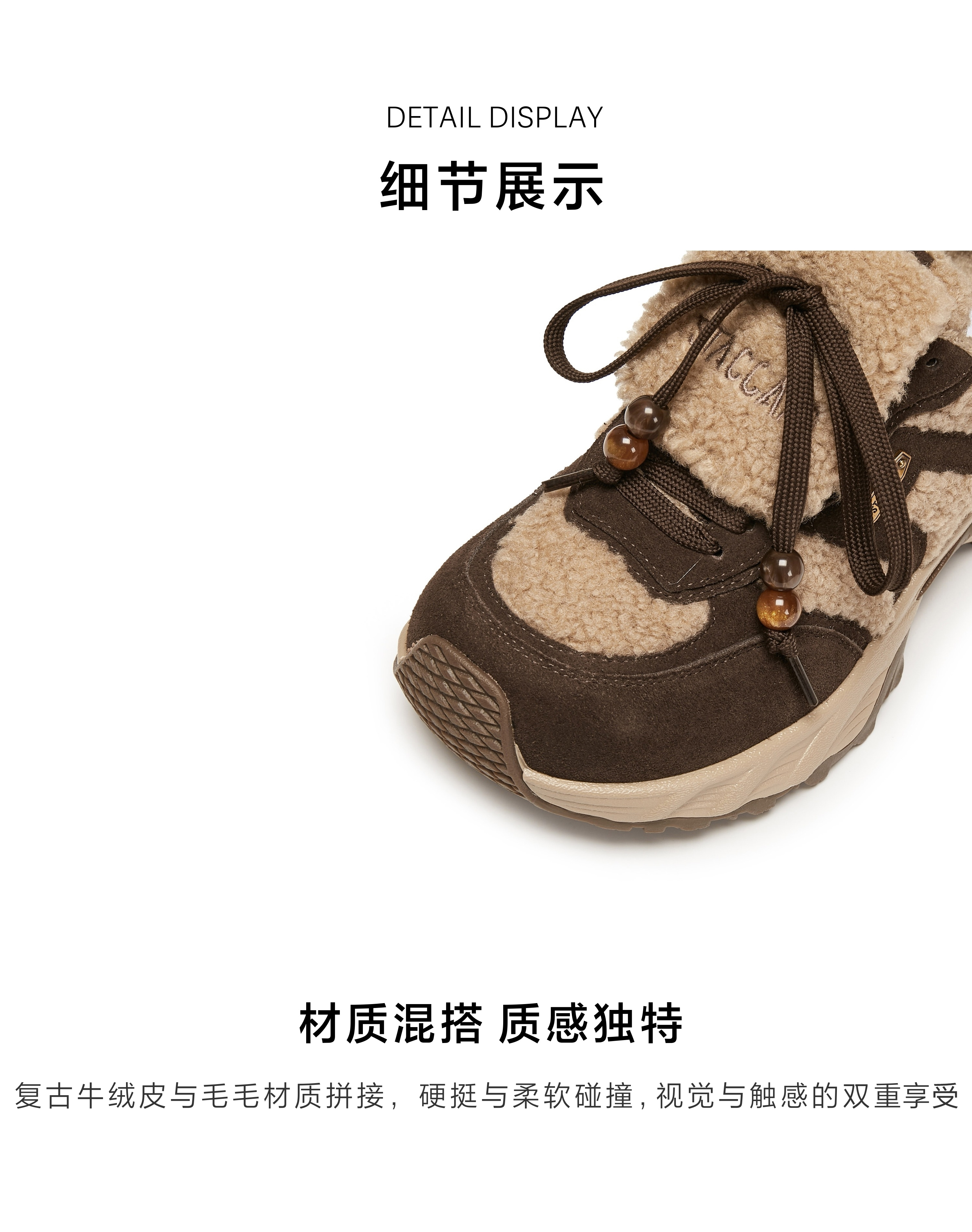 | 风格:时尚潮流 | 鞋面内里材质:人造短毛绒 | 跟高数值:4.5CM | 色系:咖啡色 | 适用人群:成人 |