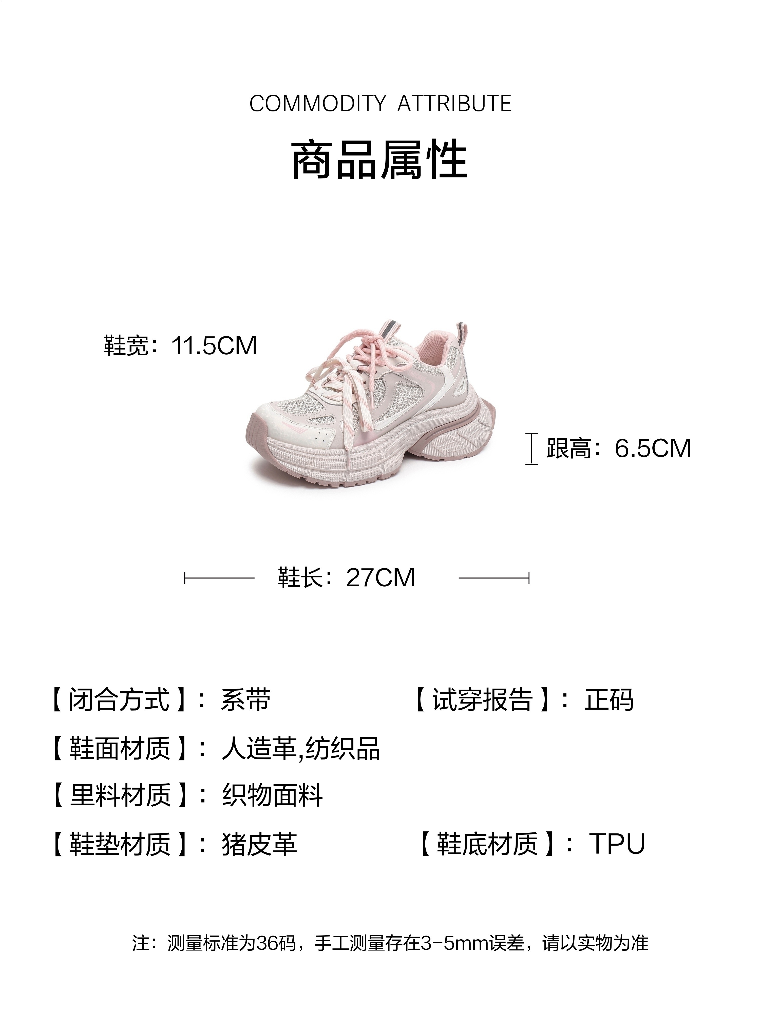 | 鞋帮:低帮 | 鞋头款式:圆头 | 鞋底材质:TPU | 鞋面图案:拼色 | 鞋跟形状:厚底 |