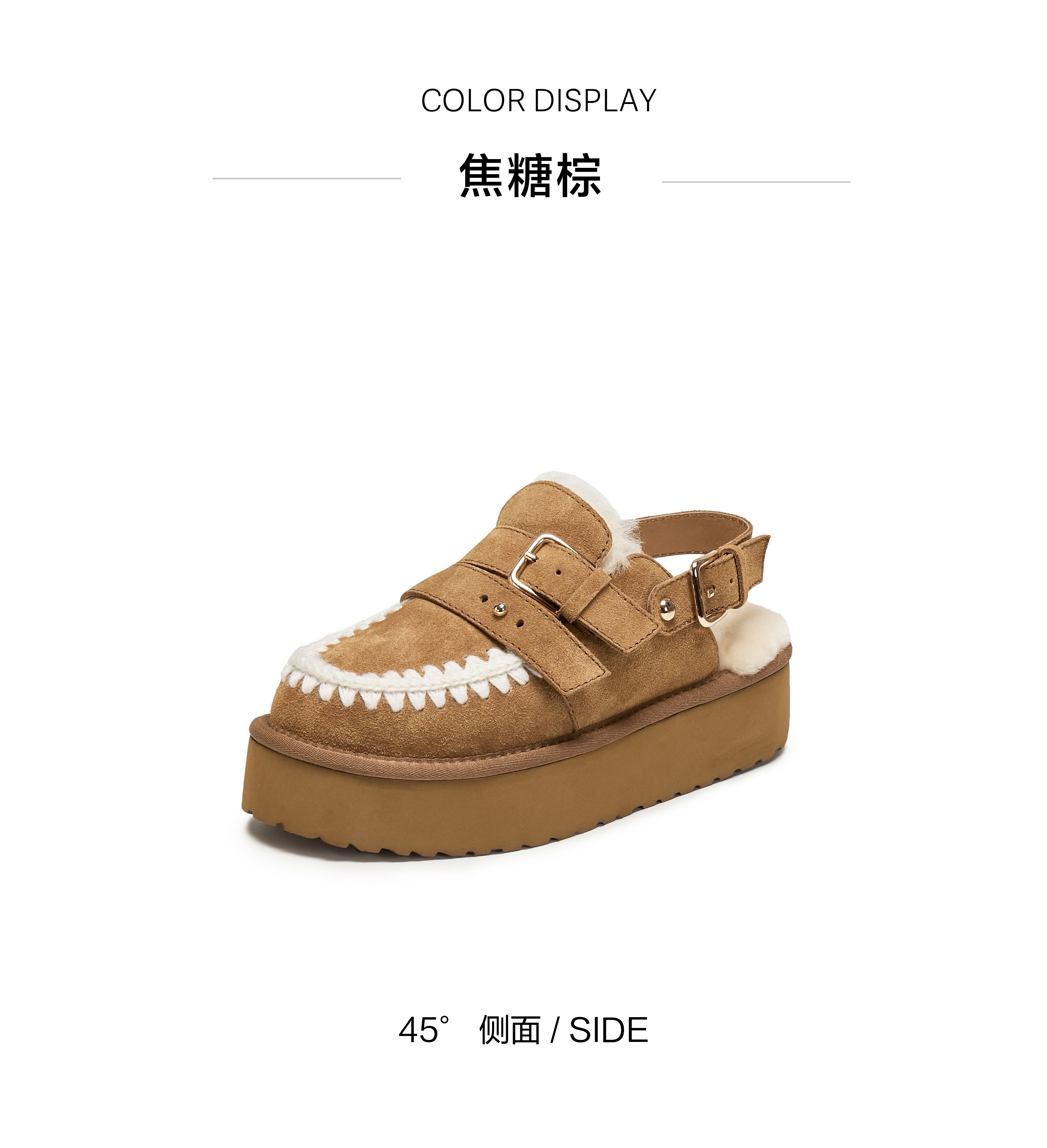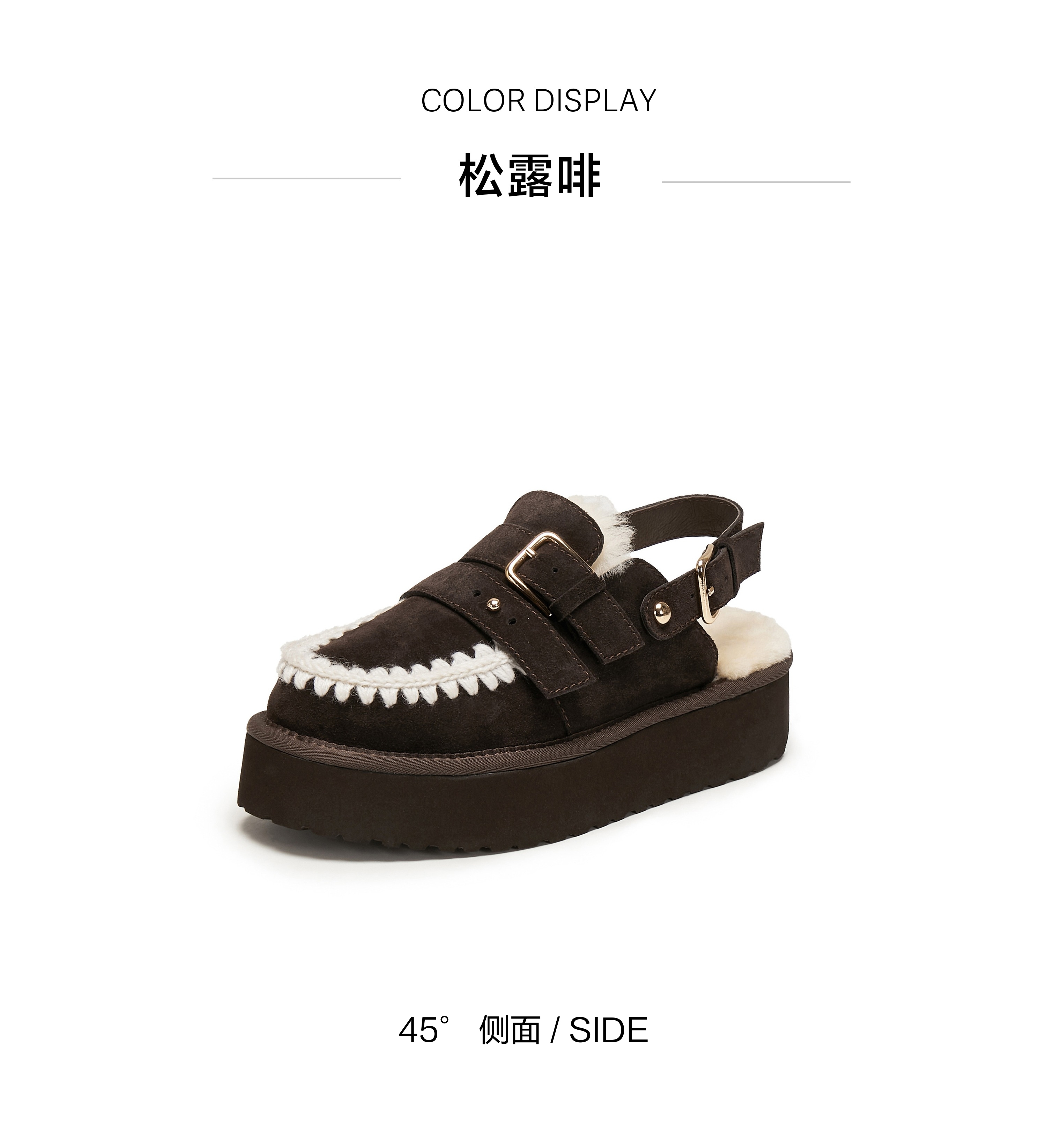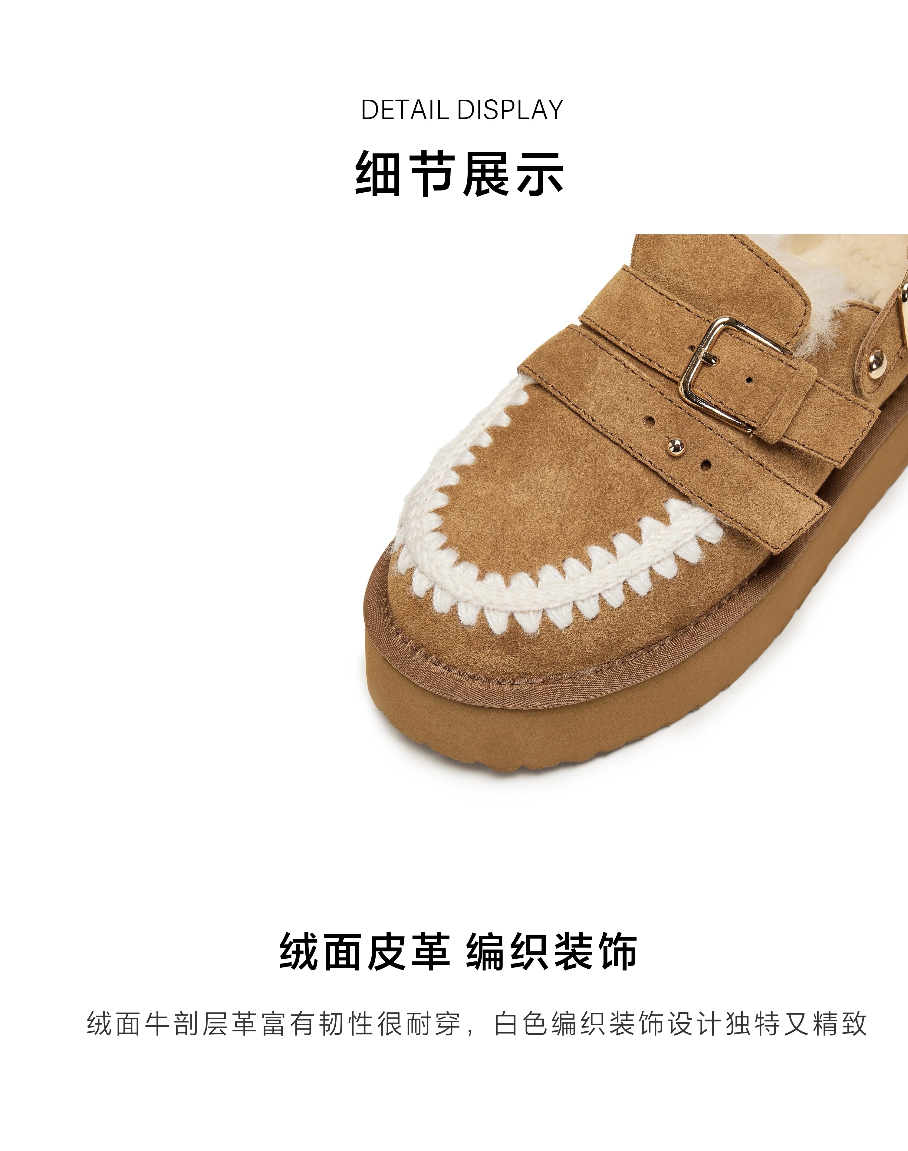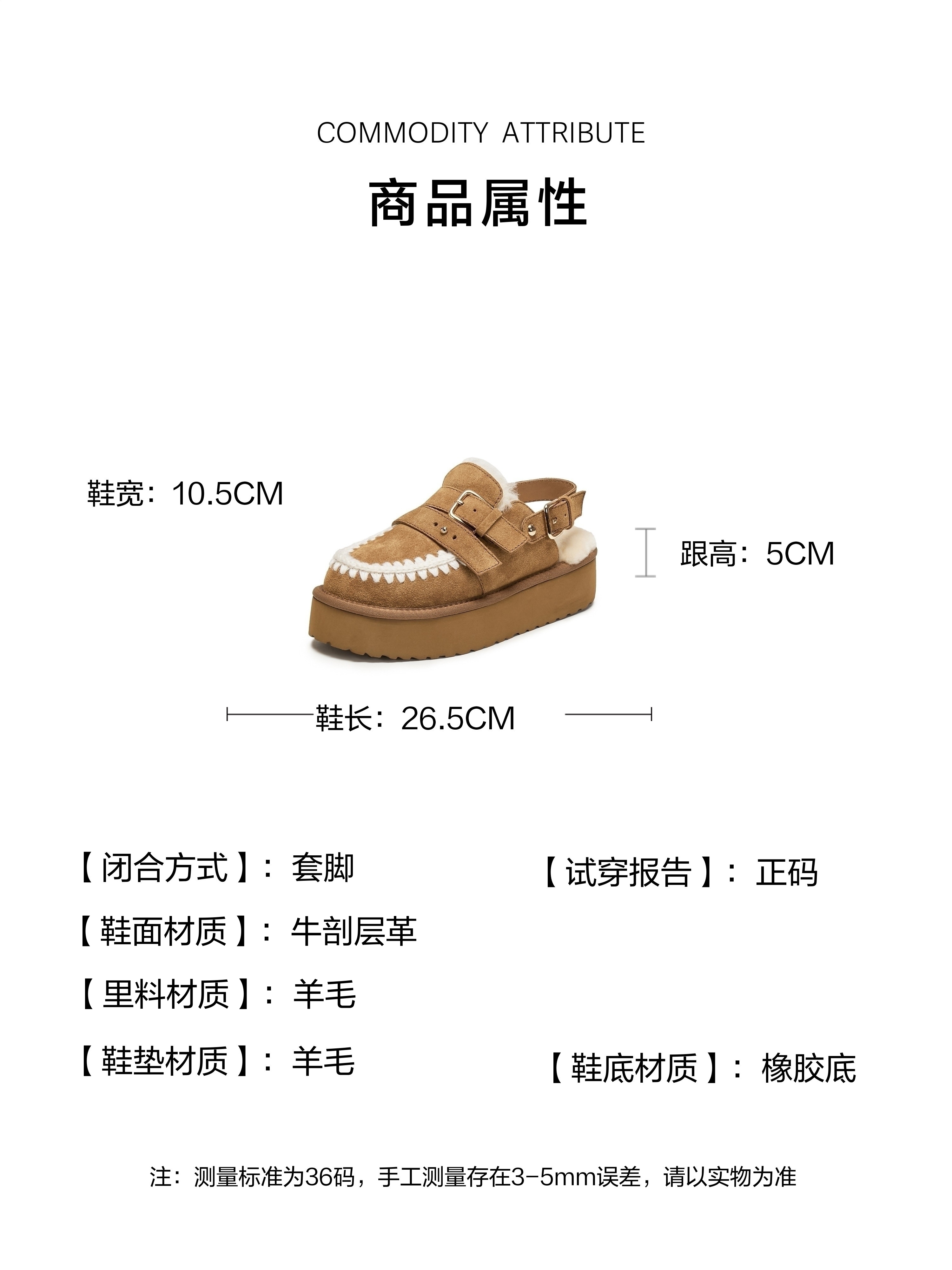 | 鞋面内里材质:羊毛 | 色系:棕色 | 跟高数值:5CM | 配跟:无 | 性别:女子 |