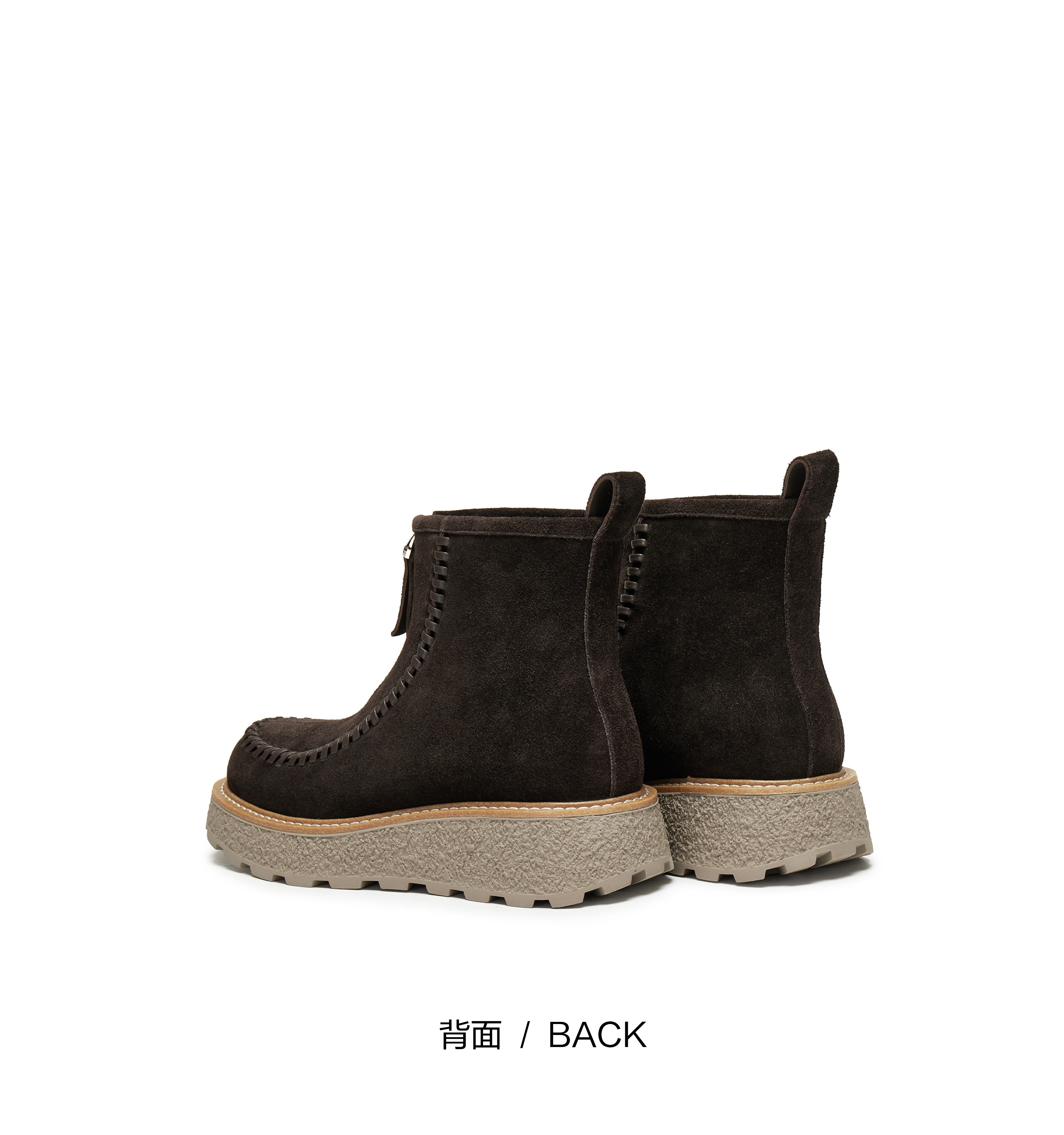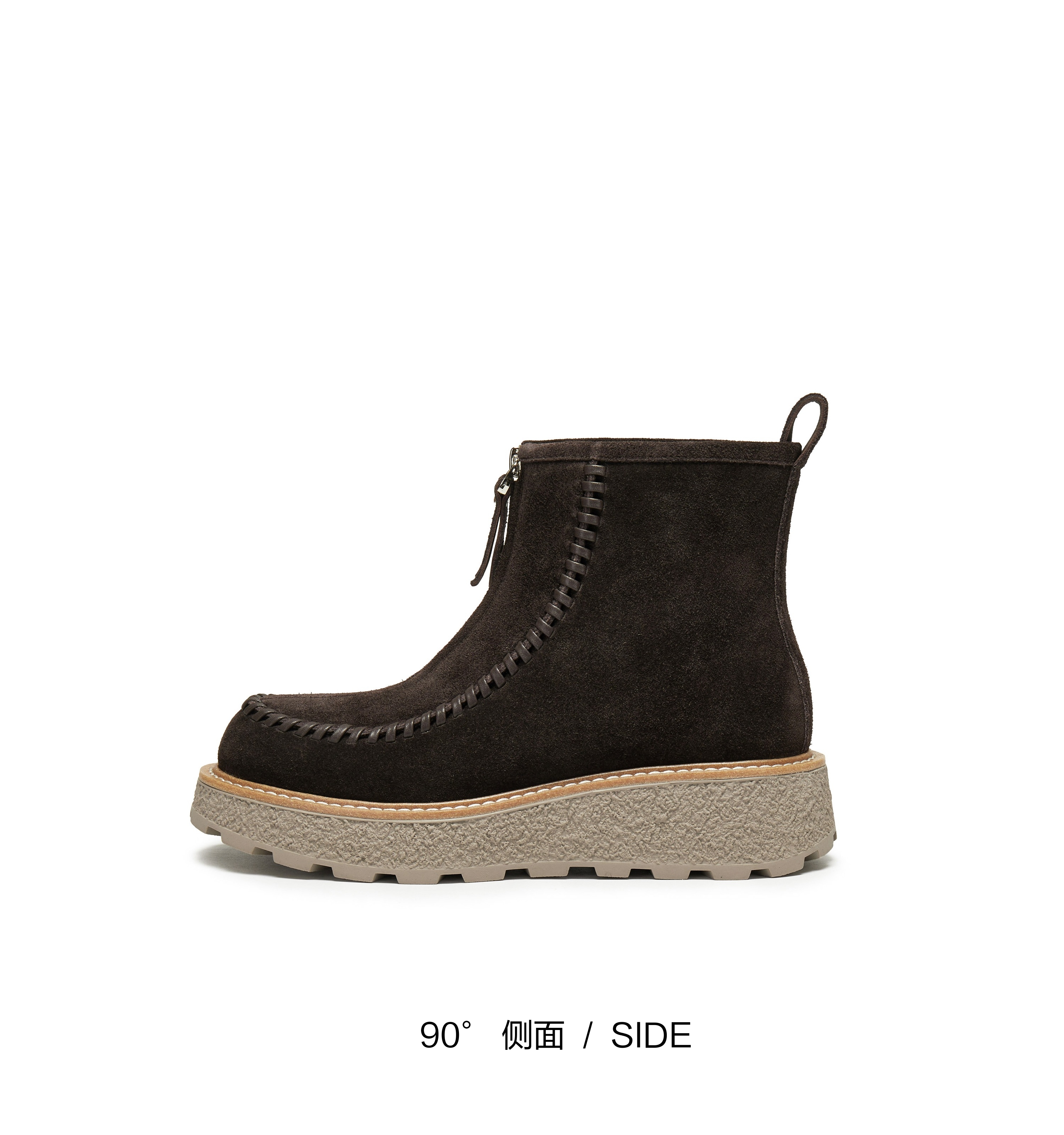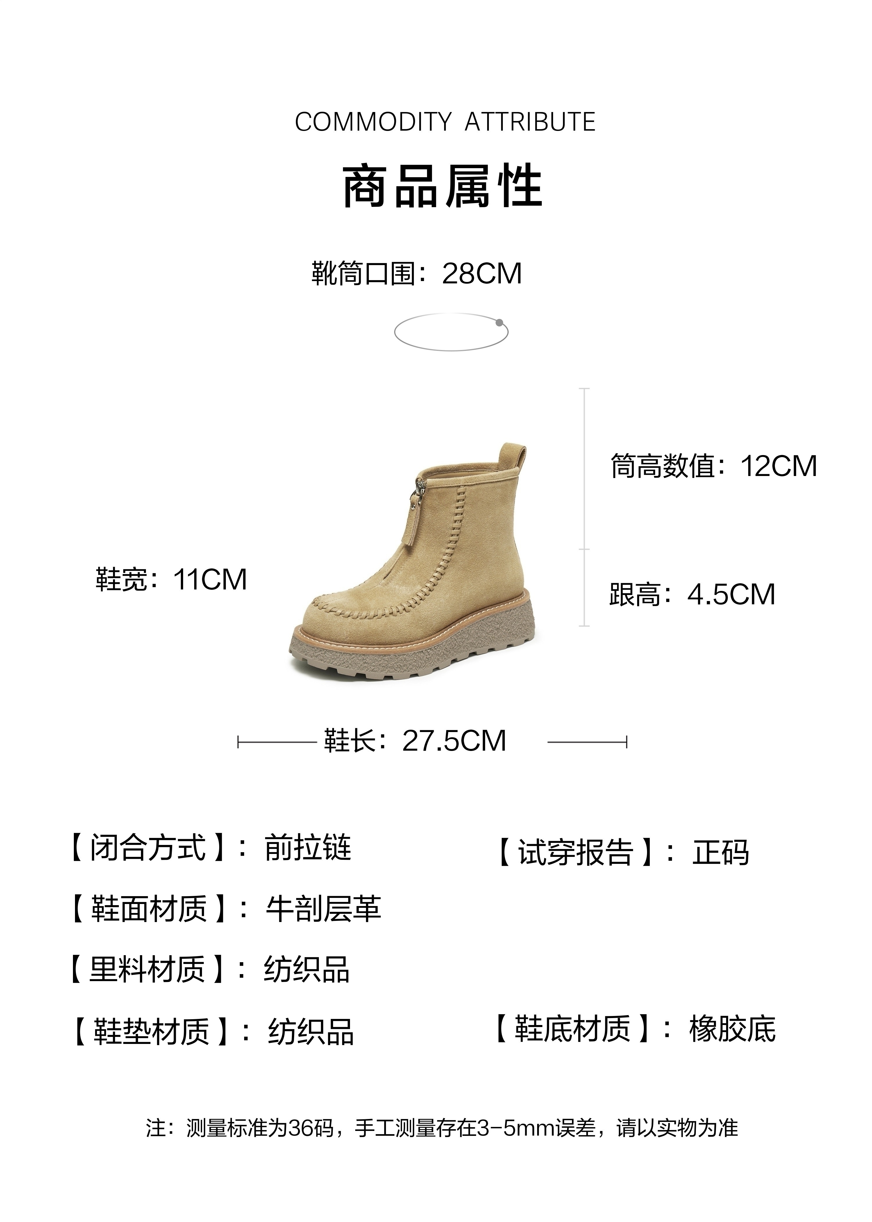 | 鞋底材质:橡胶底 | 靴筒内里材质:织物 | 内增高:无 | 鞋面材质:牛剖层革 | 闭合方式:前拉链 |