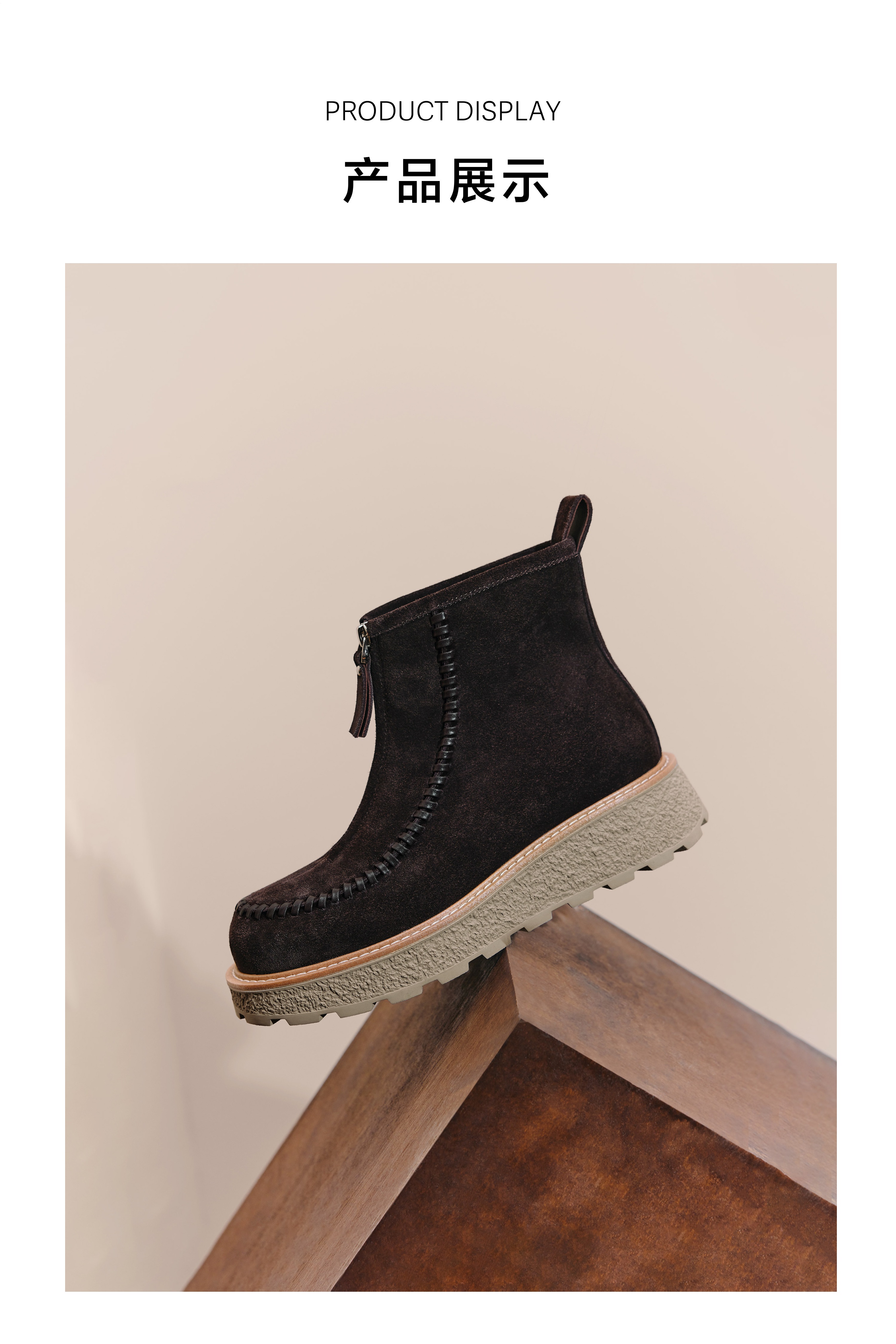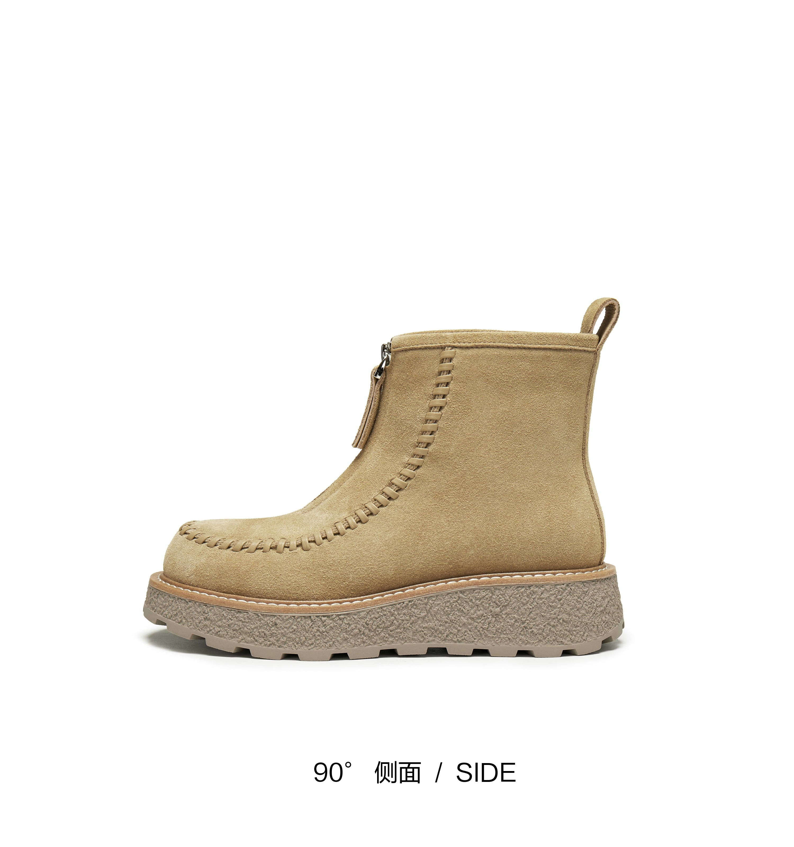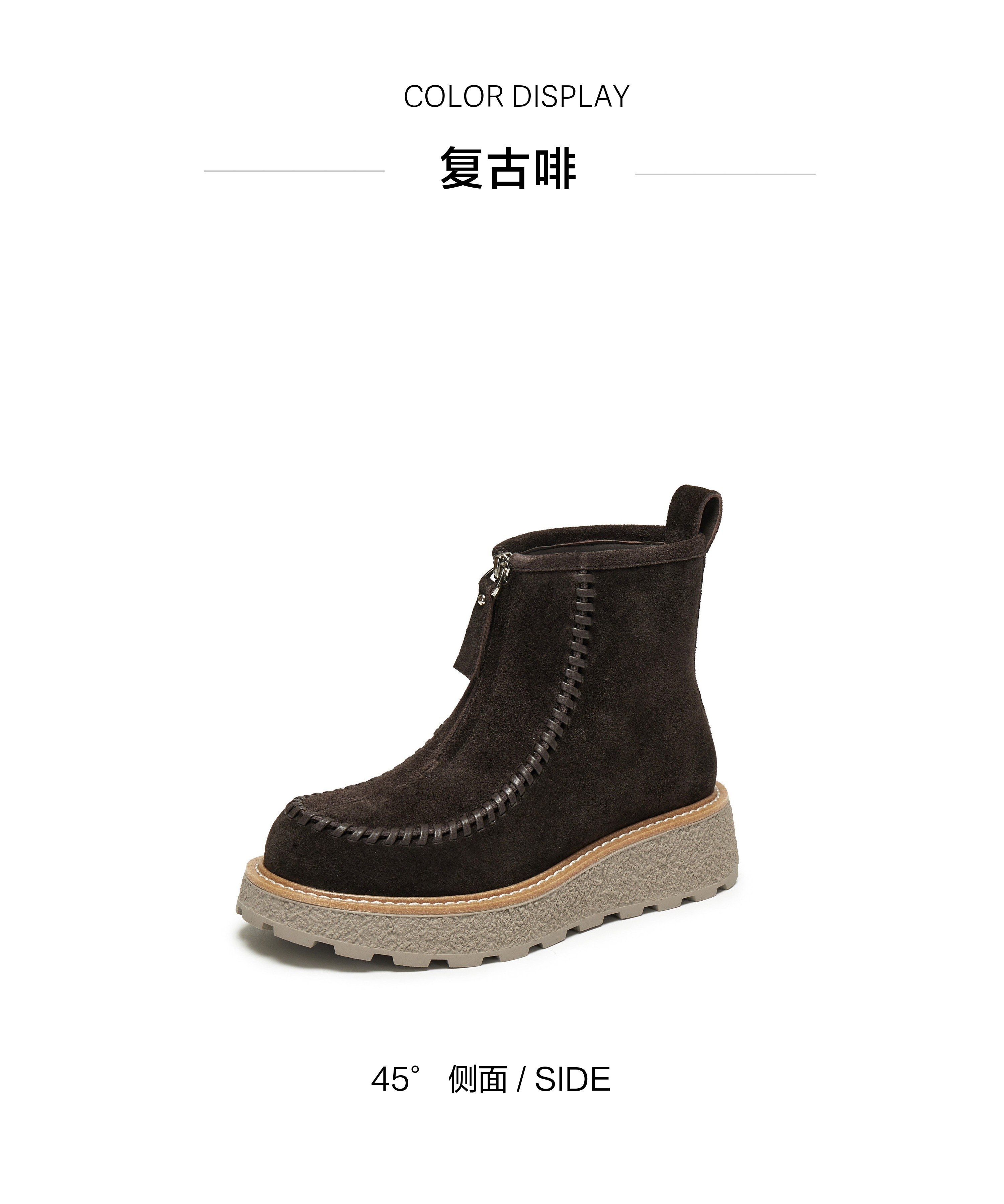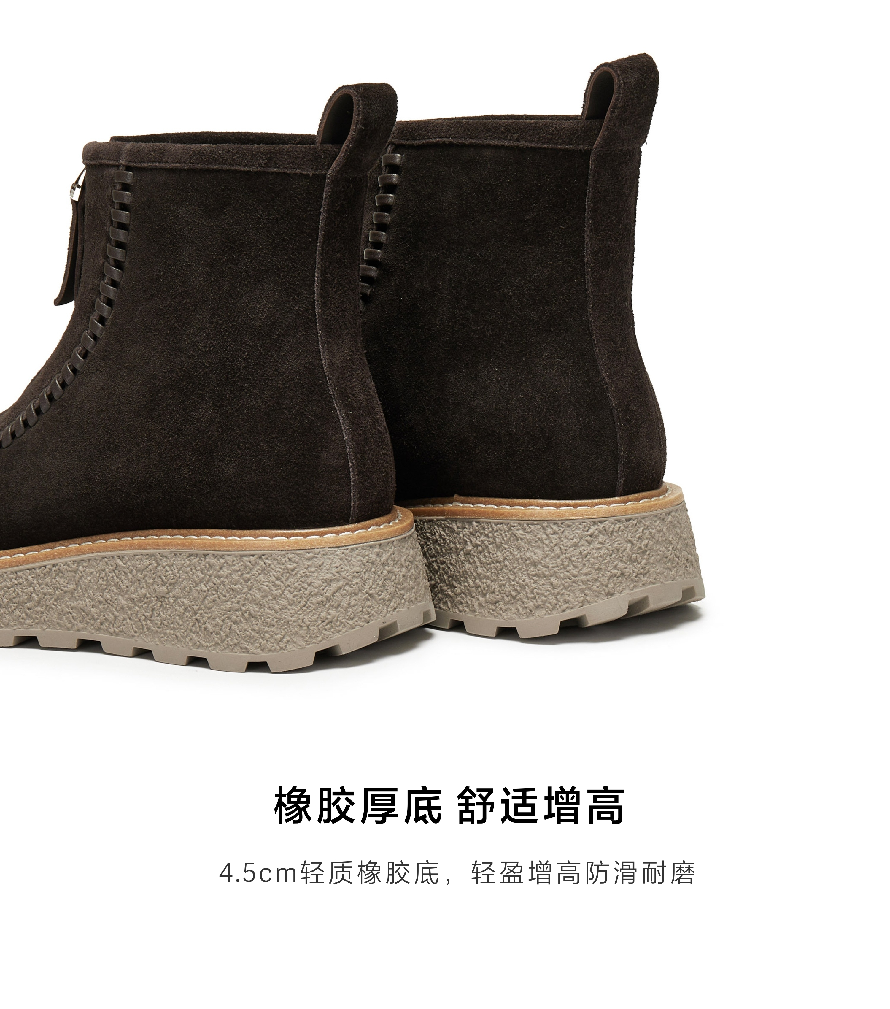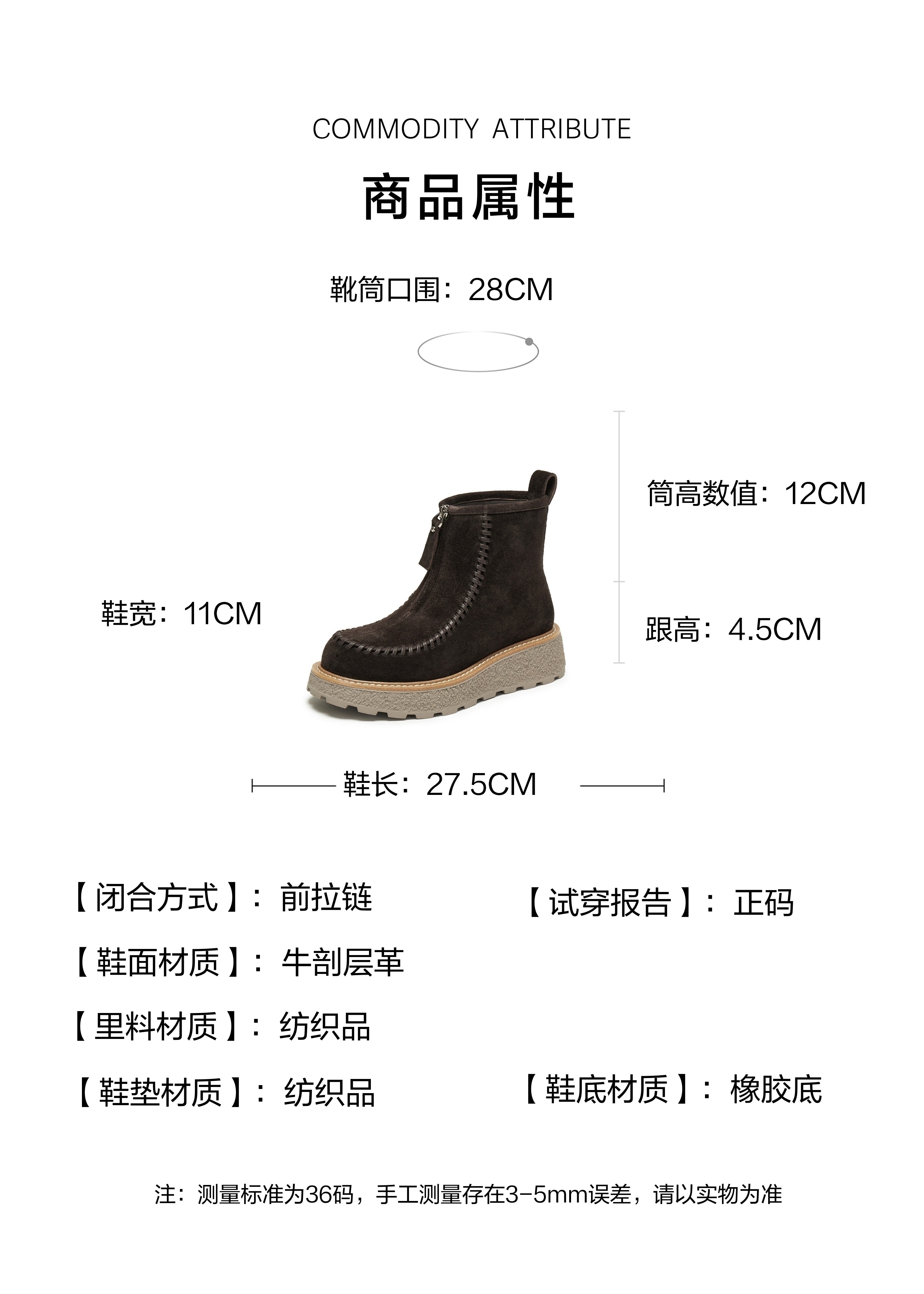 | 鞋底材质:橡胶底 | 靴筒内里材质:织物 | 内增高:无 | 鞋面材质:牛剖层革 | 闭合方式:前拉链 |