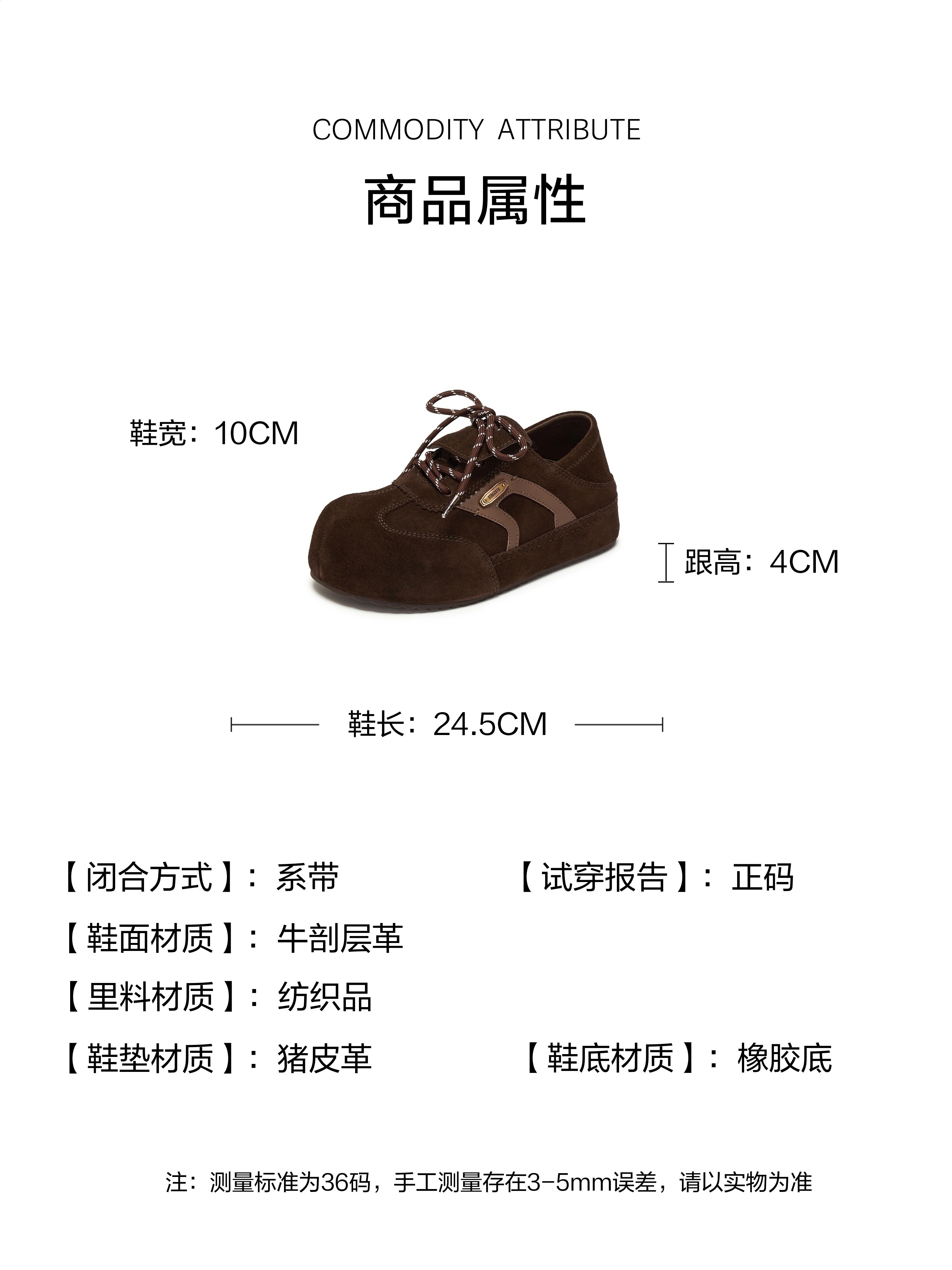| 鞋面材质:牛剖层革 | 流行元素:撞色 | 参考鞋长(女):24.5CM | 参考鞋宽(女):10CM | 闭合方式:系带 |
