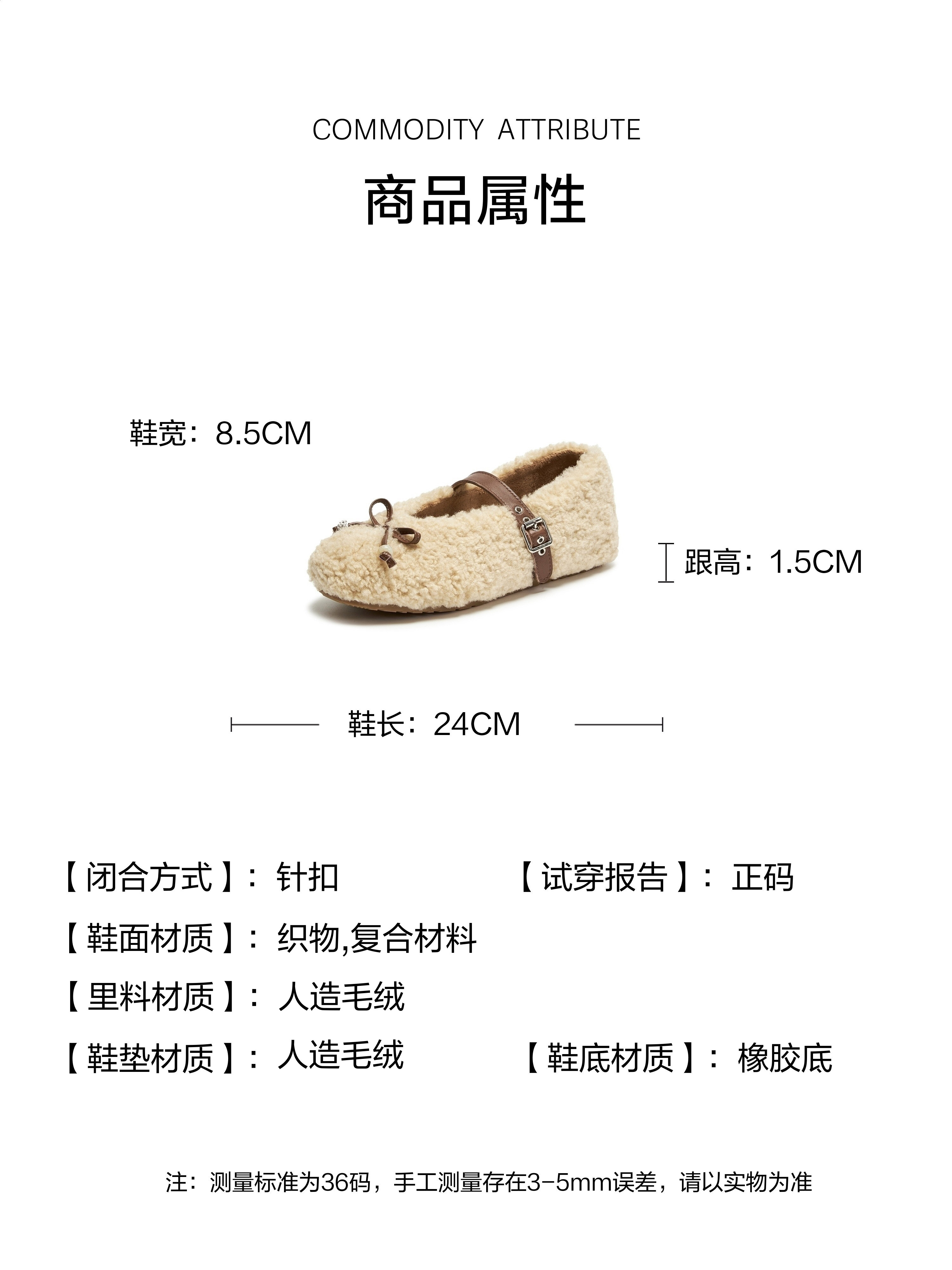 | 鞋垫材质:人造短毛绒 | 皮质特征:织物 | 鞋类流行款式:玛丽珍鞋 |