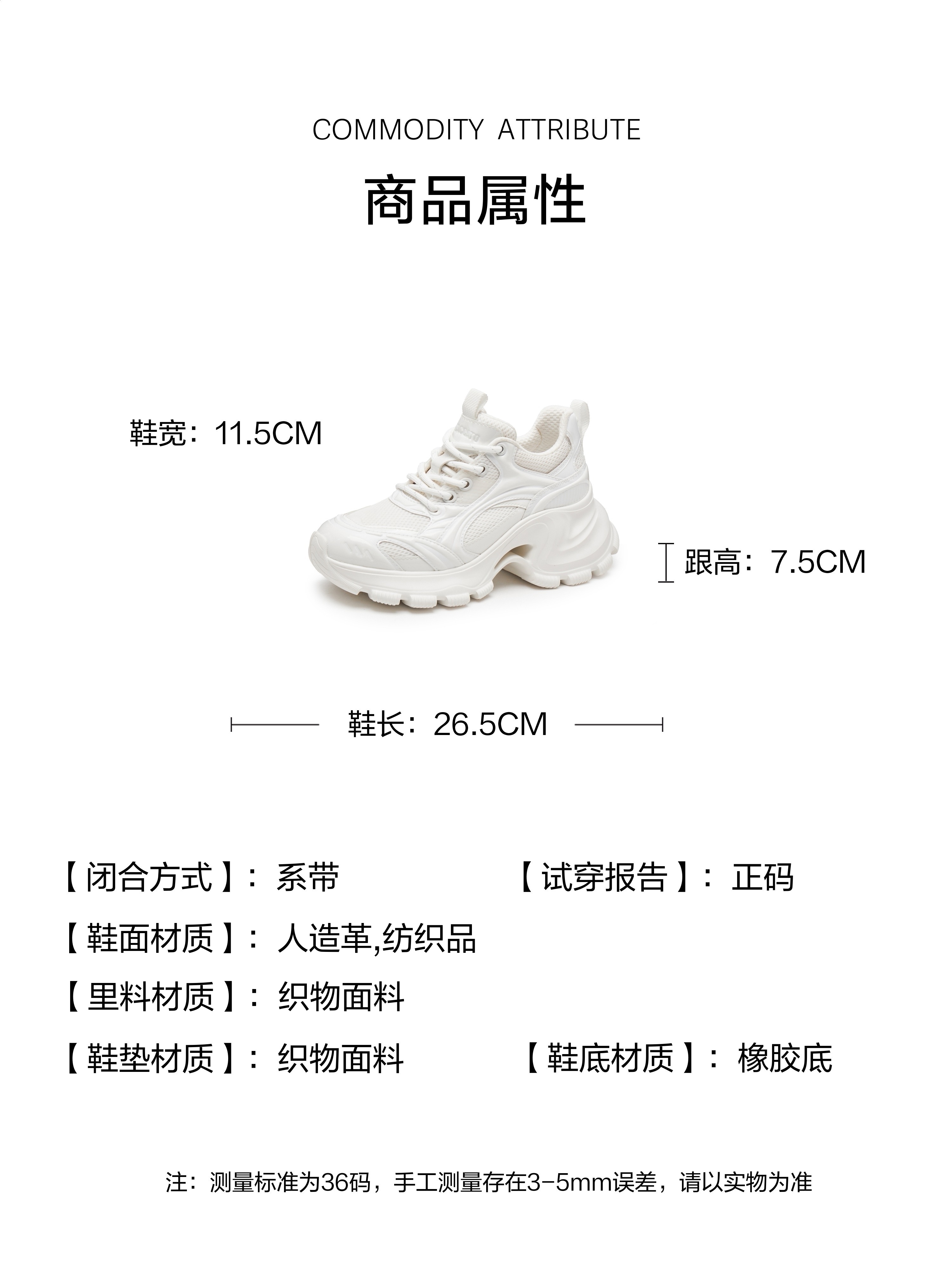 | 参考鞋宽(女):11.5CM | 风格:时尚潮流 | 年份:2025年 | 色系:米白 | 参考标准尺码:36码 |