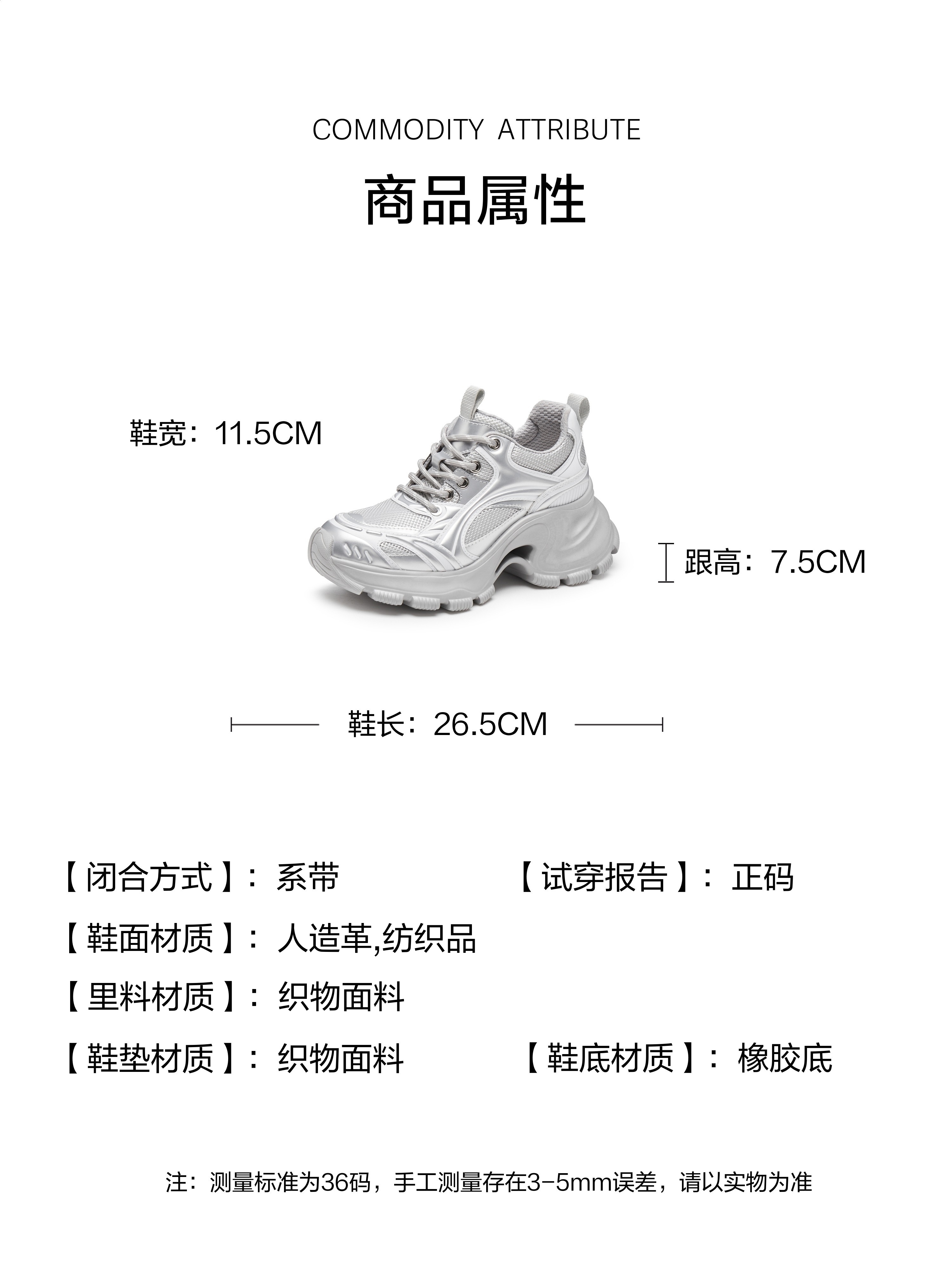 | 参考鞋宽(女):11.5CM | 风格:时尚潮流 | 年份:2025年 | 色系:银色 | 参考标准尺码:36码 |
