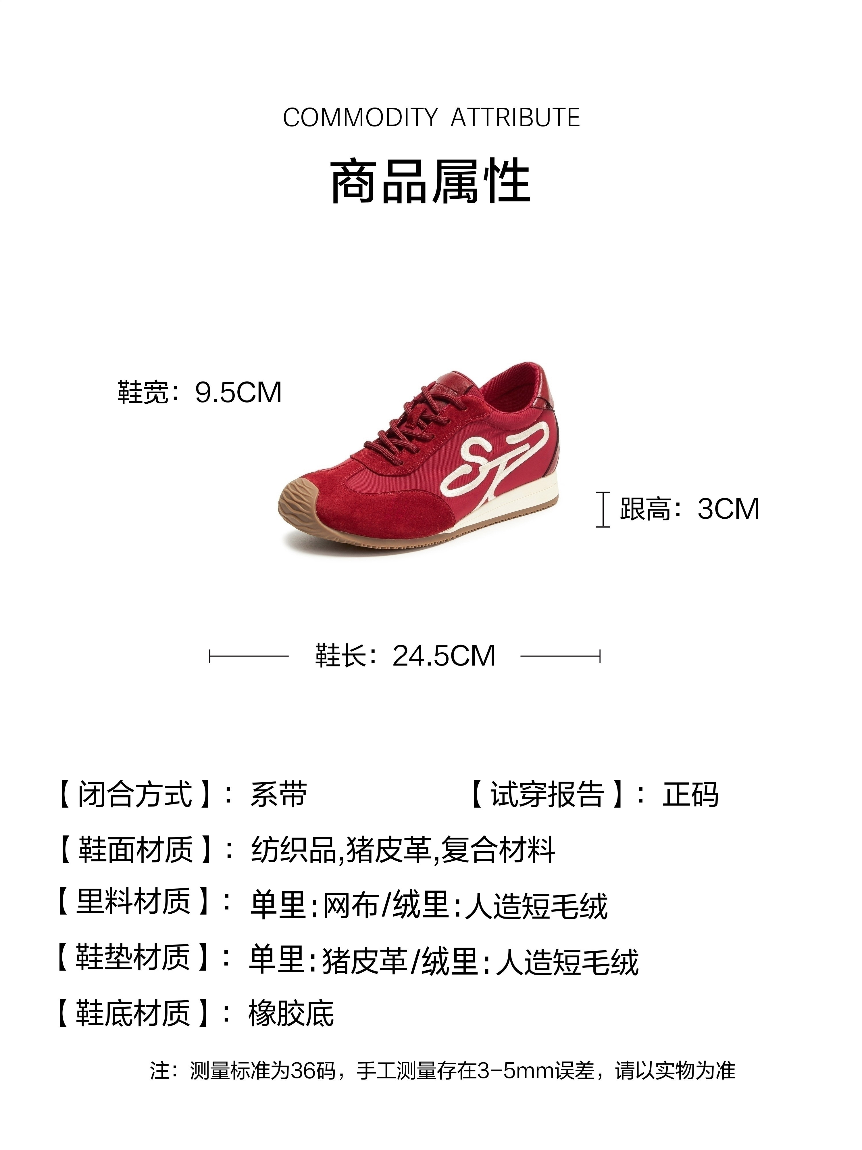 | 鞋跟形状:厚底 | 鞋面材质:复合材料猪皮革纺织品 | 参考鞋长(女):24.5CM | 参考鞋宽(女):9.5CM | 闭合方式:系带 |