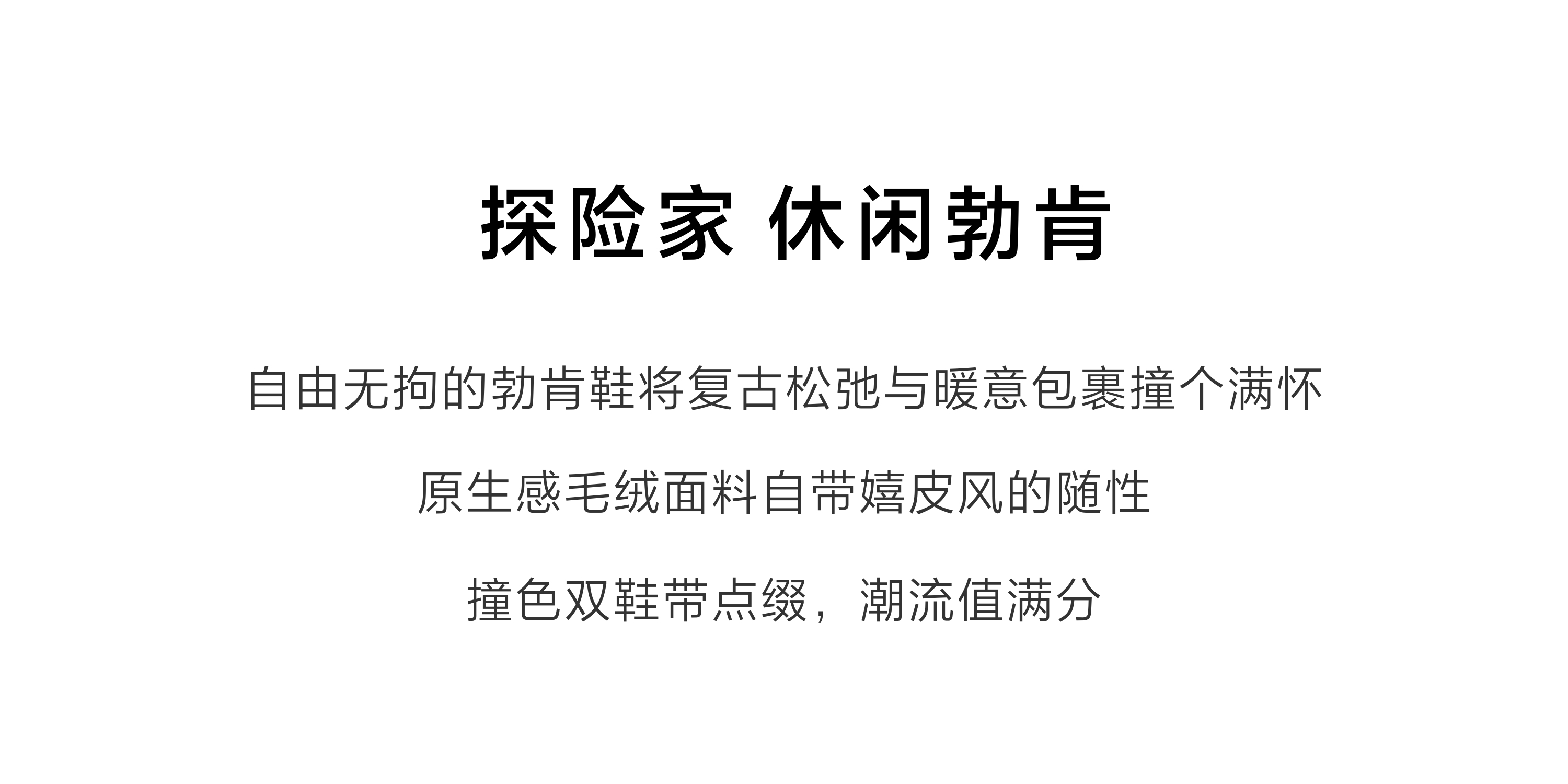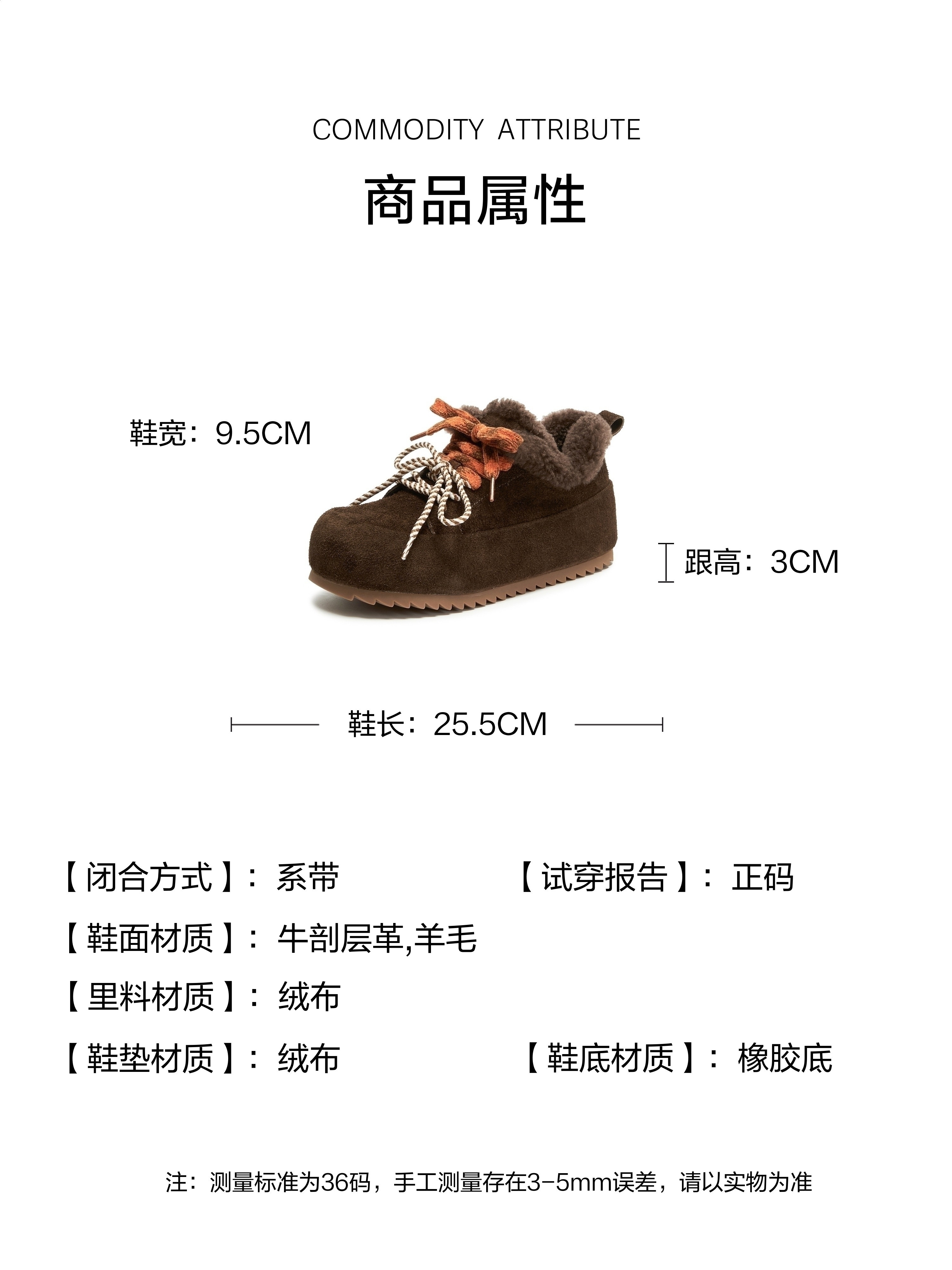 | 鞋帮:低帮 | 鞋底材质:橡胶底 | 靴筒内里材质:人造毛绒 | 内增高:无 | 鞋面材质:羊毛牛剖层革 |