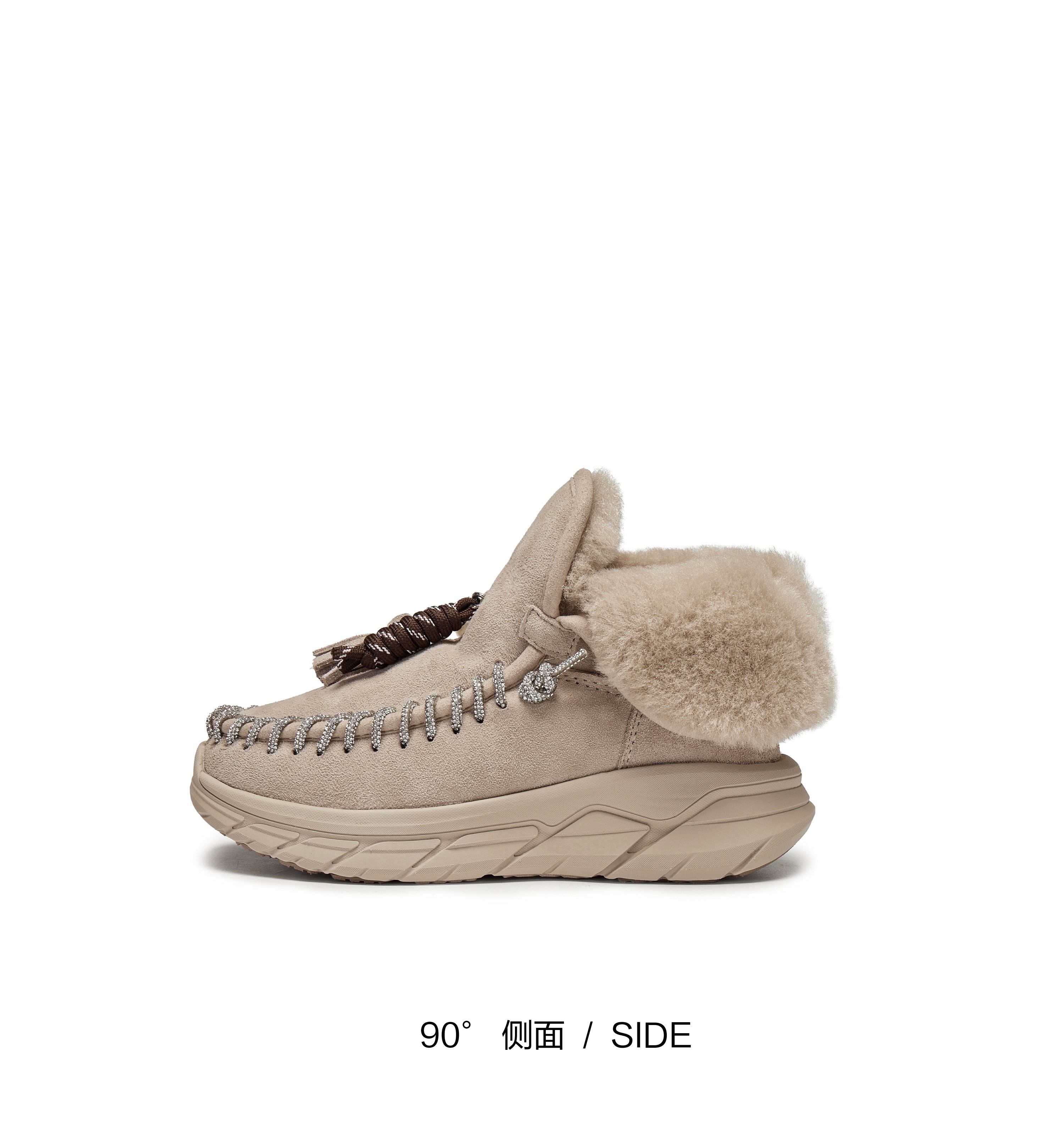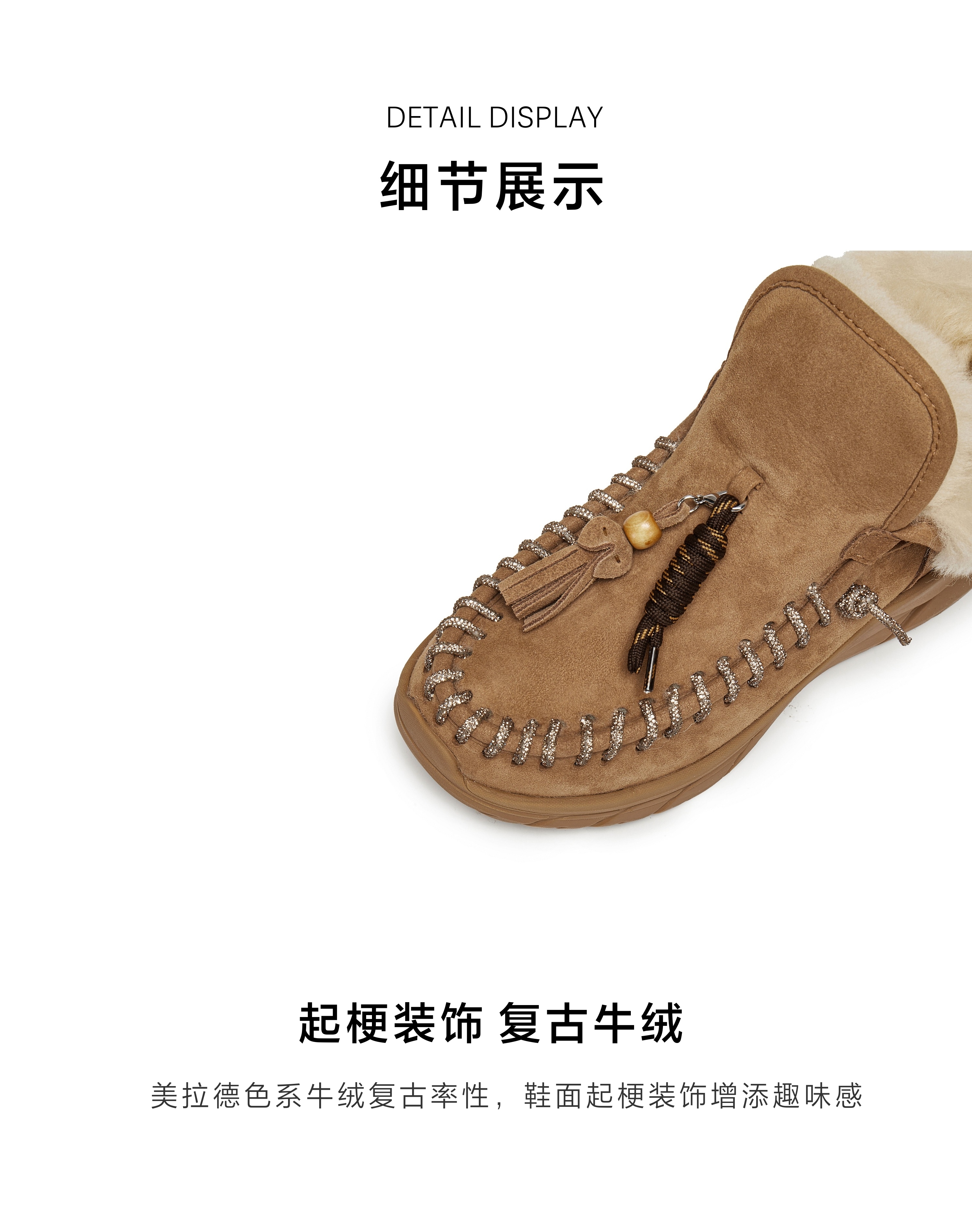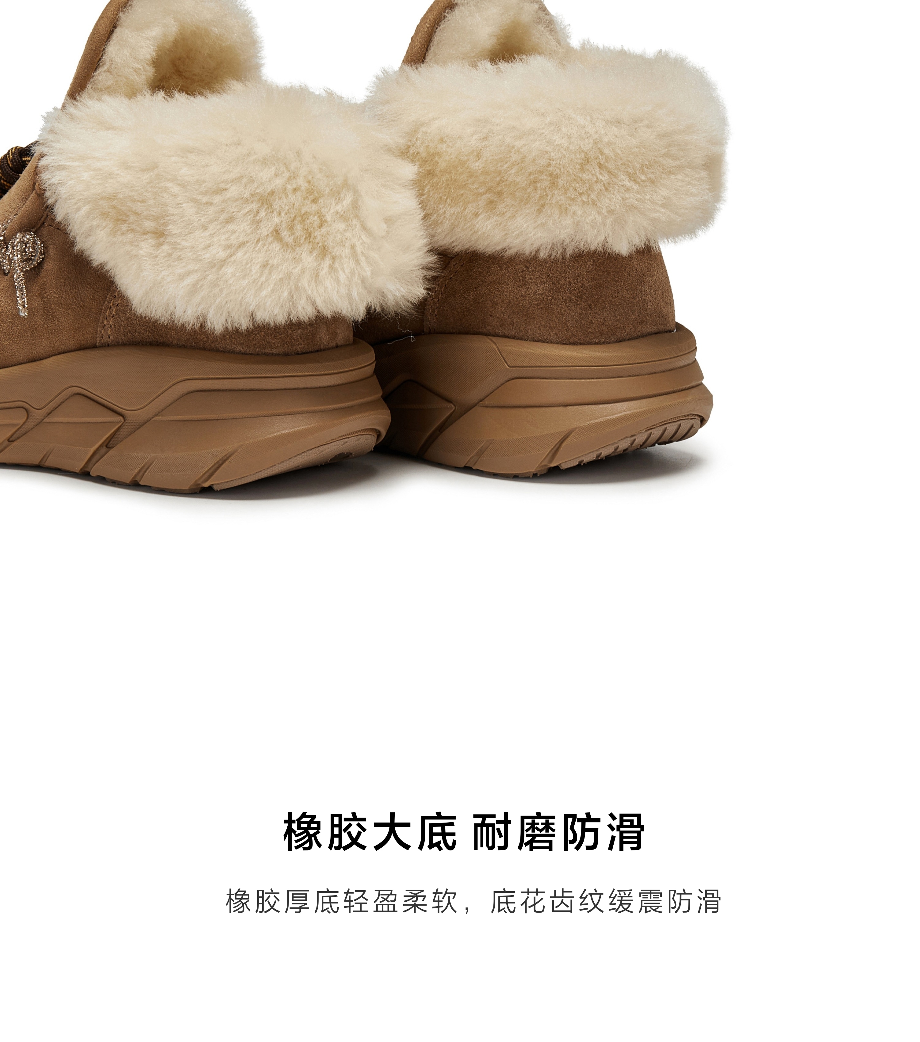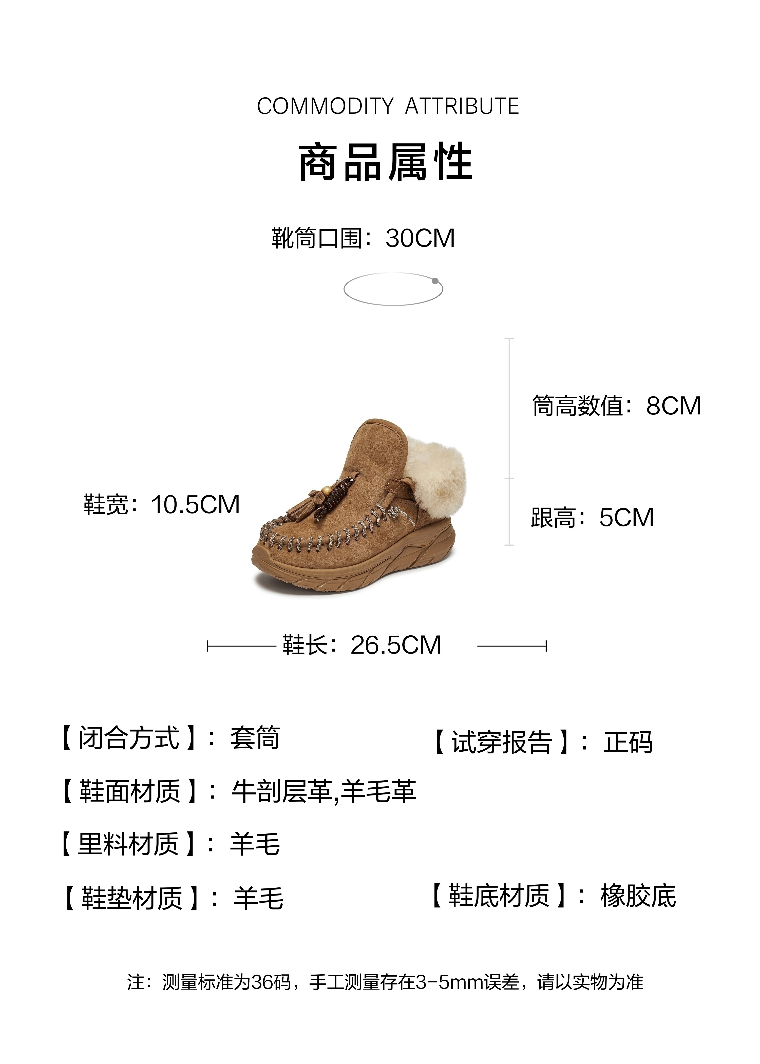 | 帮面材质:羊毛革牛剖层革 | 配跟:无 | 靴筒口围:30CM | 上市时间:2025年冬季 | 鞋类流行款式:雪地靴 |