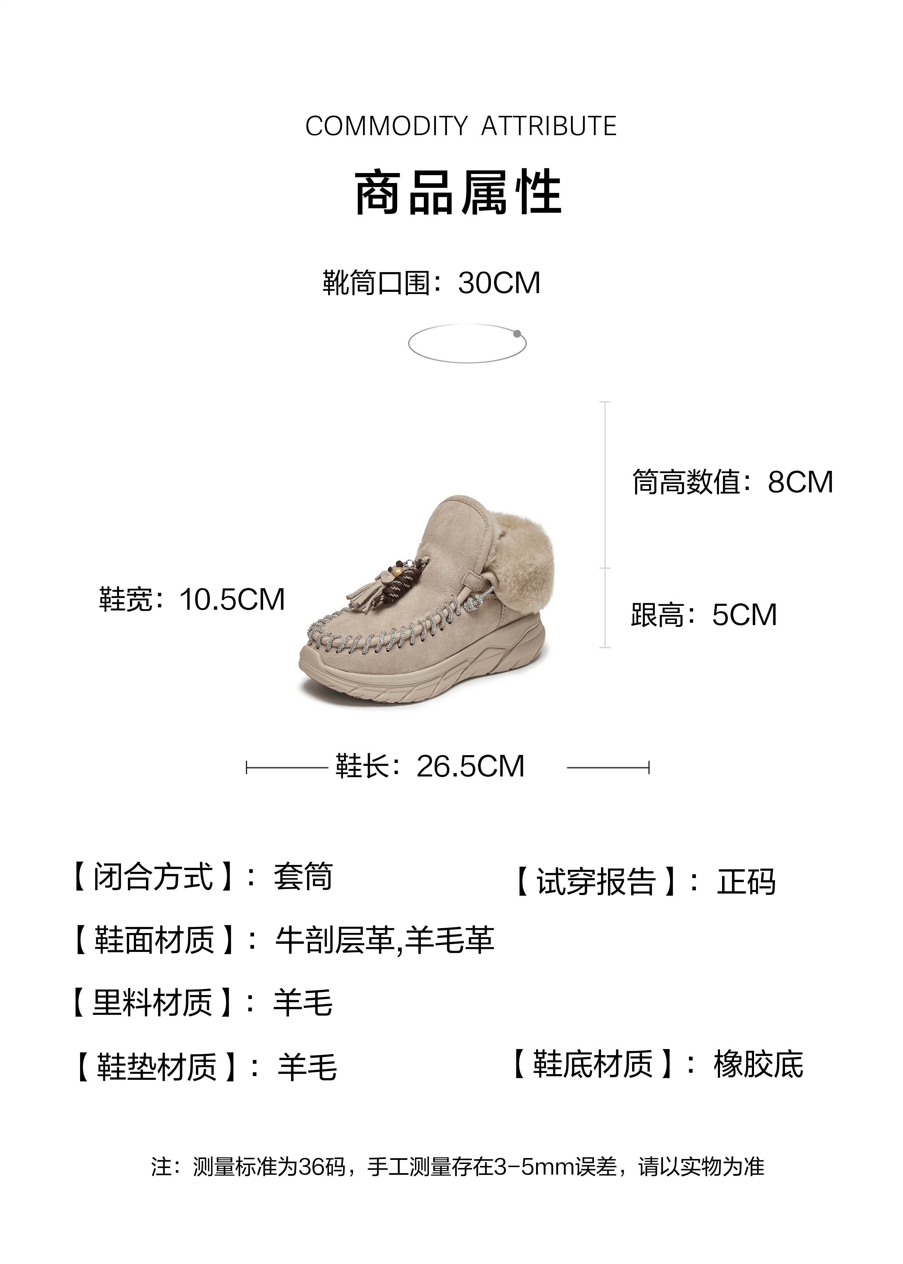 | 参考鞋宽(女):10.5CM | 风格:时尚潮流 | 鞋面内里材质:羊毛 | 色系:杏色 | 跟高数值:5CM |
