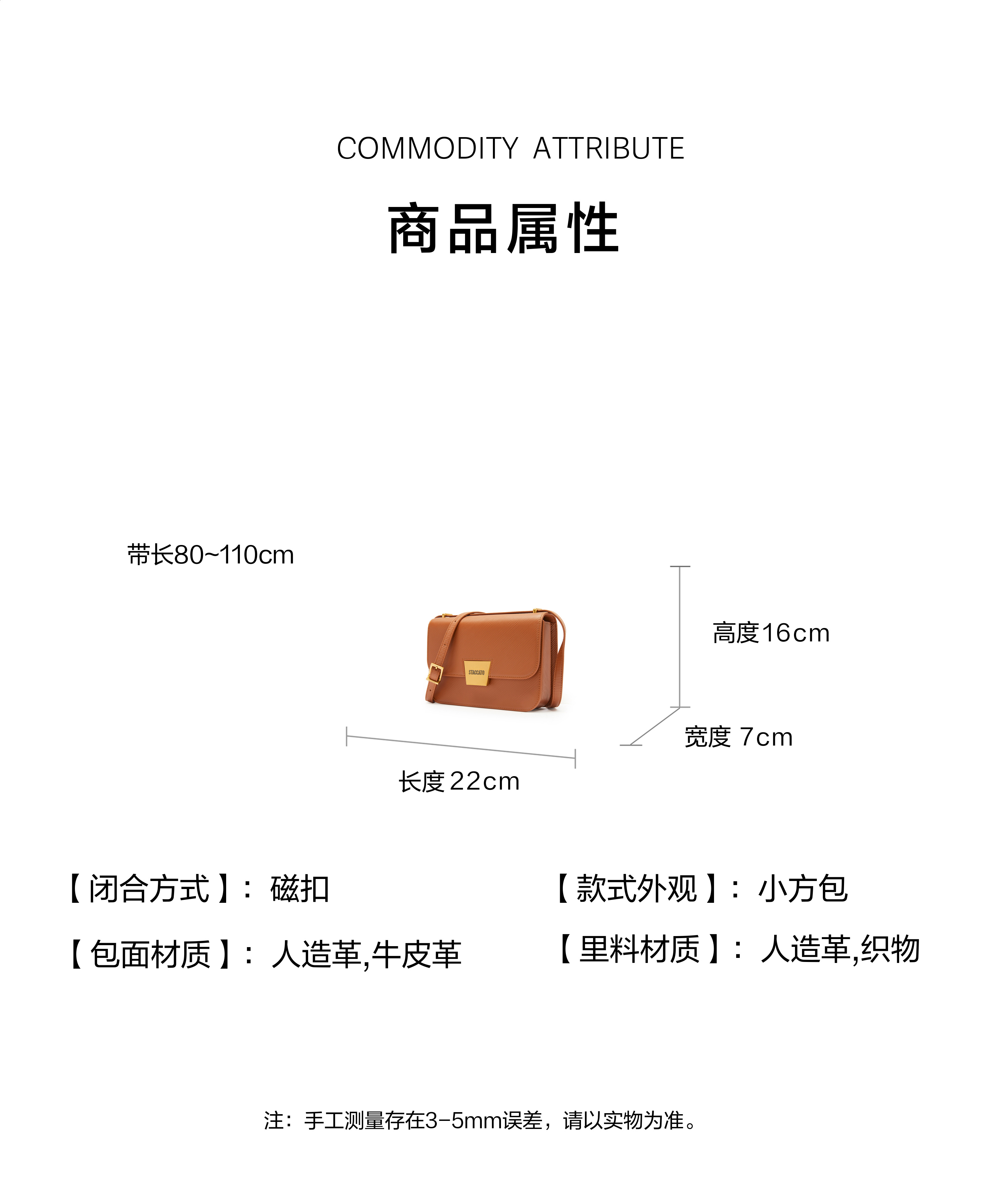 | 流行款式名称:小方包 | 开袋方式:磁扣 | 性别:女子 | 里料材质:人造革织物 | 手柄高:无 |