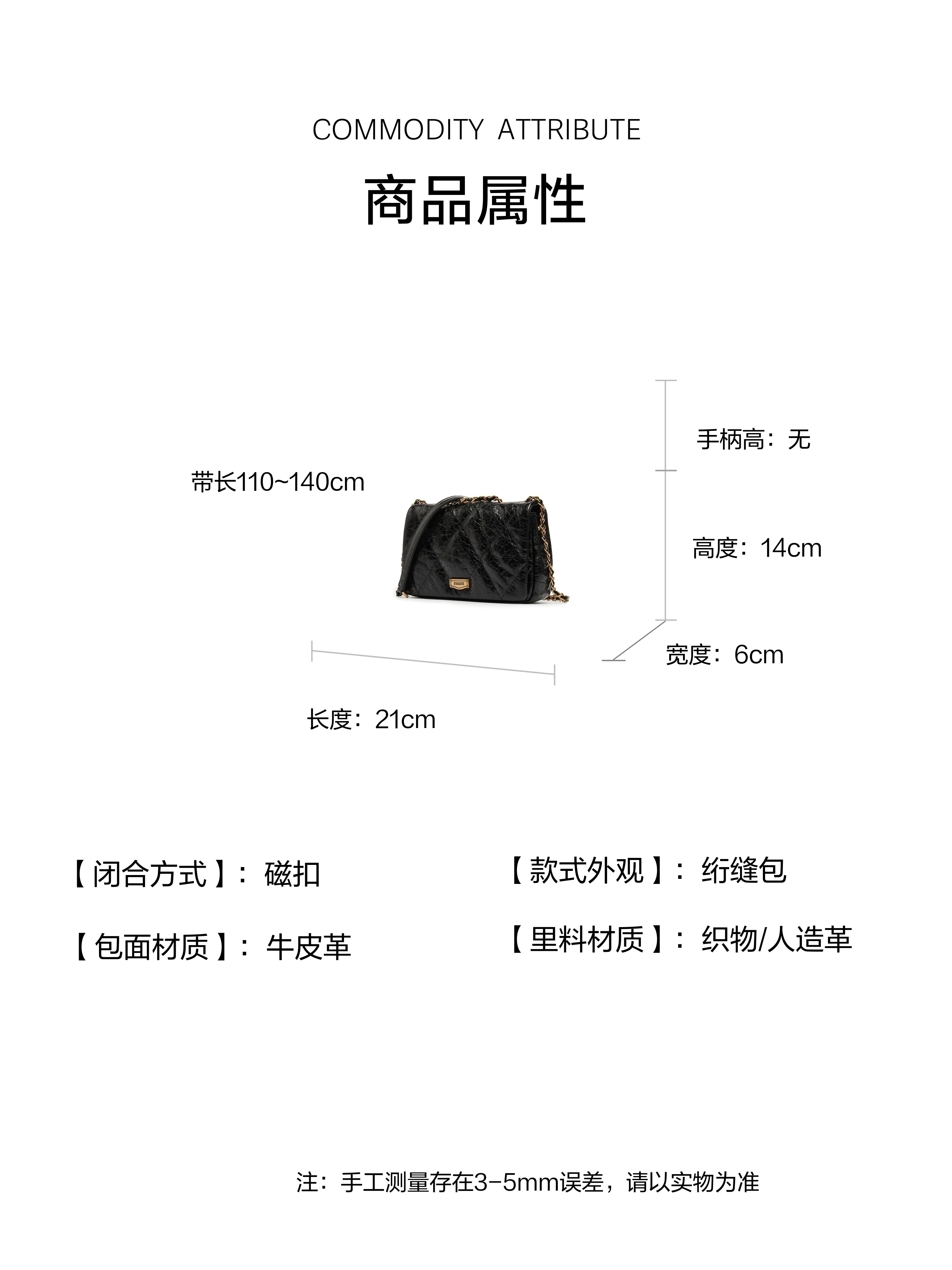 | 流行元素:车缝菱格 | 包的规格:21cm*6cm*14cm | 内部结构:卡位 | 背带方式:单肩/斜挎 | 风格:时尚潮流 |