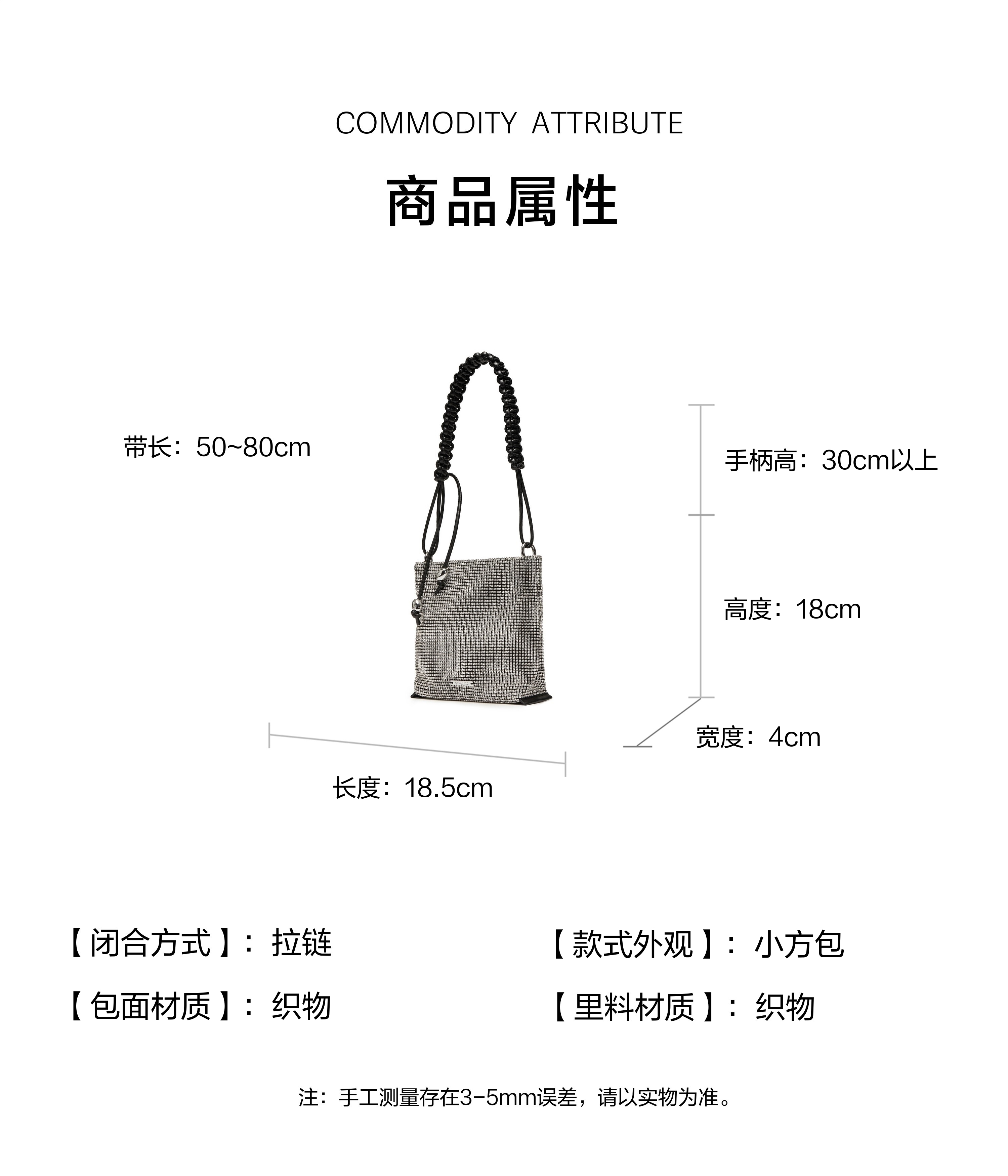 | 肩带样式:2根 | 手柄:有 | 带长:50~80cm | 流行元素:编织闪钻 | 可否折叠:否 |