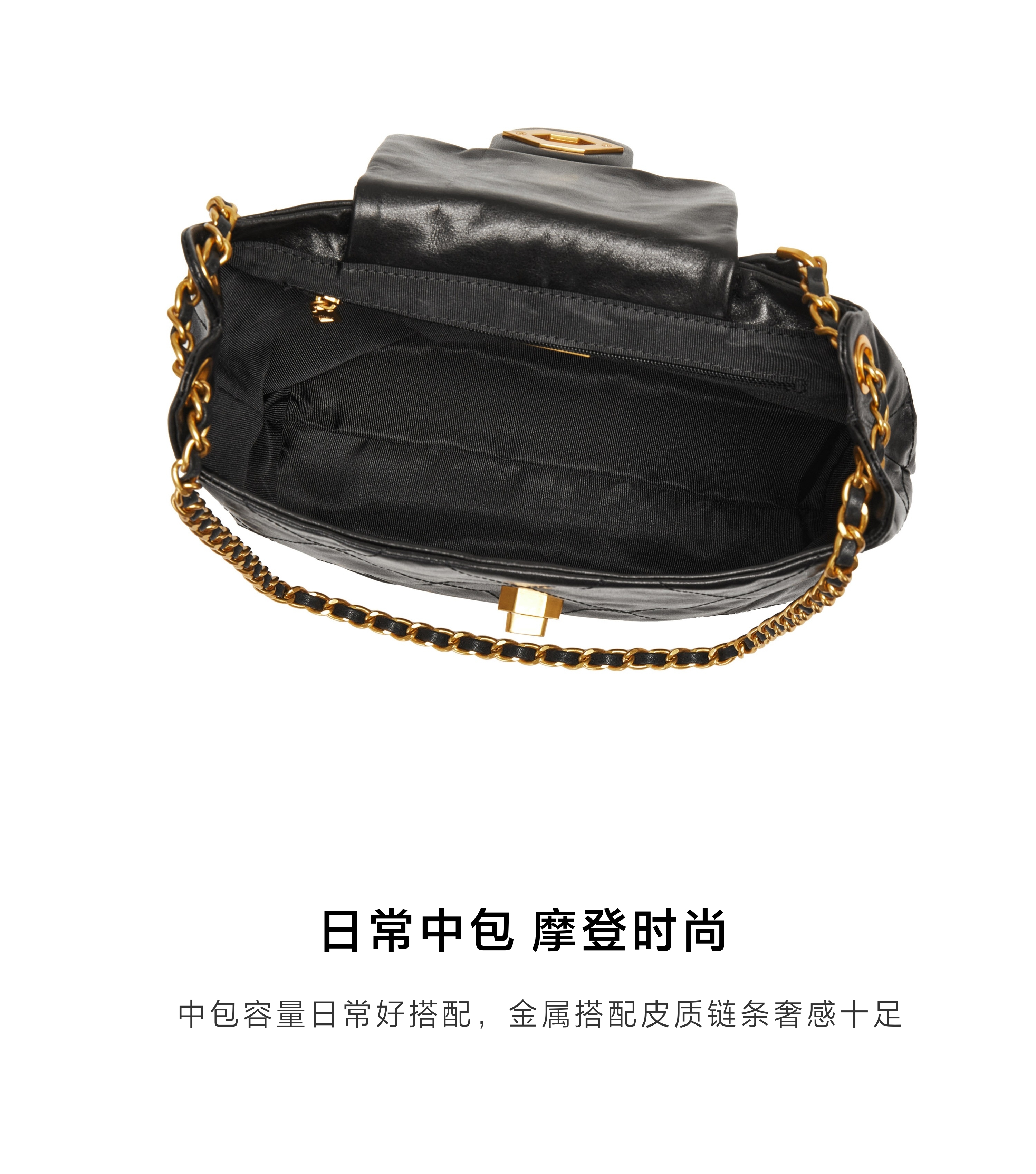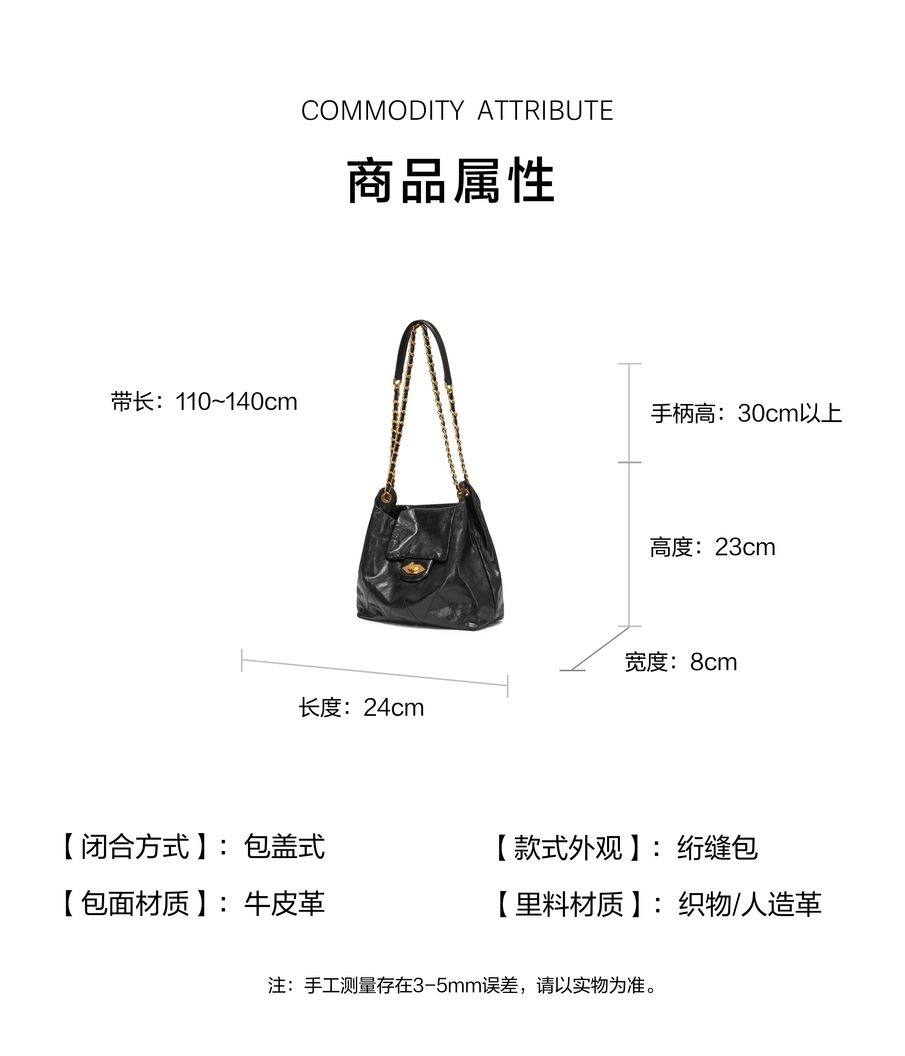 | 包的规格:24cm*8cm*23cm | 闭合方式:包盖式 | 背带方式:单肩/斜挎 | 风格:时尚潮流 | 色系:黑色 |