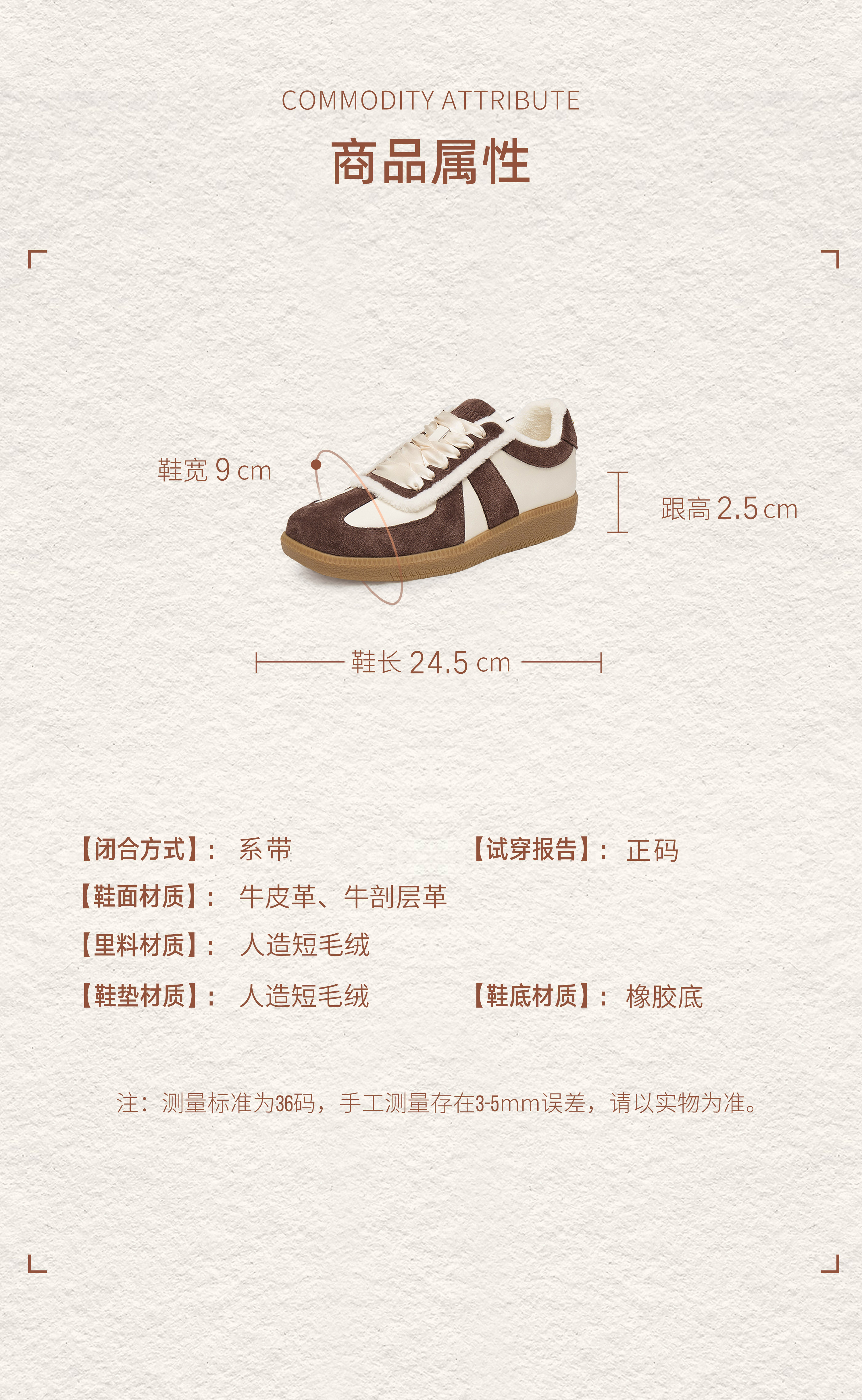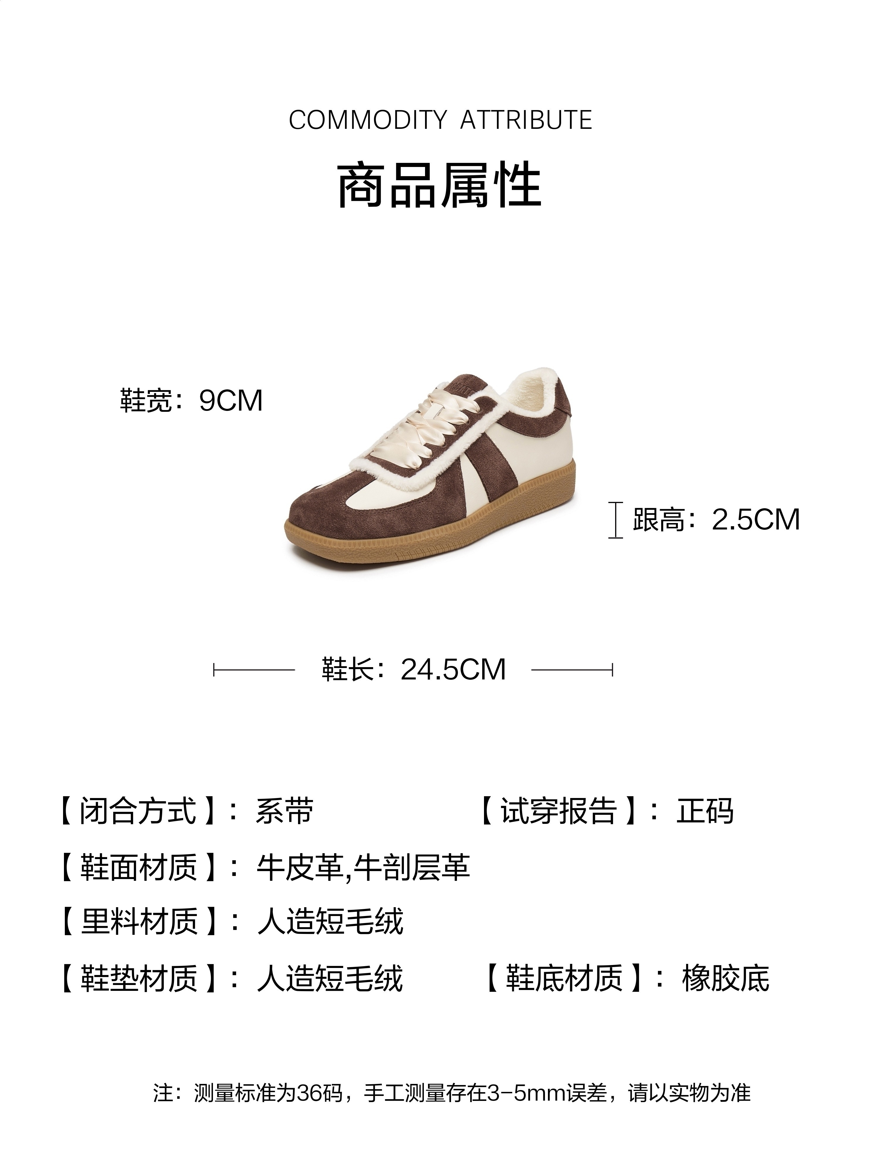 | 色系:棕色 | 参考标准尺码:36码 | 跟高数值:2.5CM | 性别:女子 | 里料材质:人造短毛绒 |