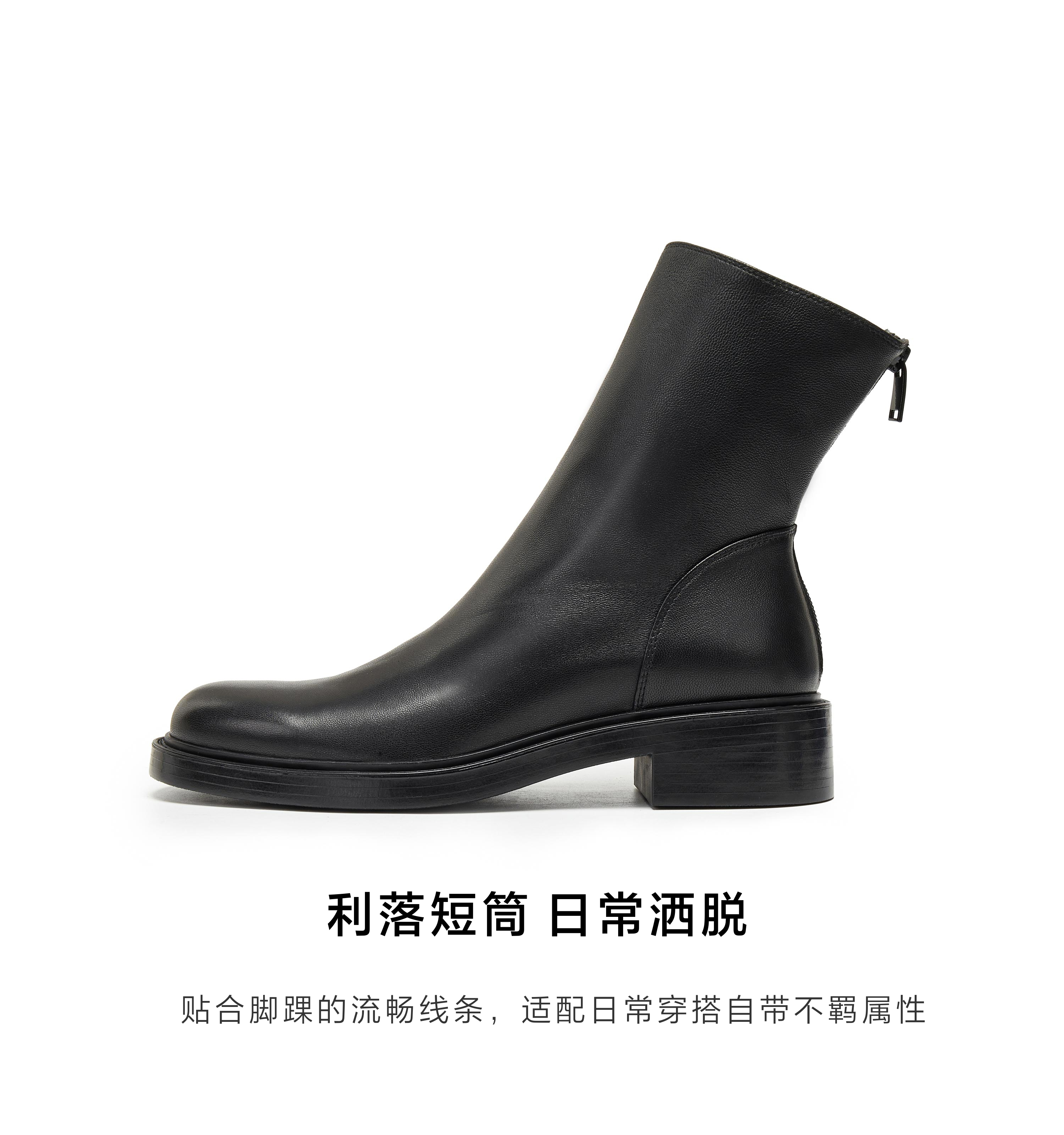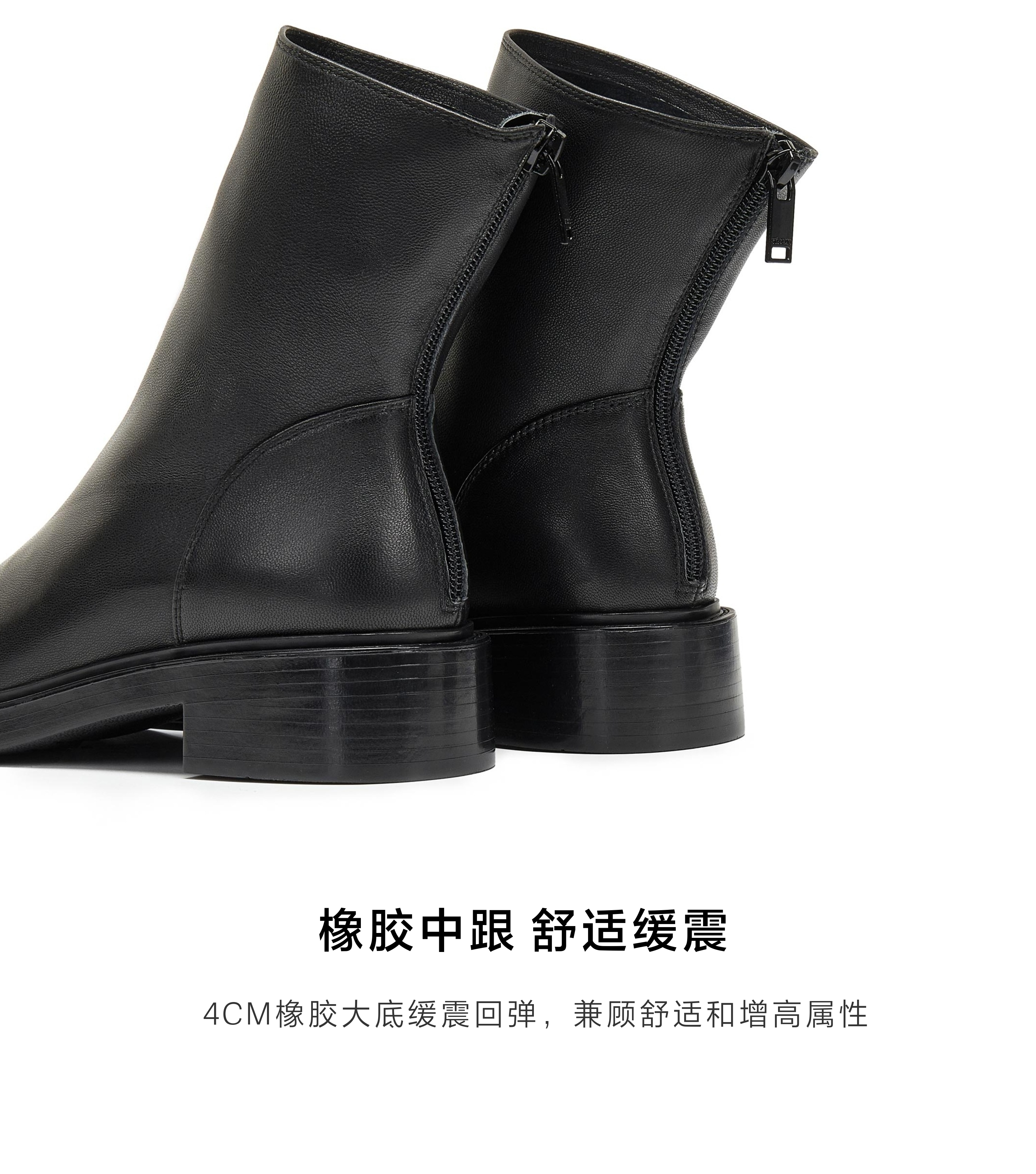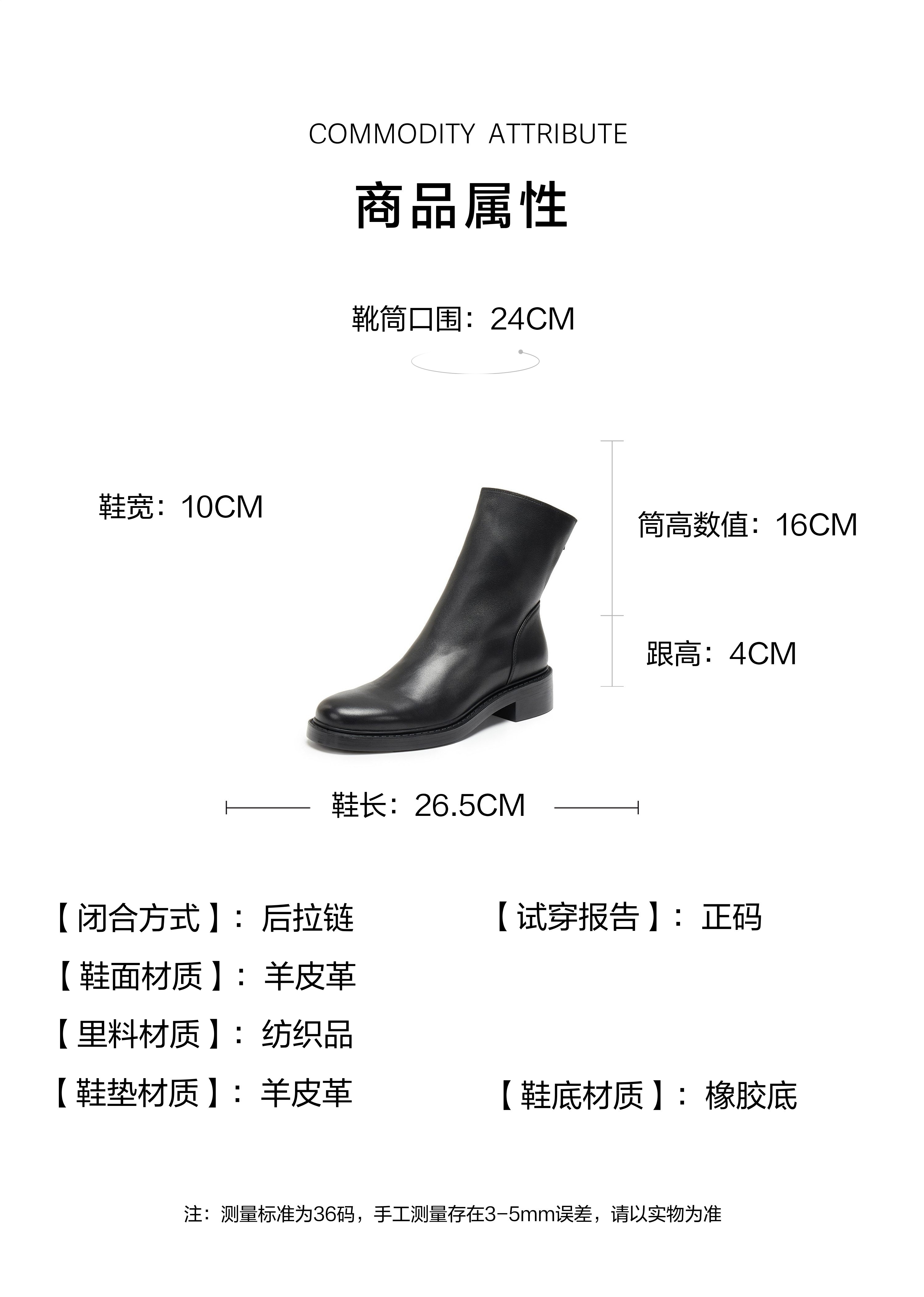 鞋底材质:橡胶底 靴筒内里材质:织物 内增高:无 鞋面材质:羊皮革 闭合方式:后拉链