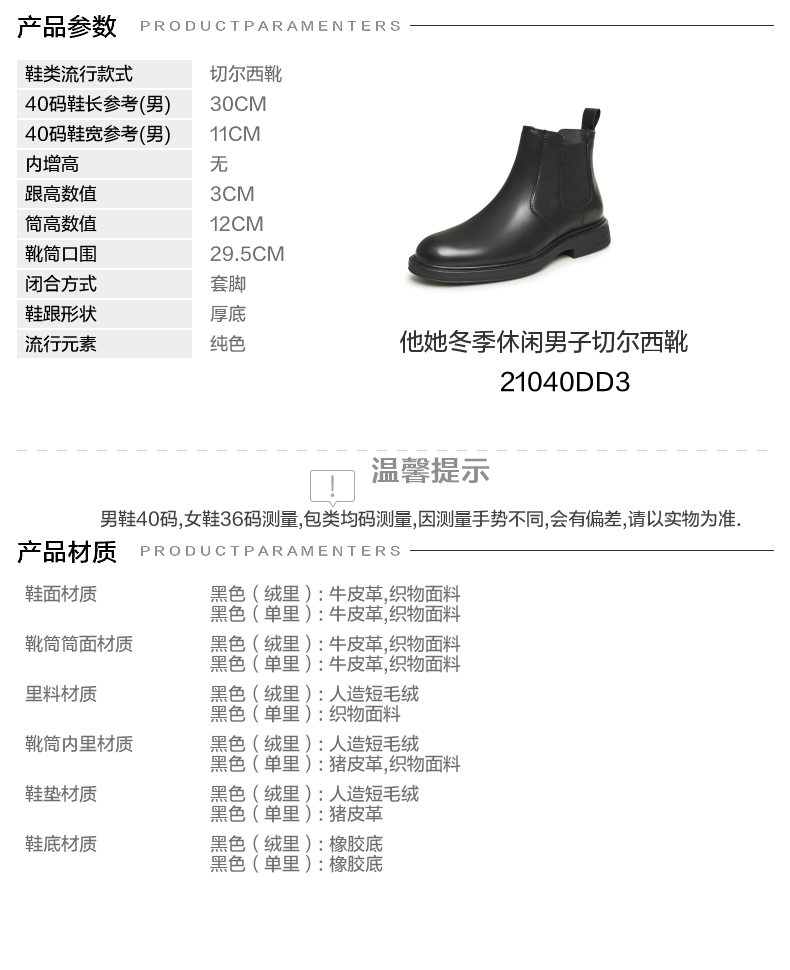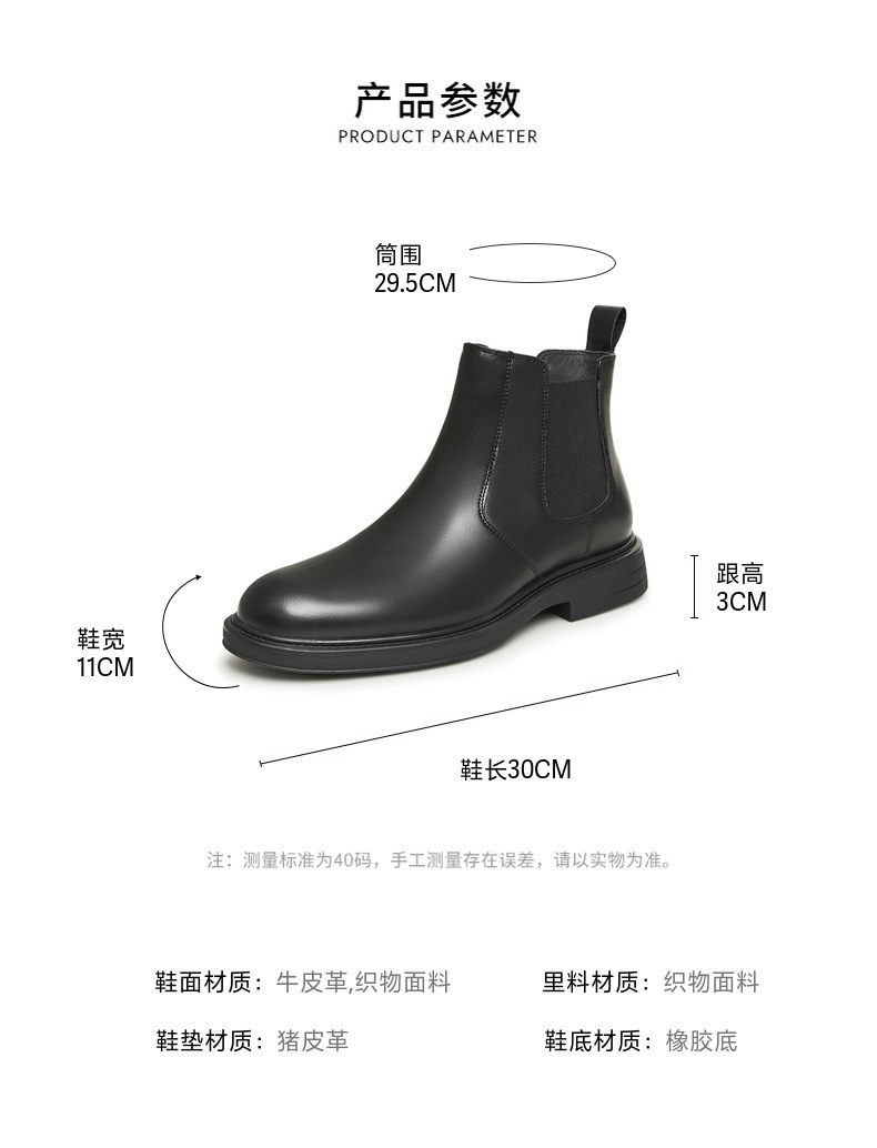 | 闭合方式:套脚 | 40码鞋宽参考(男):11CM | 靴筒口围:29.5CM | 上市时间:2023年冬季 | 鞋类流行款式:切尔西靴 |