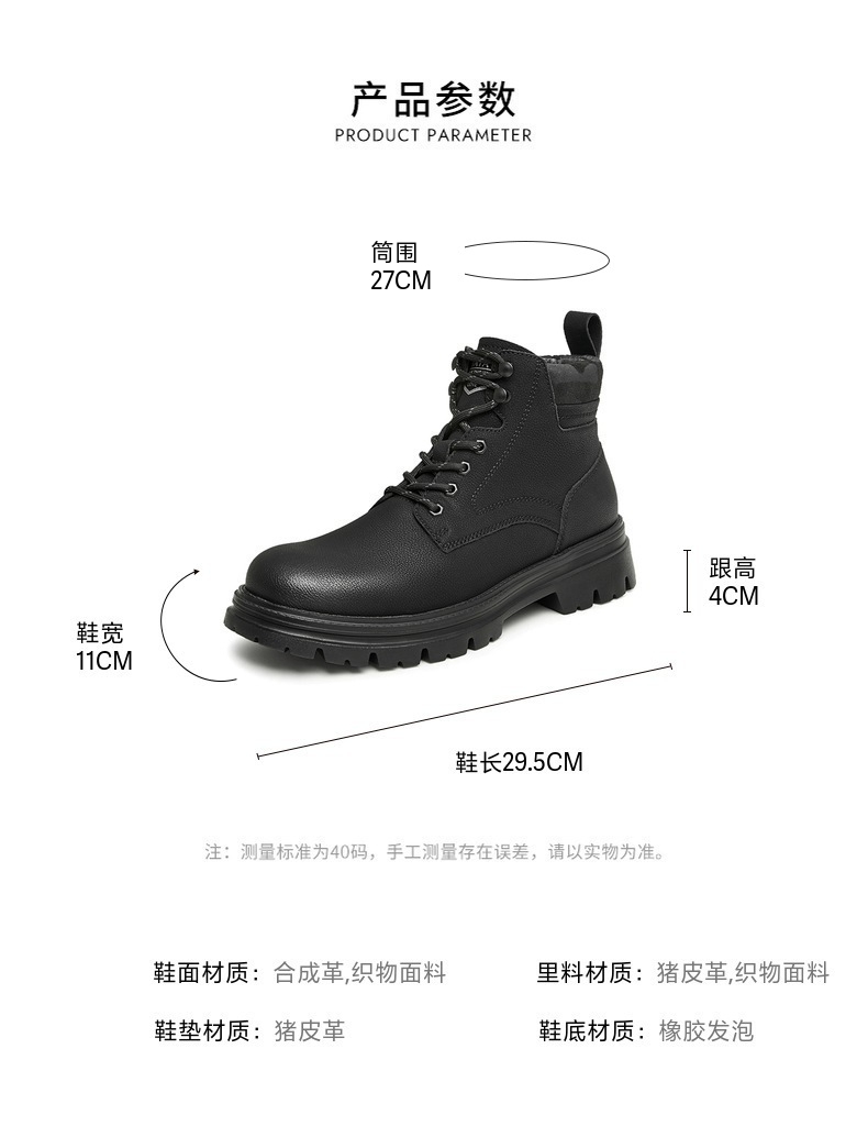 | 闭合方式:套脚套脚 | 40码鞋宽参考(男):11CM11CM | 靴筒口围:27CM27CM | 上市时间:2023年冬季2023年冬季 | 鞋类流行款式:低靴工装靴 |
