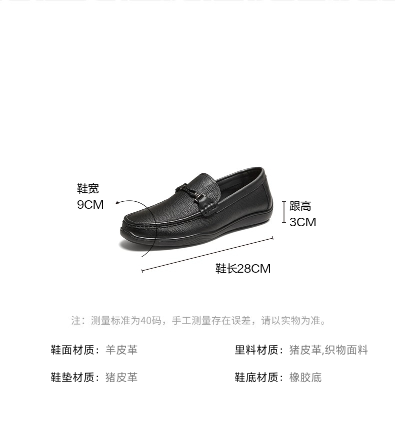 | 风格:休闲 | 色系:黑色 | 跟高数值:3CM | 40码鞋宽参考(男):9CM | 性别:男子 |