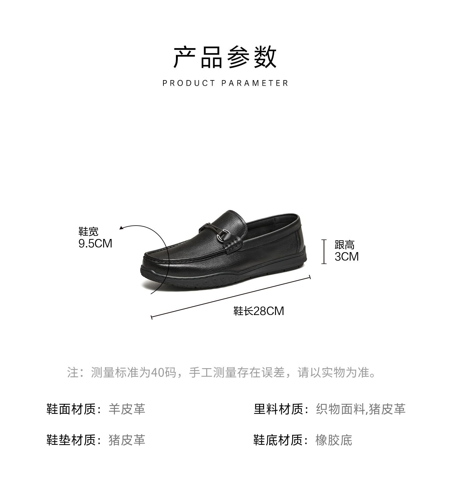 | 风格:休闲 | 鞋面内里材质:猪皮革 | 色系:黑色 | 跟高数值:3CM | 40码鞋宽参考(男):9.5CM |