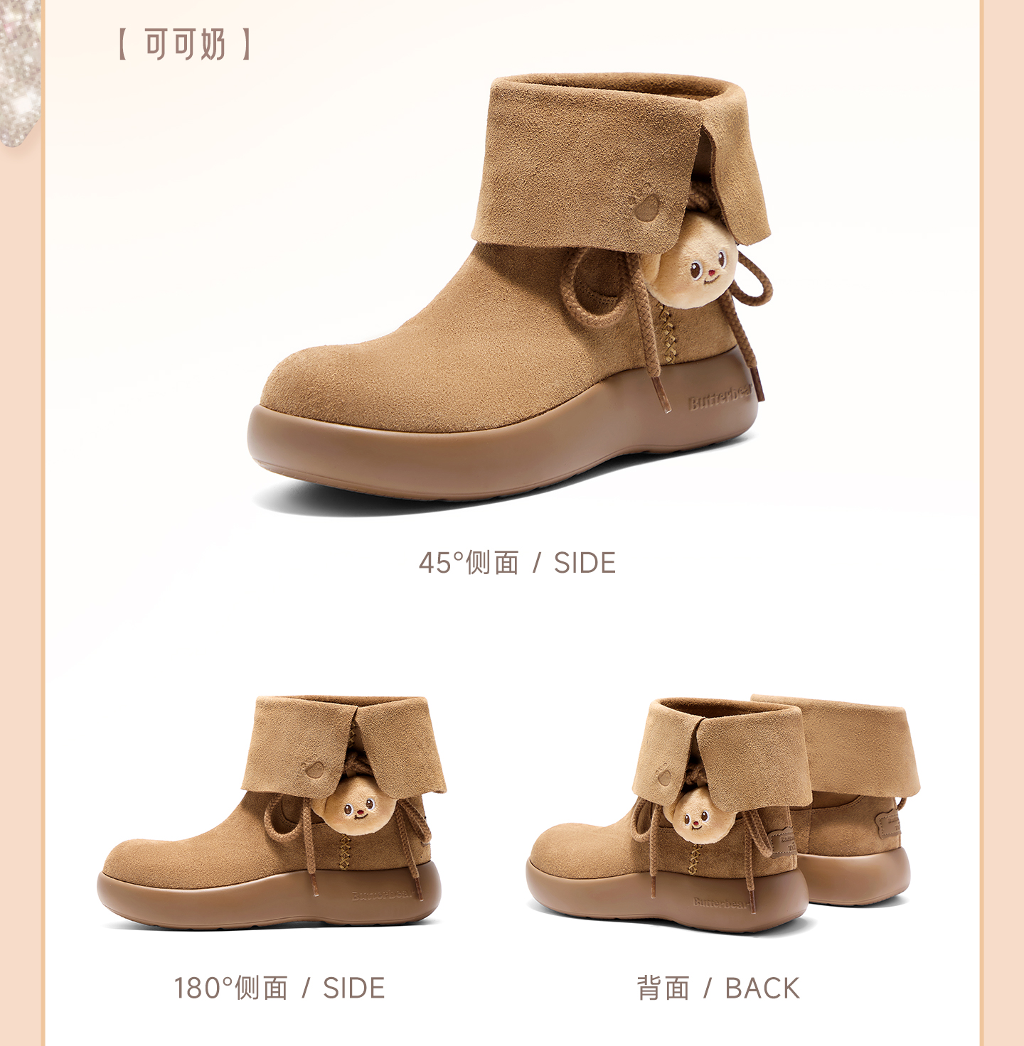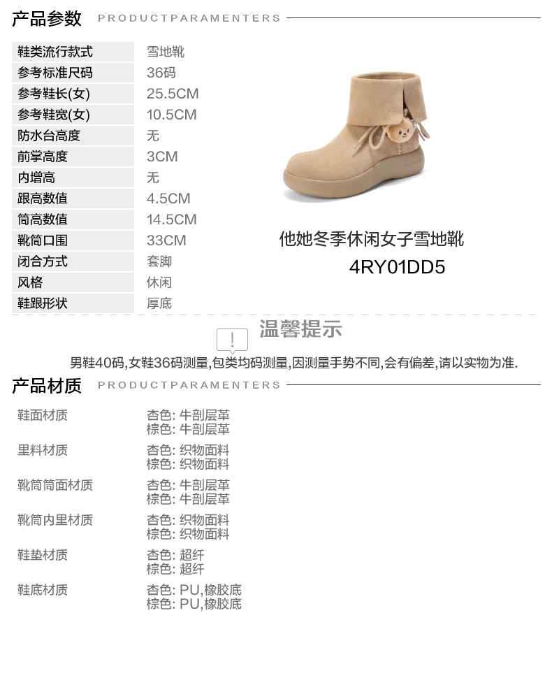 | 帮面材质:牛剖层革 | 配跟:无 | 靴筒口围:33CM | 上市时间:2025年冬季 | 鞋类流行款式:雪地靴 |